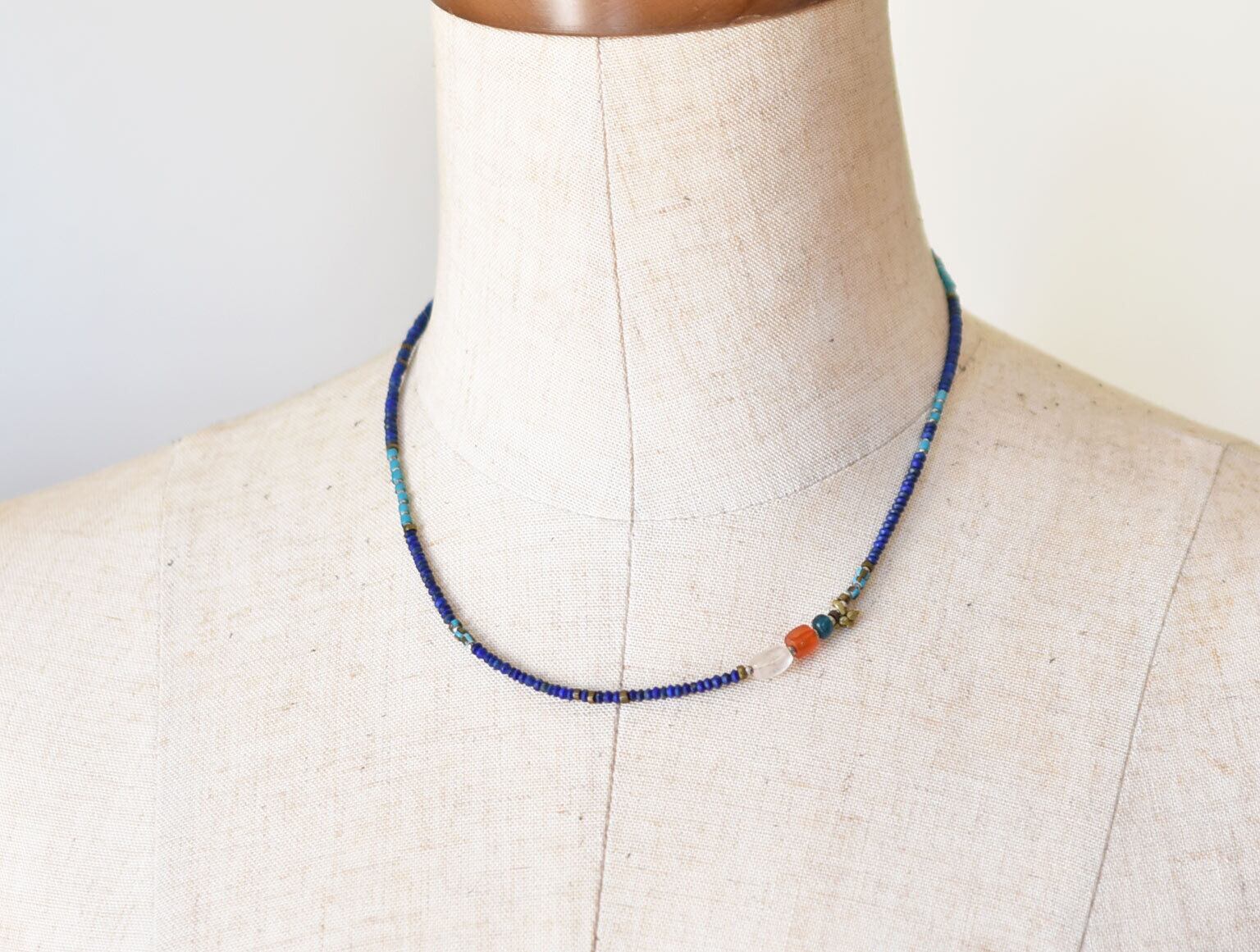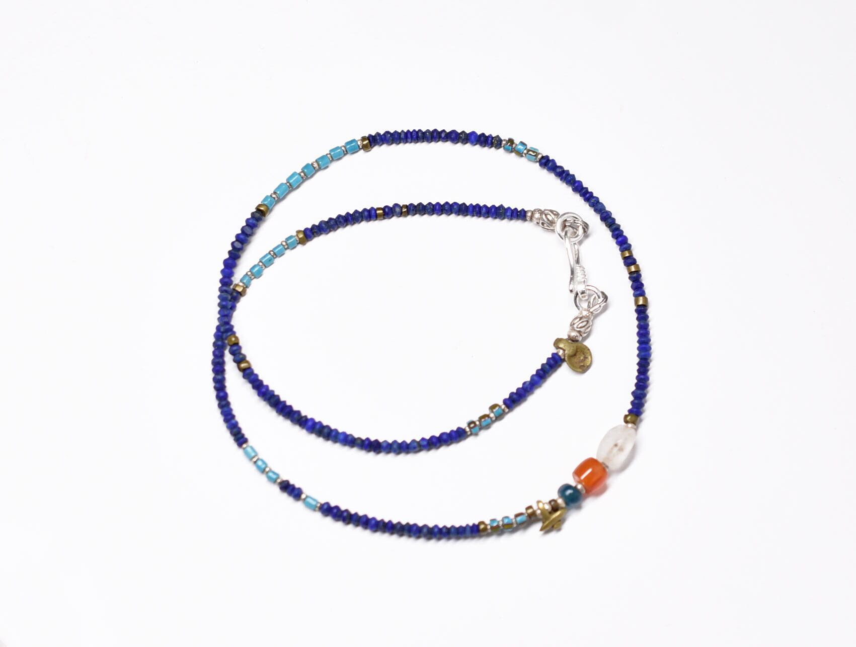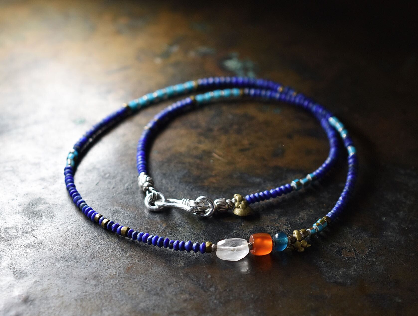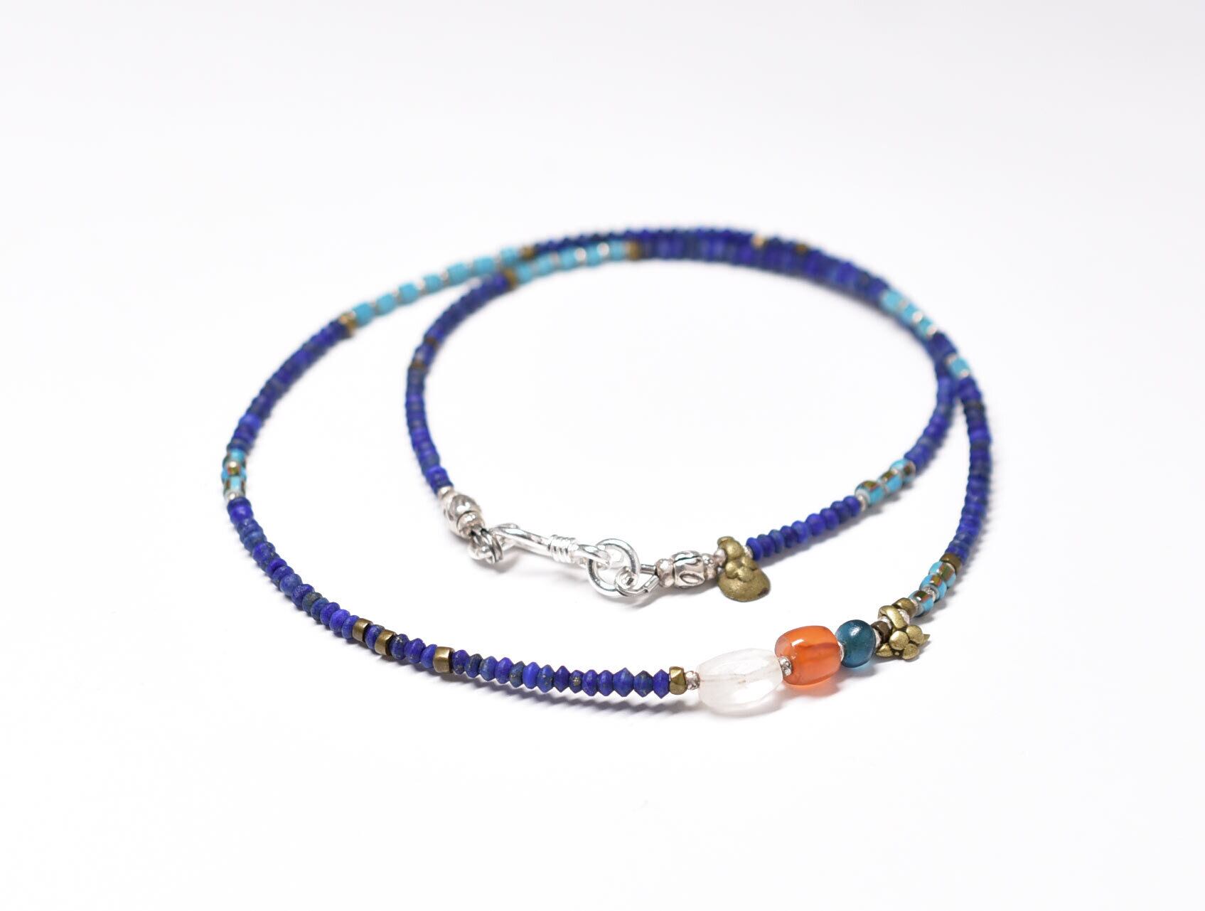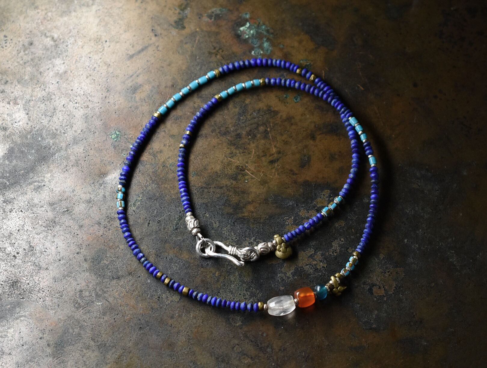古代水晶と古代カーネリアン、ターコイズブルーホワイトハーツ、oldオリッサブラス、ラピスなどを繋いだ華奢なネックレスです。