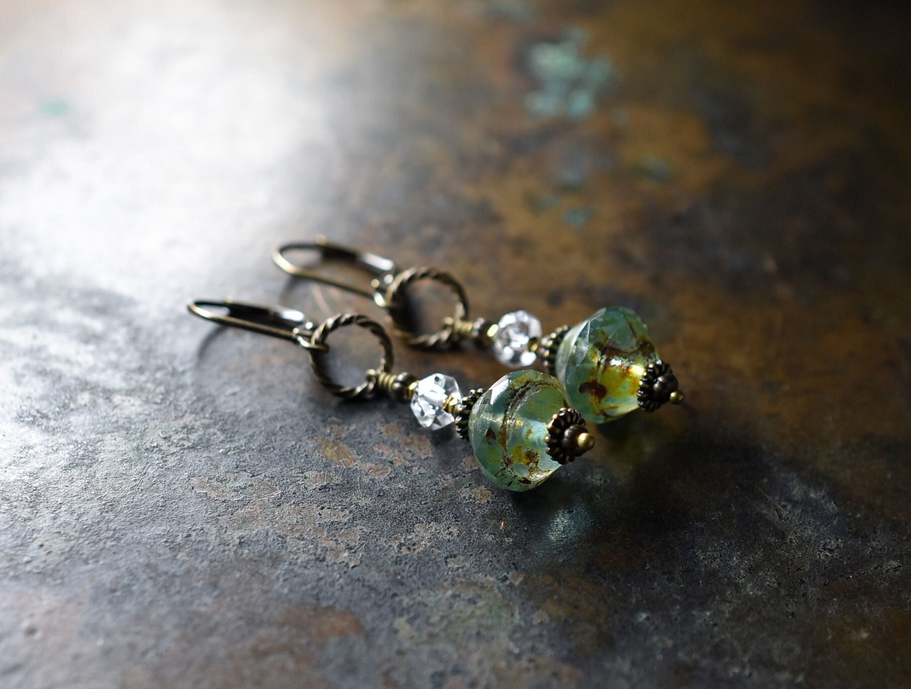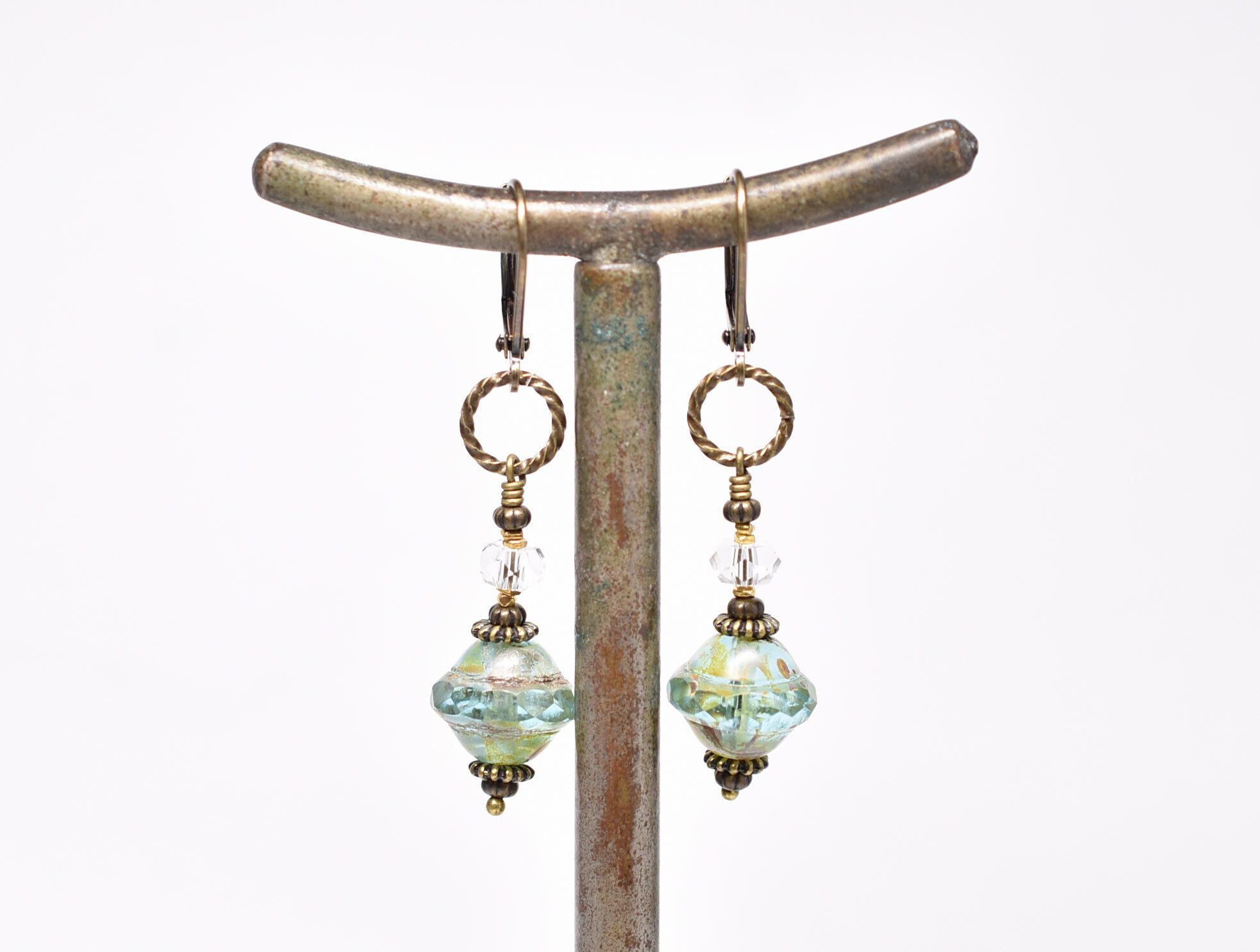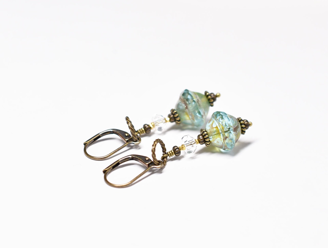 アクアブルーのビーズはチェコ産のビーズです。上下にブロンズカラーの塗料が施されています。