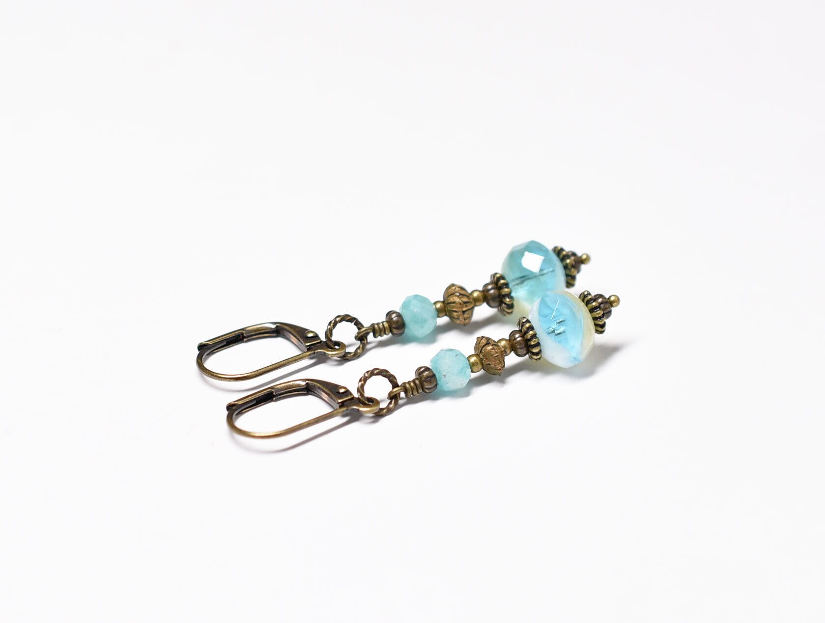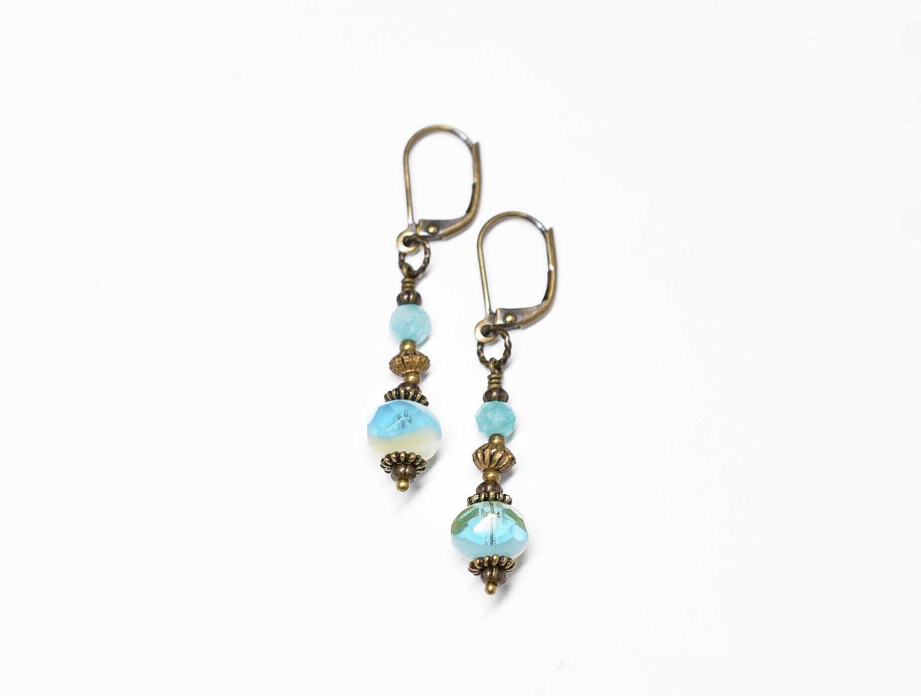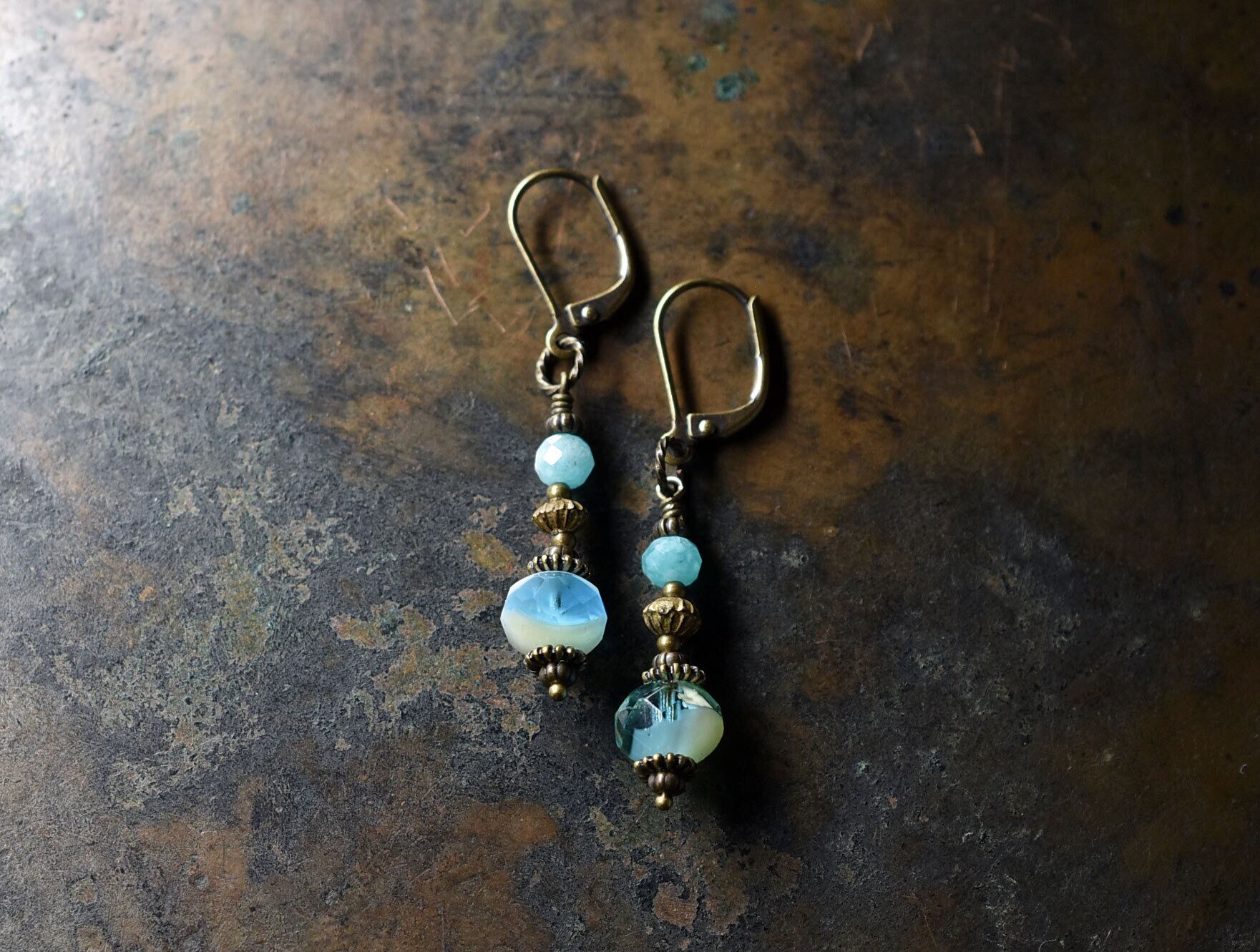 空色ヴィンテージチェコビーズとブラスビーズ、アマゾナイトのピアス