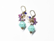 翡翠色チェコビーズとたわわなアメジスト、ルビー、クォーツ、ラピス、白蝶貝の小花を繋いだピアスです。