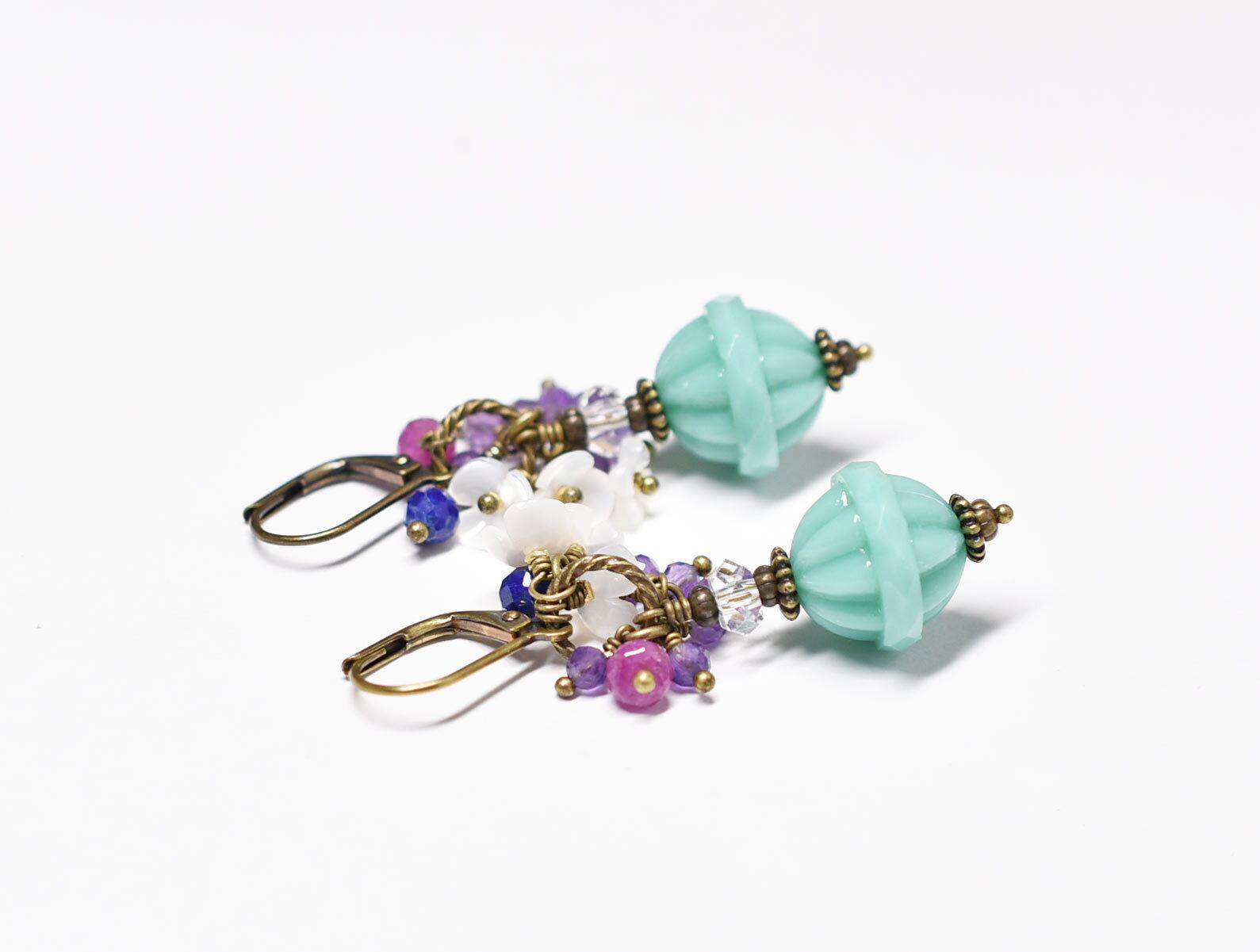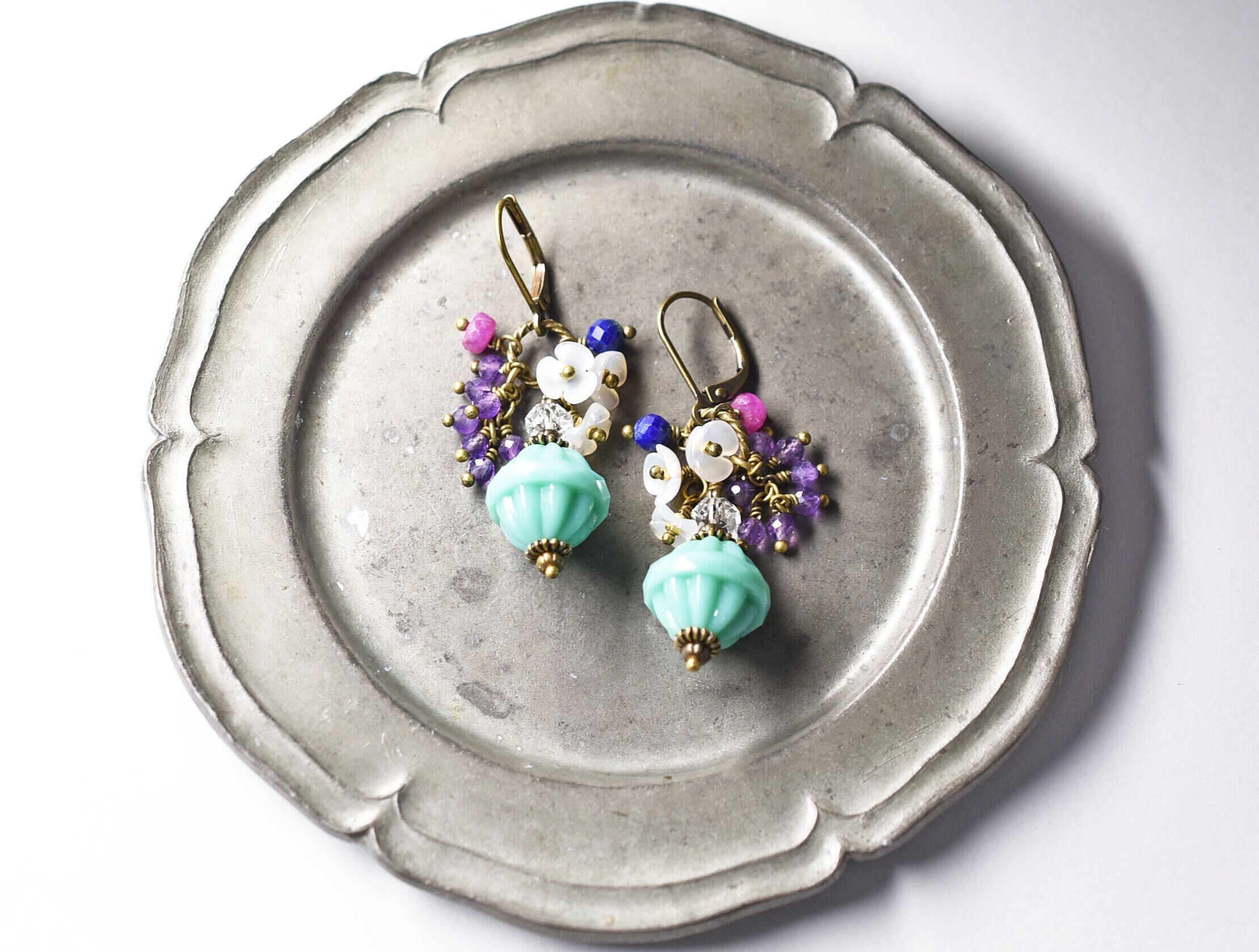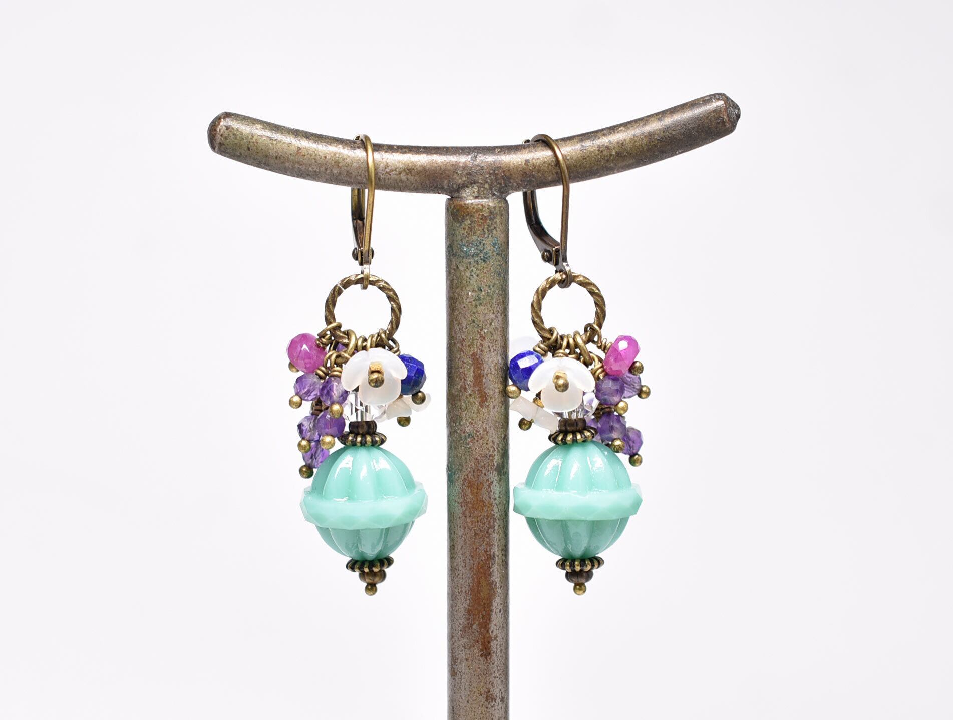 翡翠色チェコビーズとたわわなアメジスト、ルビー、クォーツ、ラピス、白蝶貝の小花のピアス