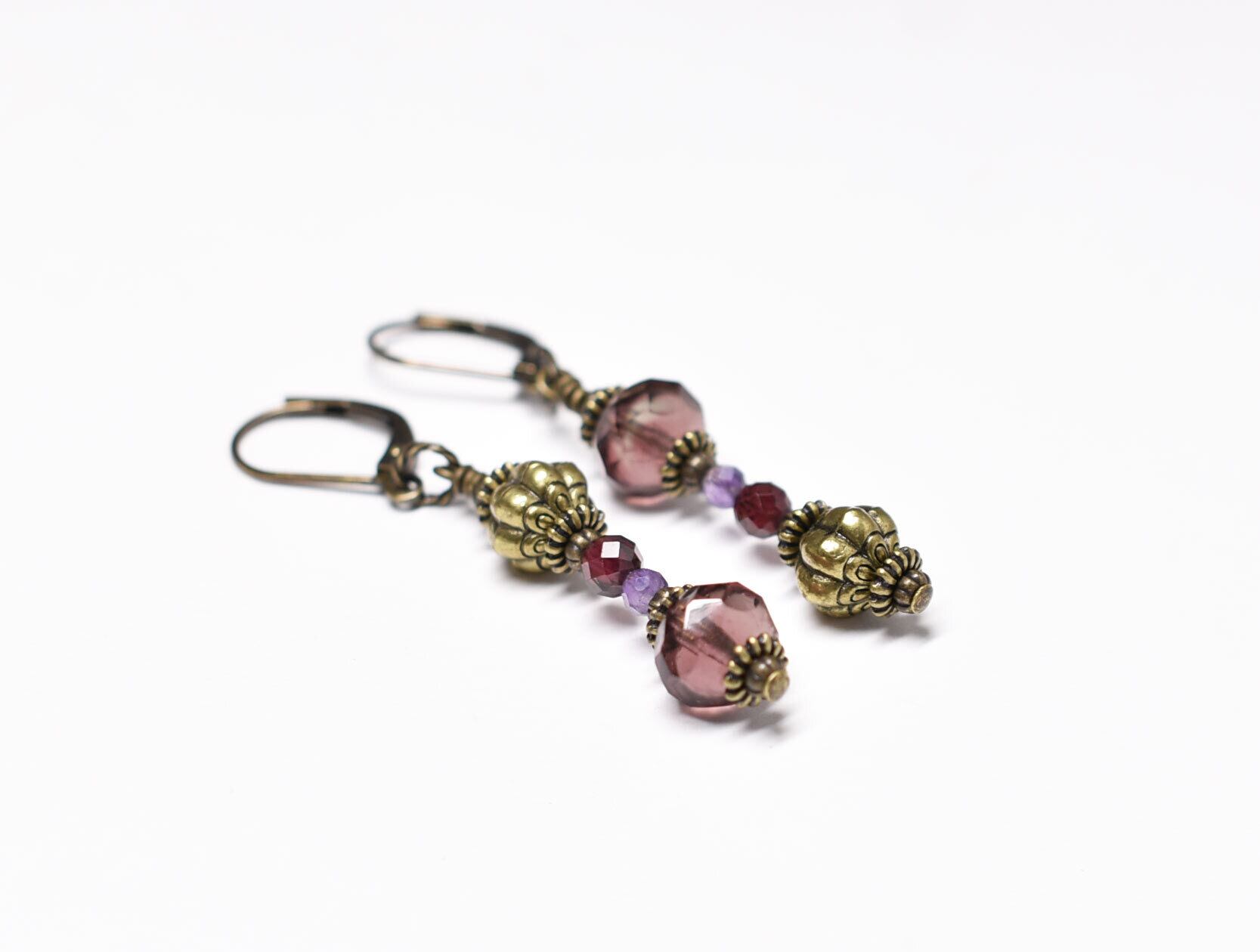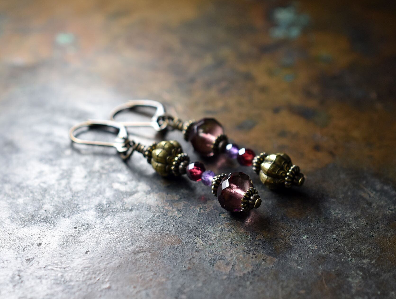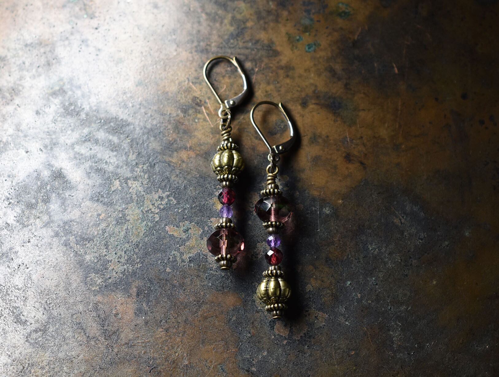 ウランガラスと手毬ブラス、ガーネットとアメジストを繋いだアンシメトリーなピアスです。