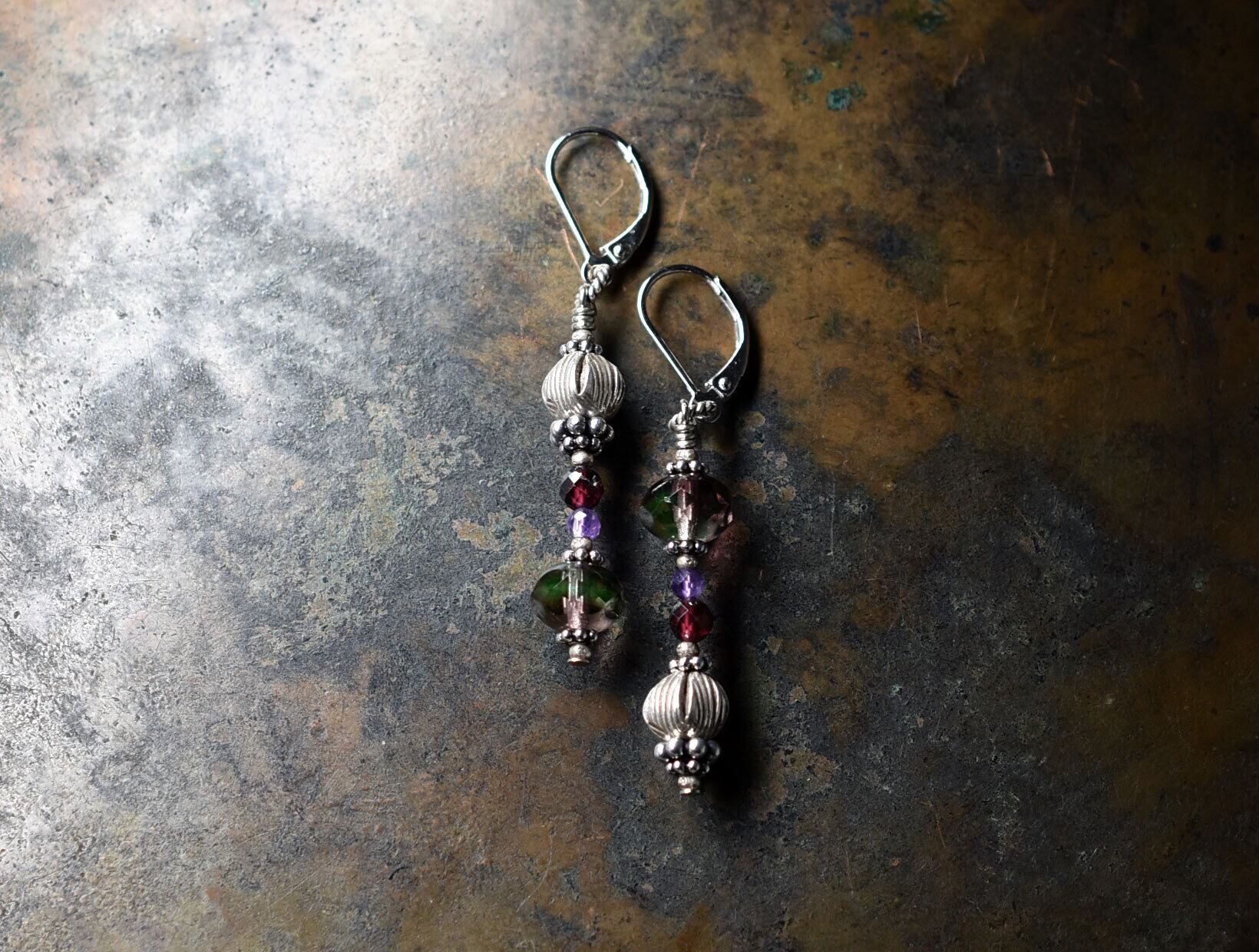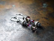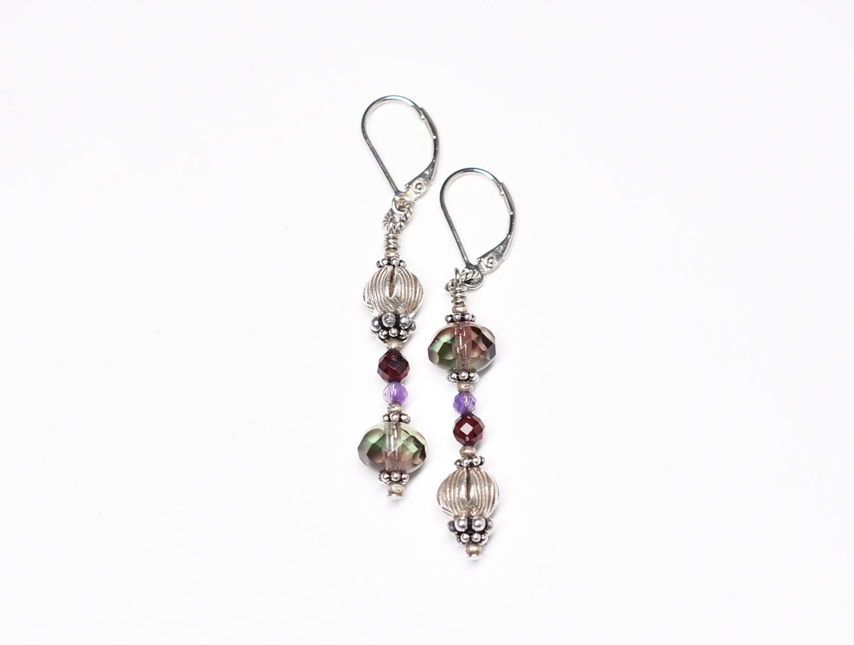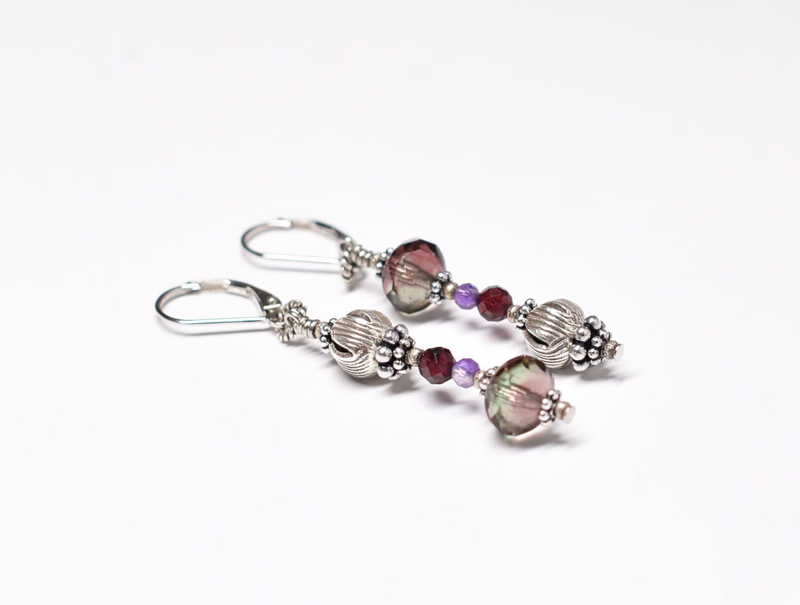 ウランガラスと蕾カレンシルバー、ガーネットとアメジストを繋いだアンシメトリーなピアスです。
