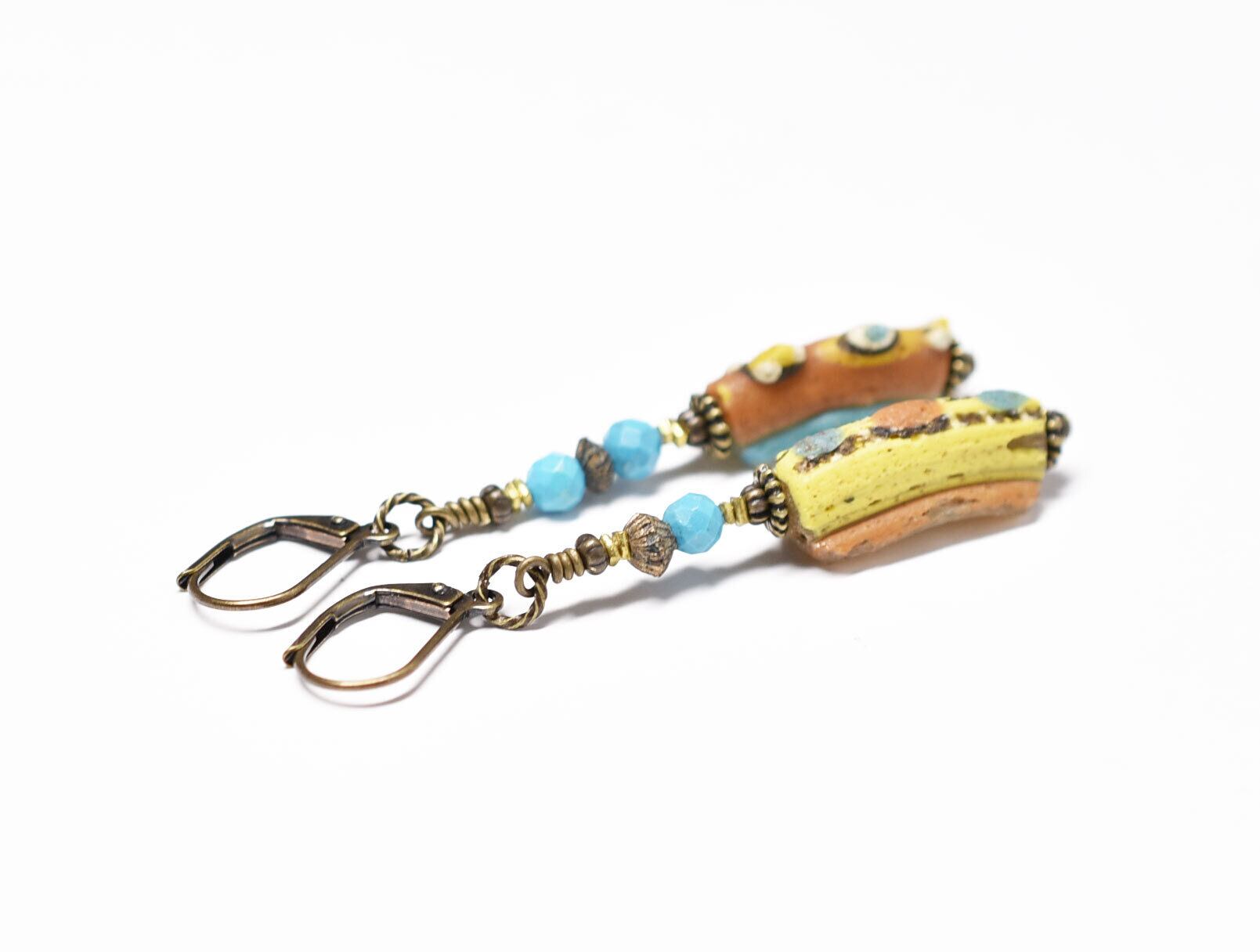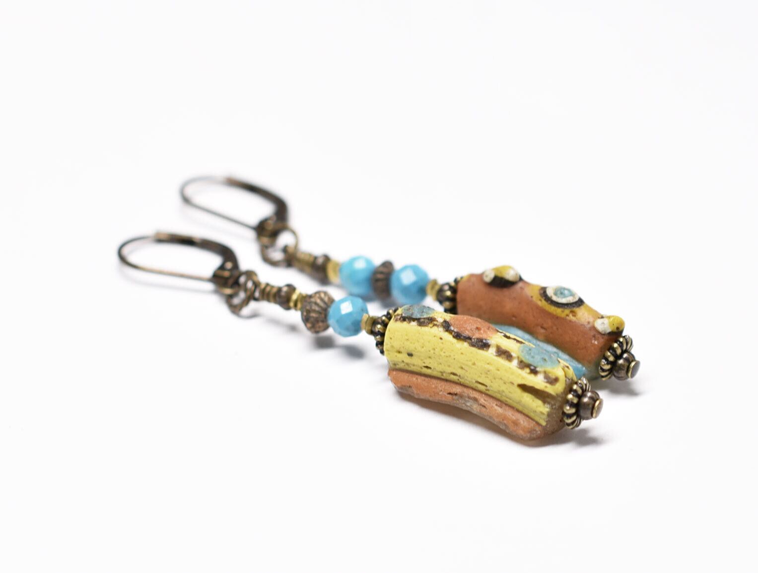 古代ガラスが色鮮やかに耳元で揺れるピアスです。