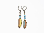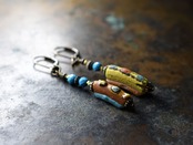 モザイク模様ローマングラスと鮮やかなターコイズ、算盤型のブラスビーズを繋いだアンシメトリーなピアスです。