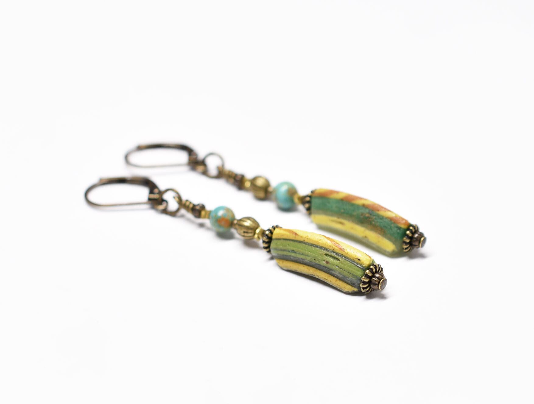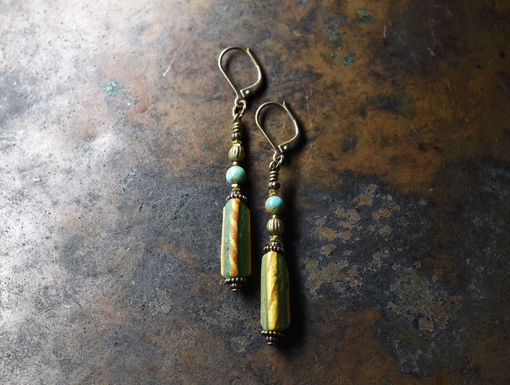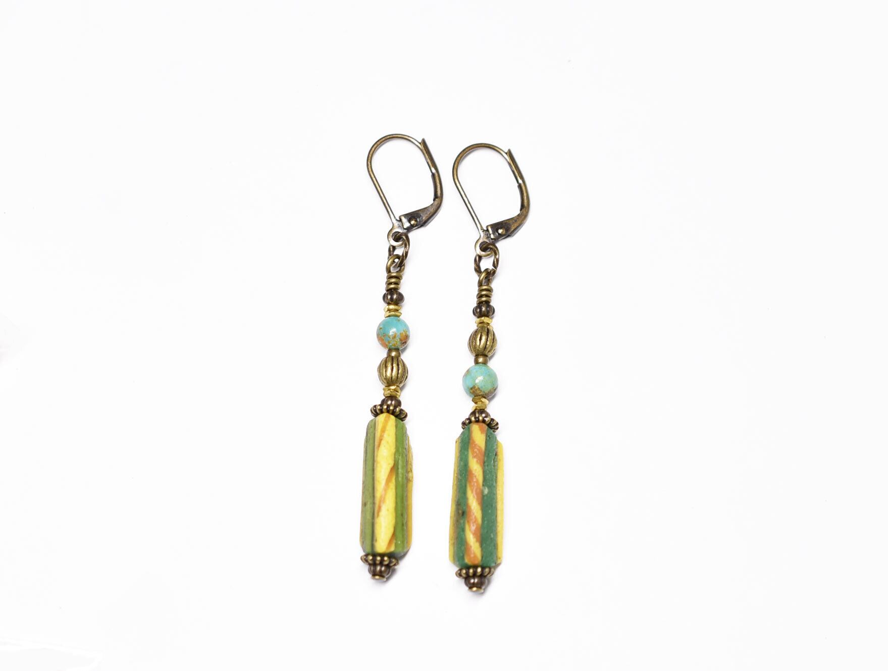 古代ガラスが色鮮やかに耳元で揺れるピアスです。