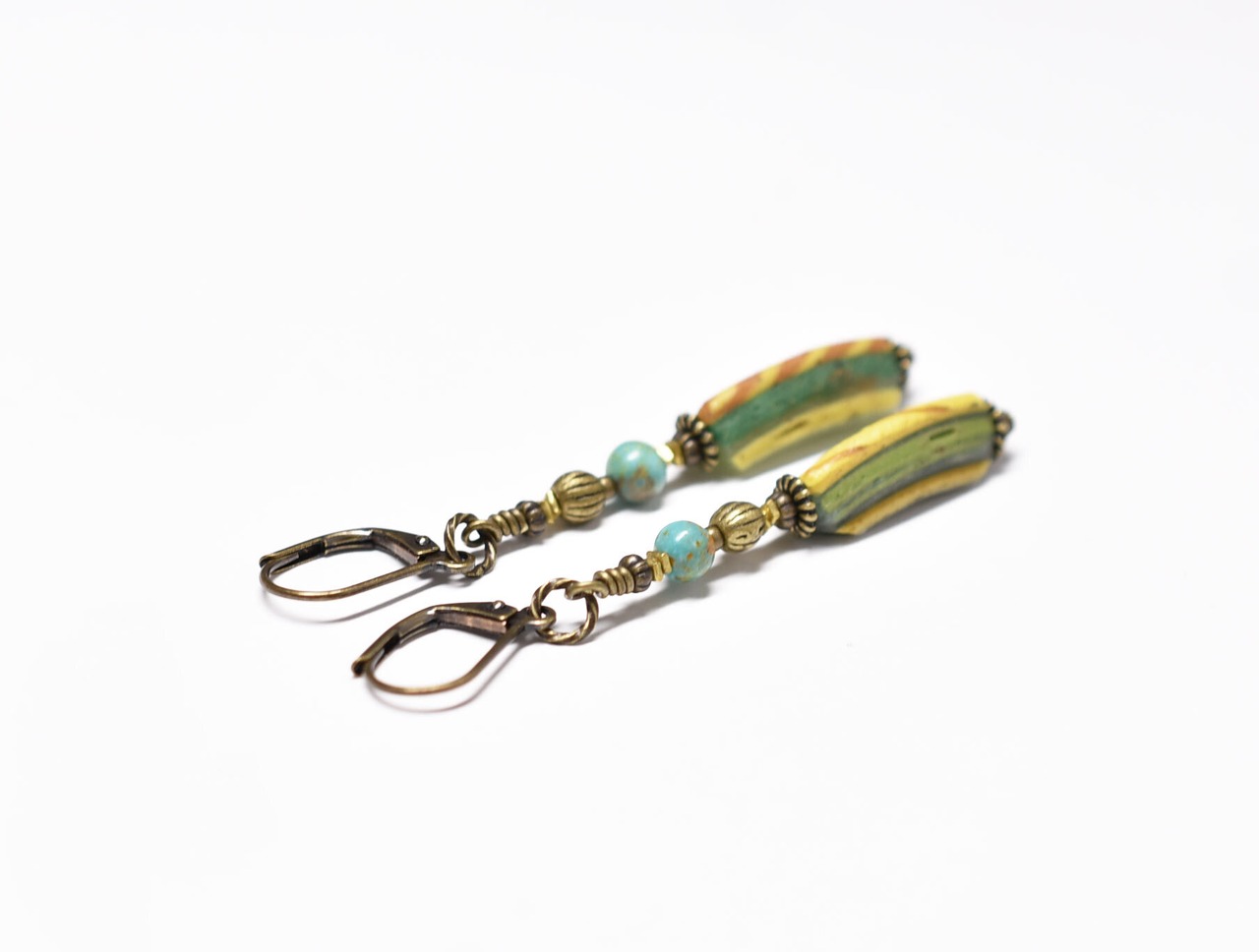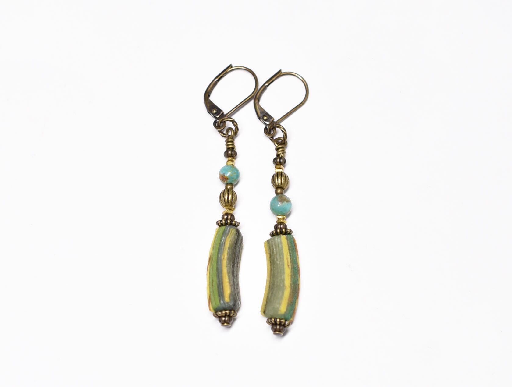 モザイク模様ローマングラスとまん丸ターコイズ、手毬ブラスビーズのアンシメトリーピアス