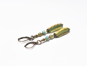 モザイク模様ローマングラスとまん丸ターコイズ、手毬ブラスビーズを繋いだアンシメトリーなピアスです。