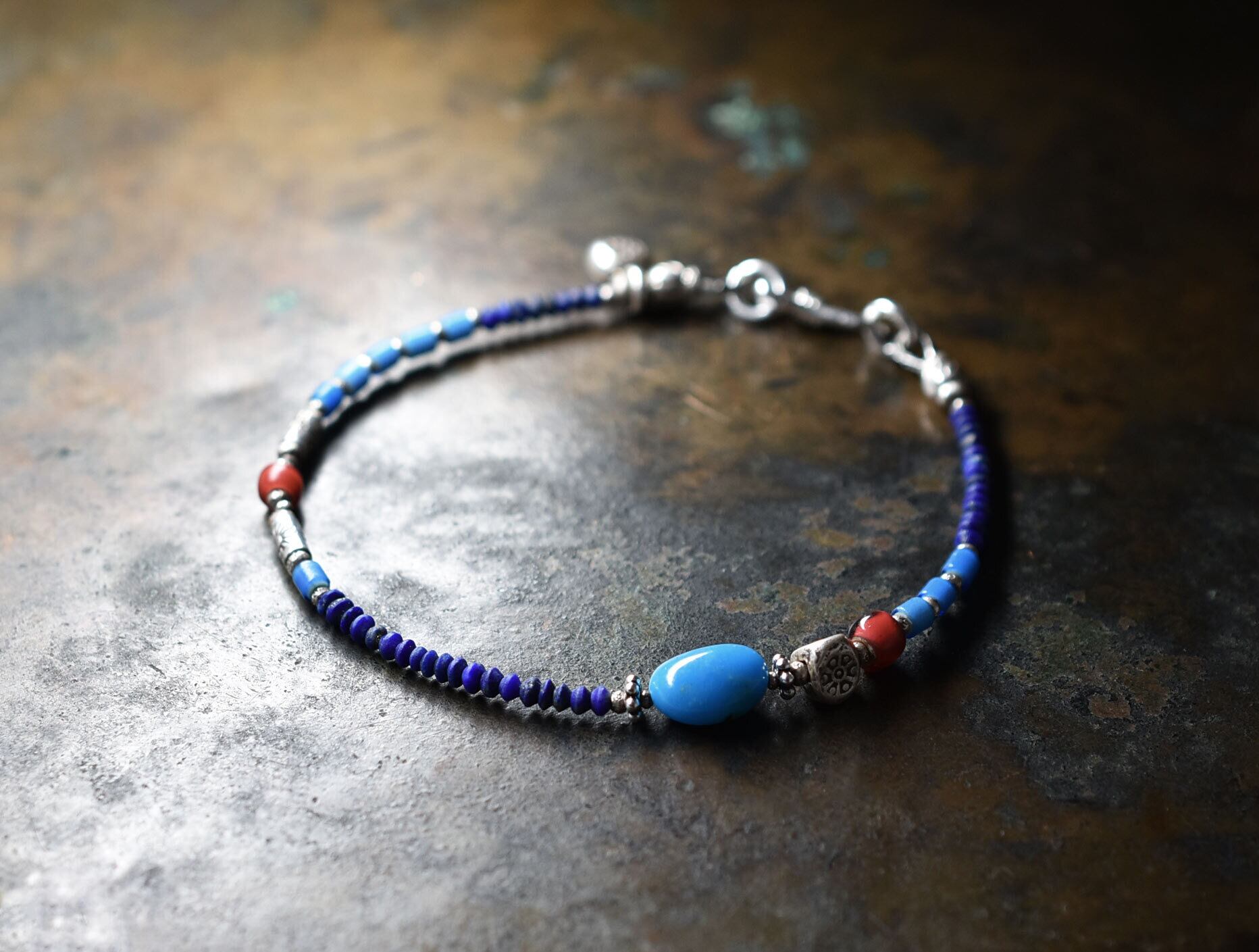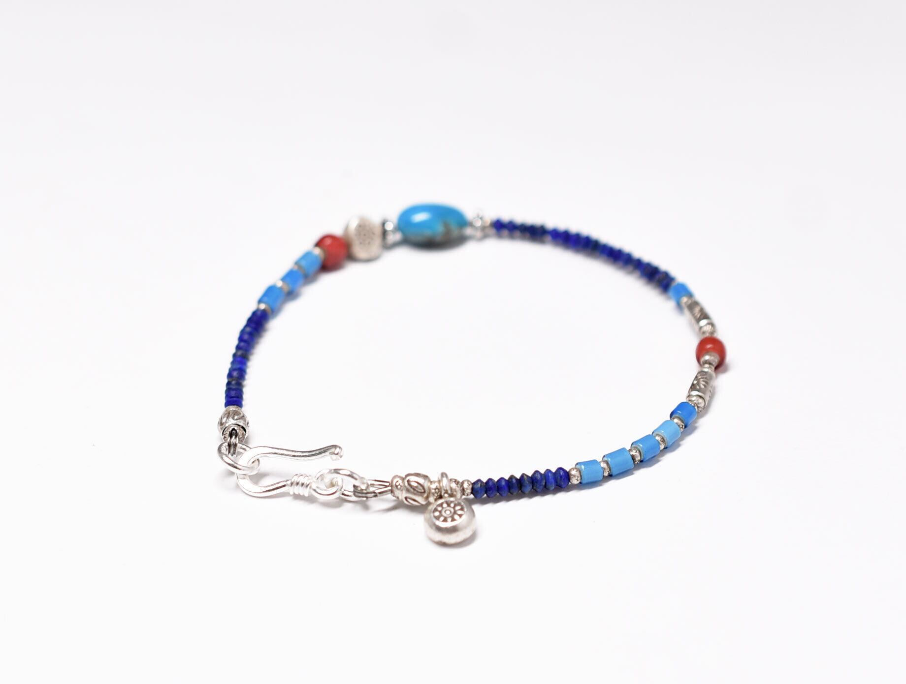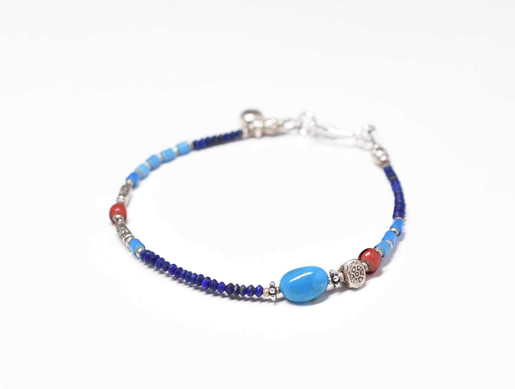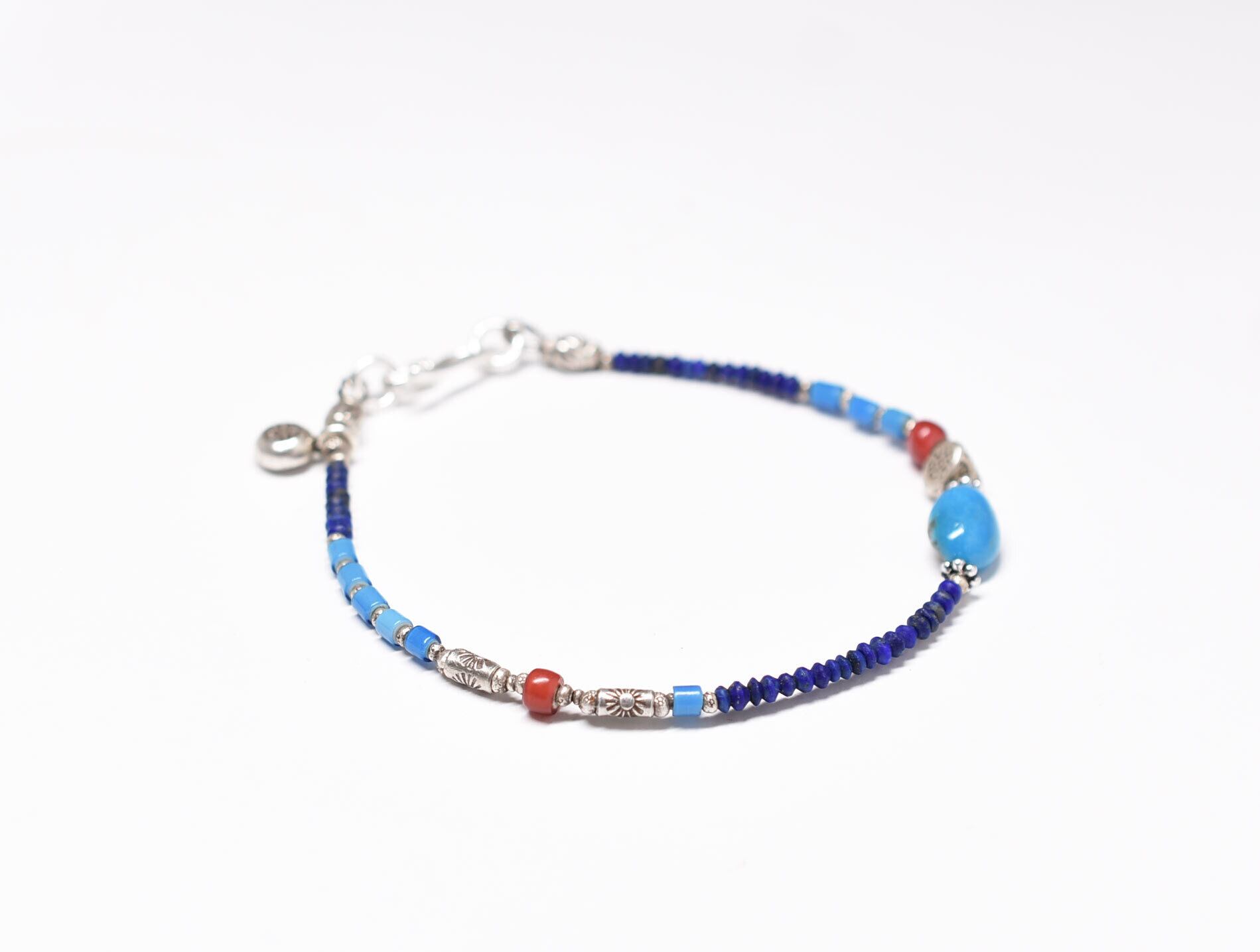 キングマンターコイズと金赤ホワイトハーツ、カレンシルバー、スカイブルーホワイトハーツとラピスを繋いだ華奢なブレスです。