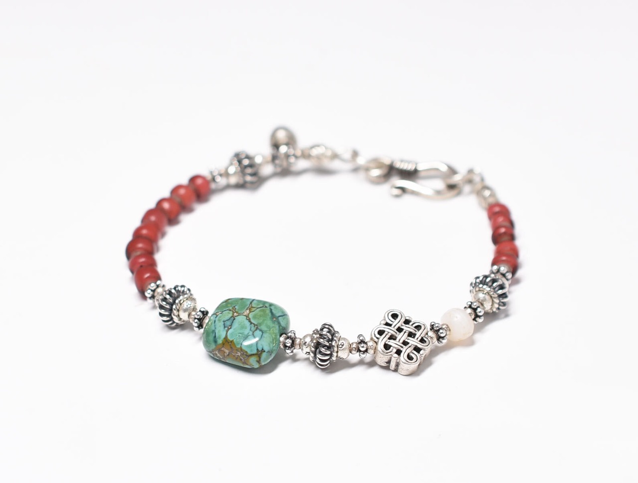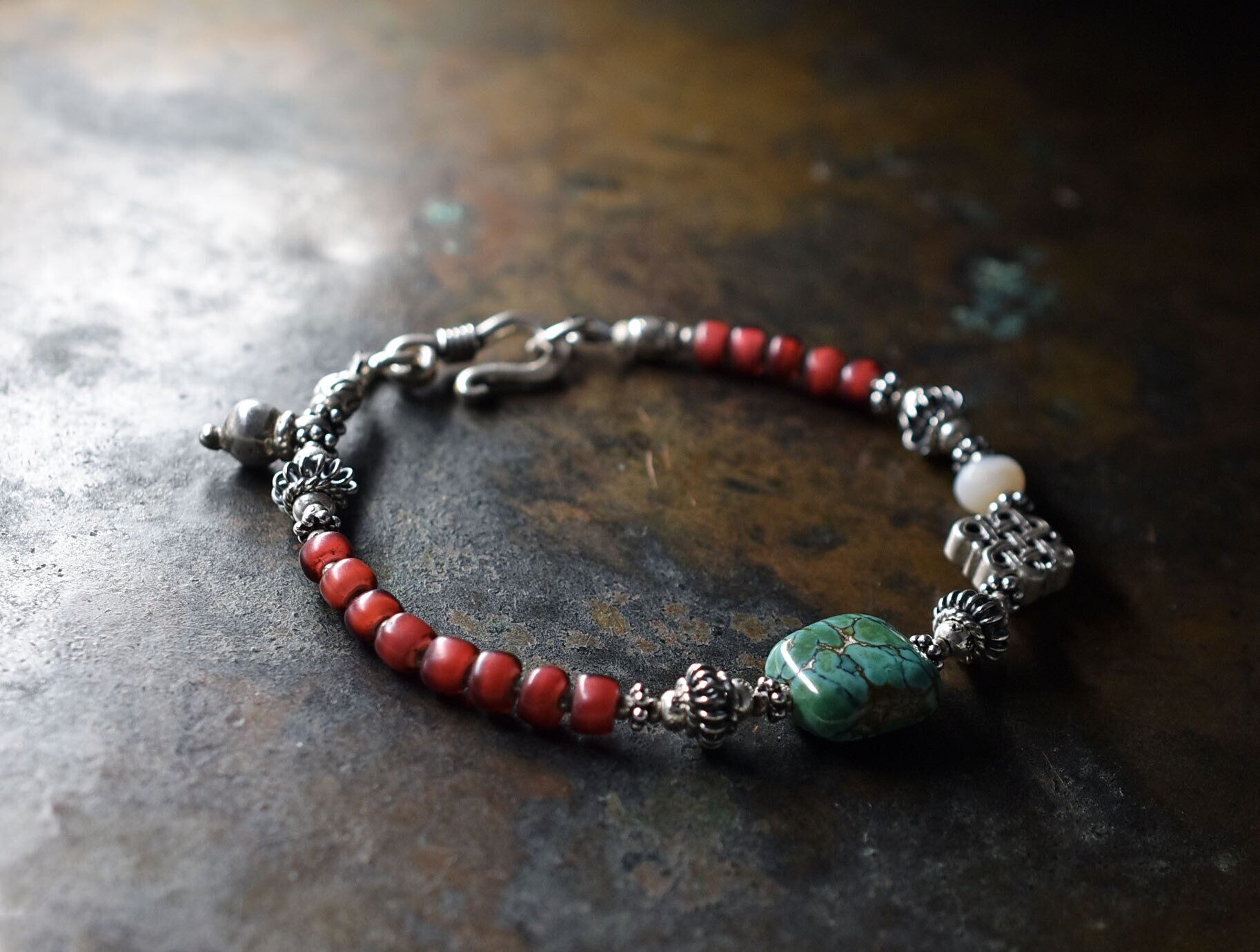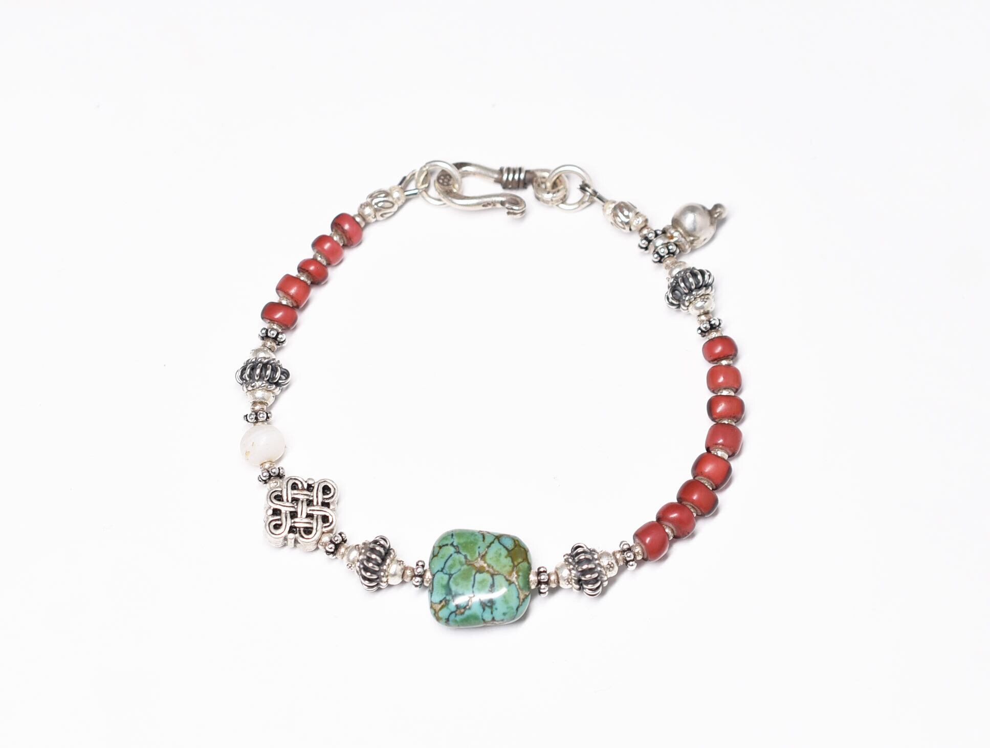 oldチベタンターコイズとエンドレスノット、古代瑪瑙、金赤ホワイトハーツのブレスです。