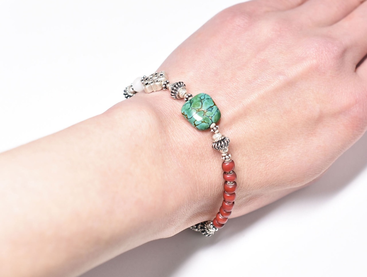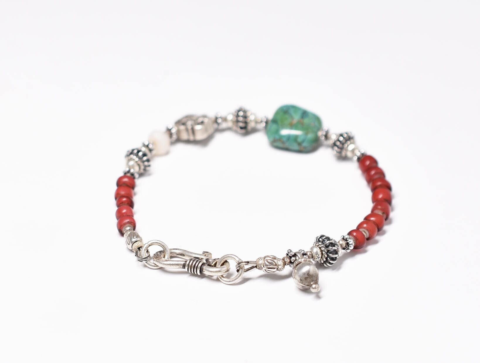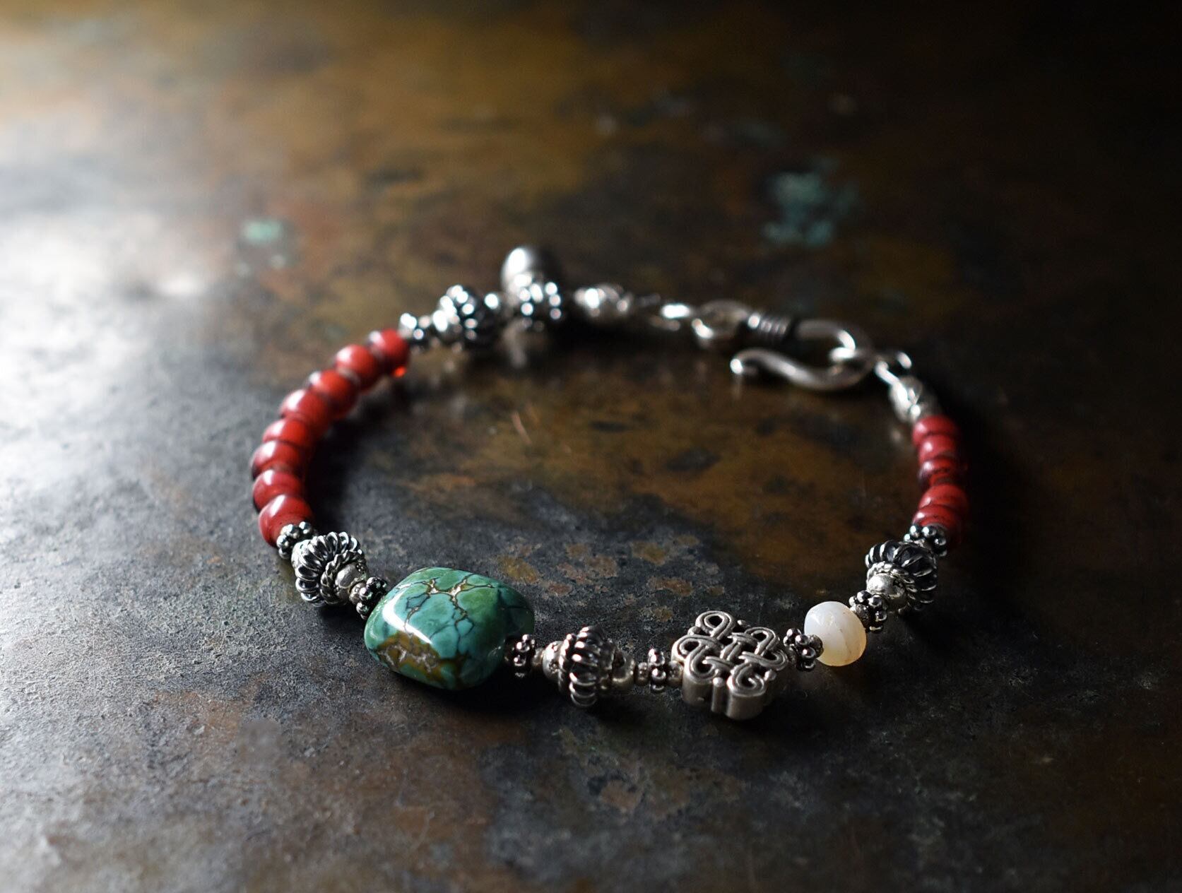 oldチベタンターコイズとエンドレスノット、古代瑪瑙、金赤ホワイトハーツのブレスです。