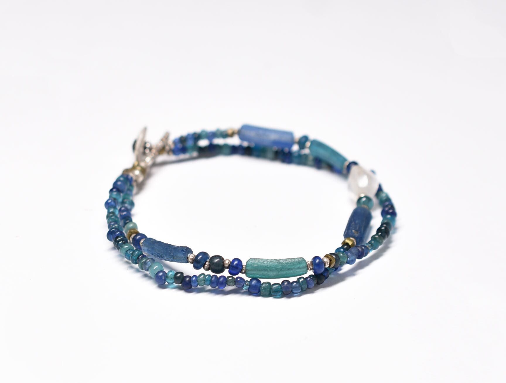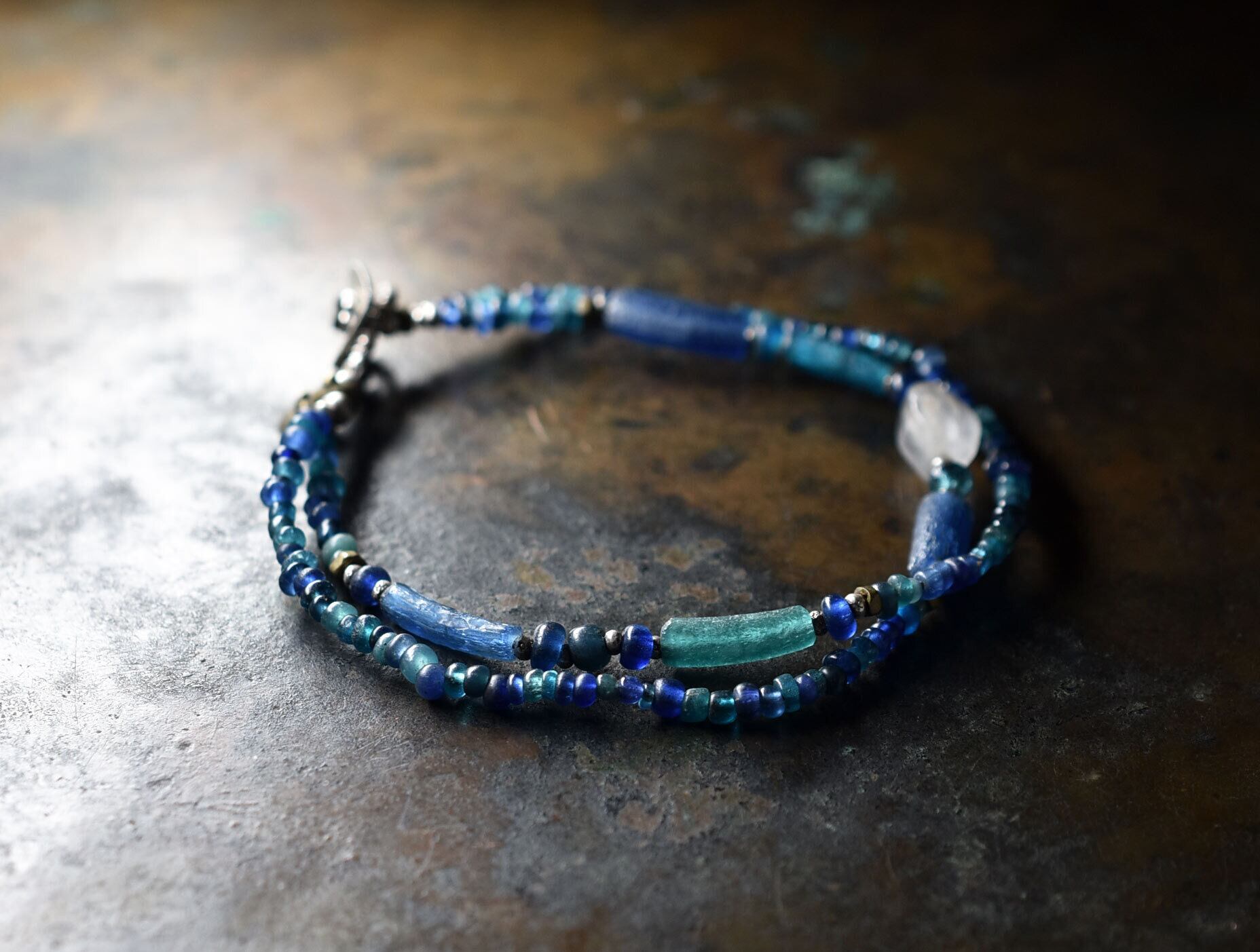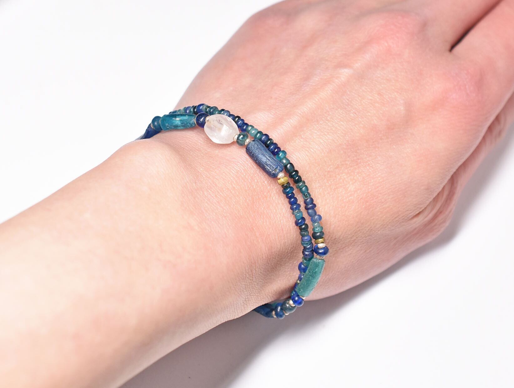 古代水晶とローマングラス、ブルーミックスビーズの2連ブレス