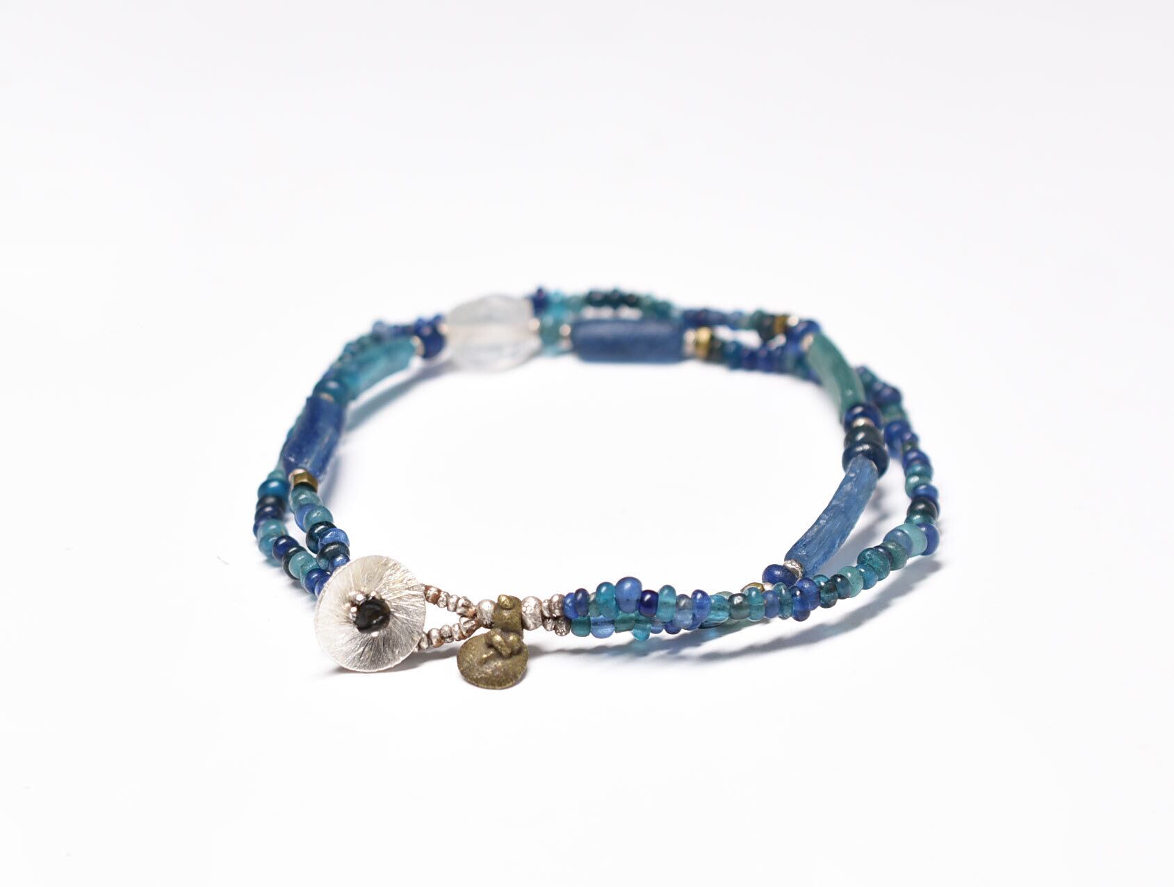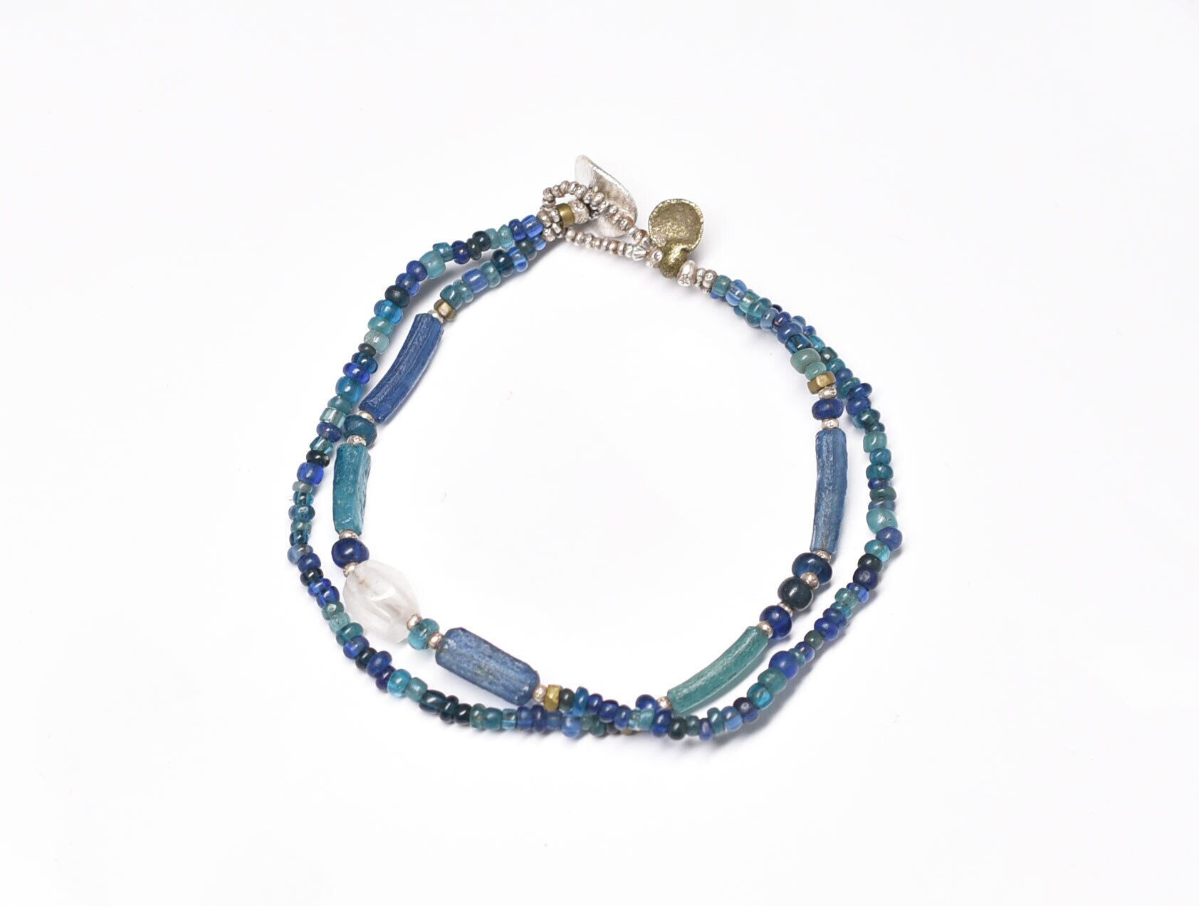 古代水晶と、ローマングラスと、ブルーミックスビーズ、oldオリッサブラスなどを繋いだ2連のブレスです。