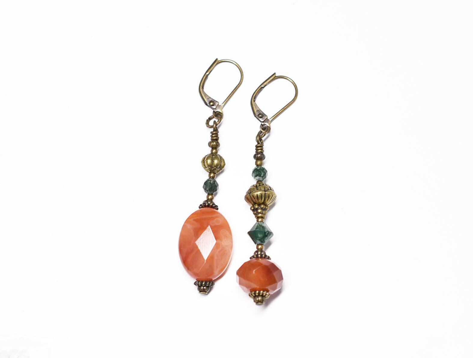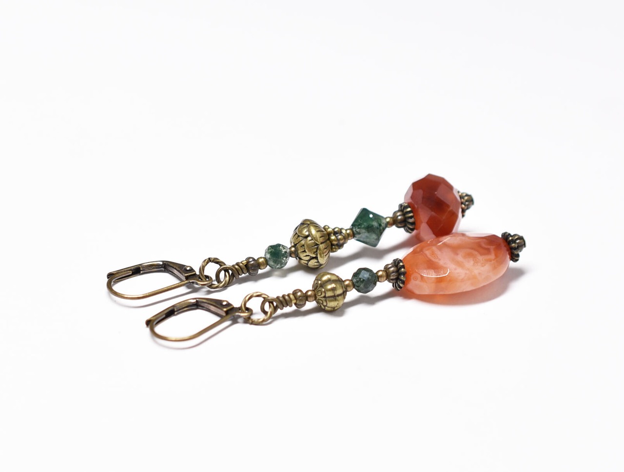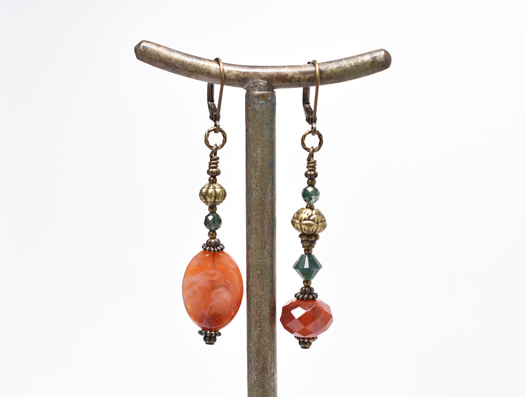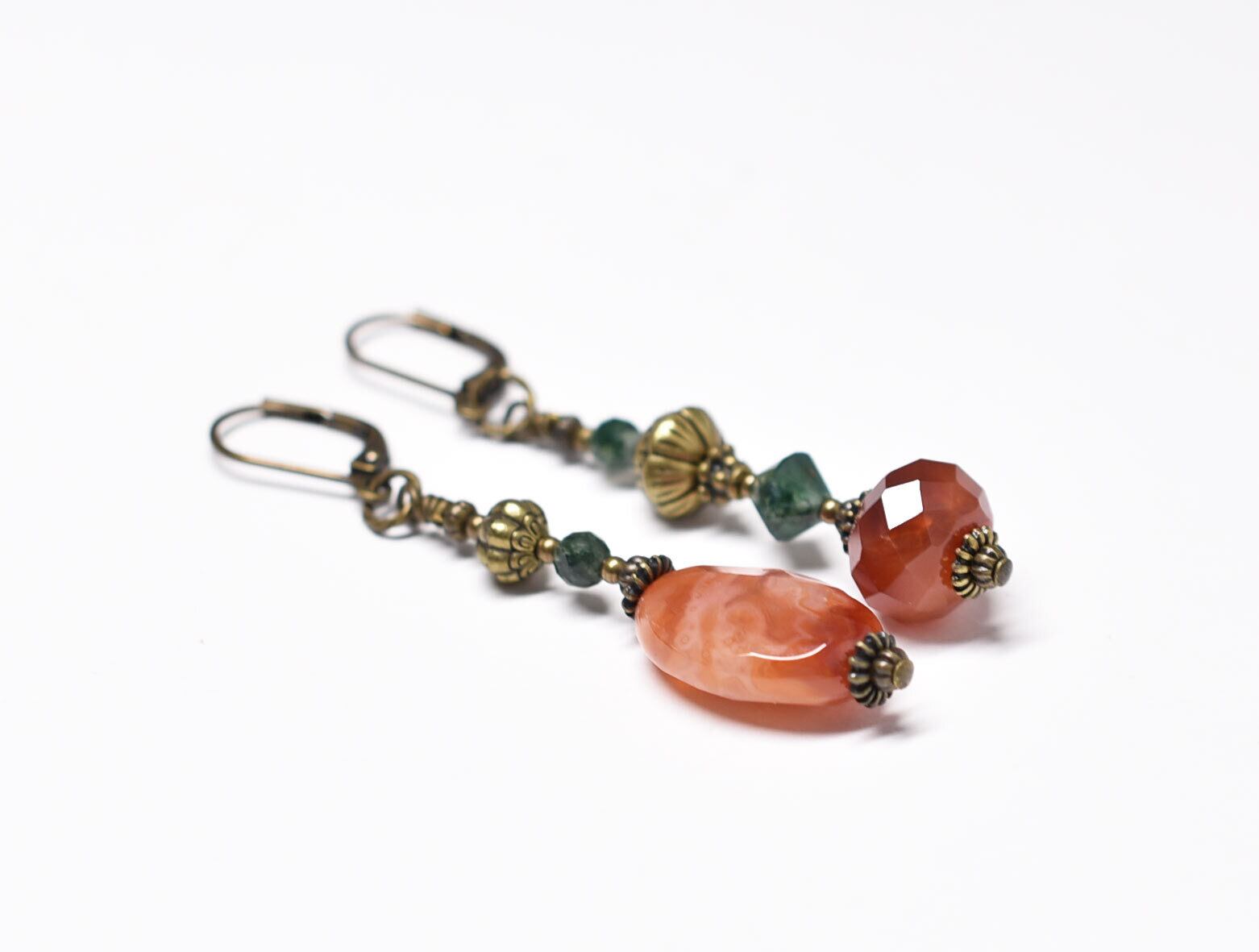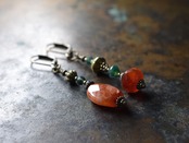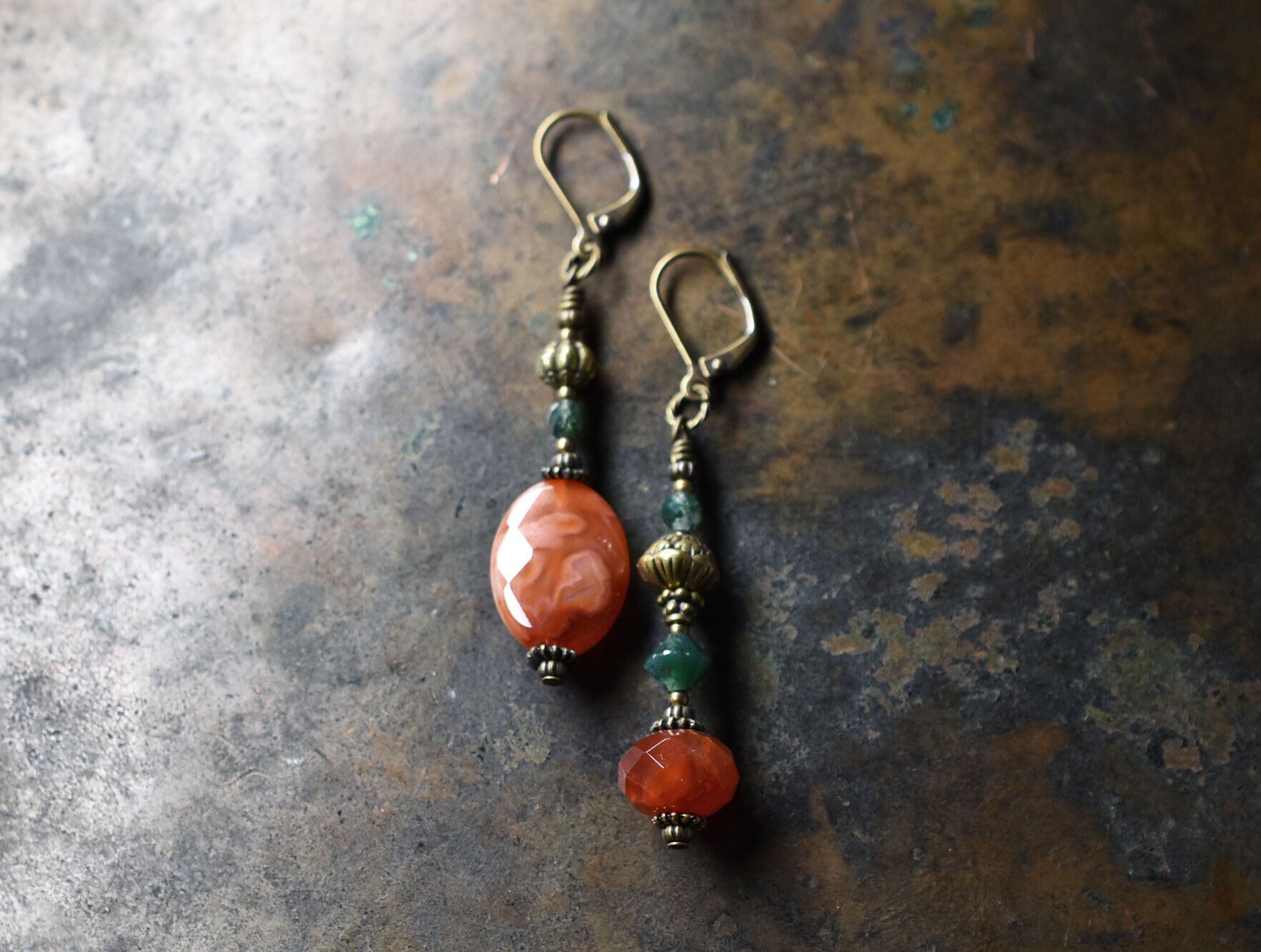 緋色カーネリアンとモスアゲート、蓮華&手毬ブラスを繋いだアンシメトリーなピアスです。