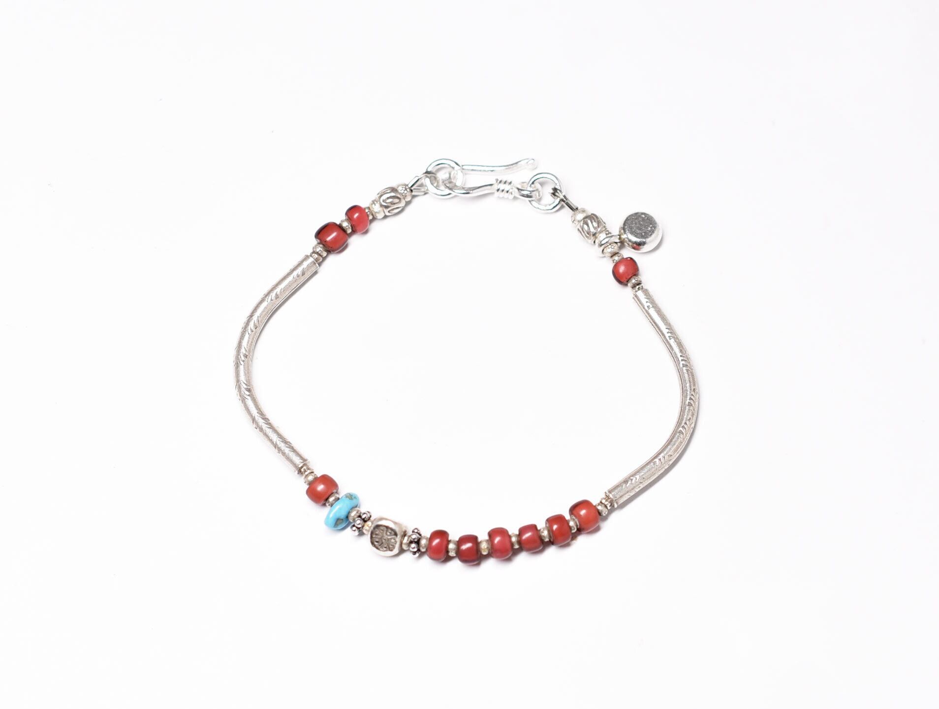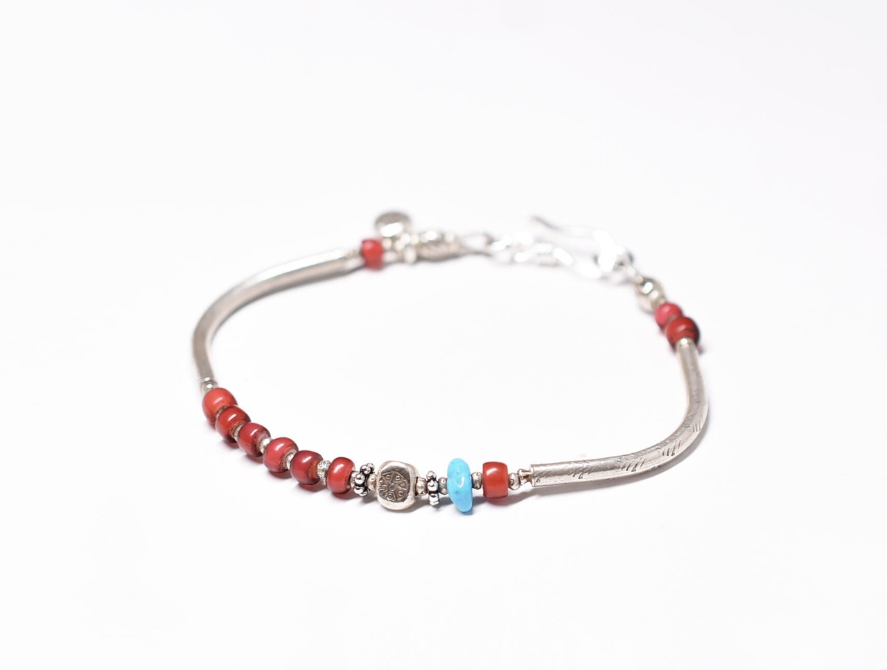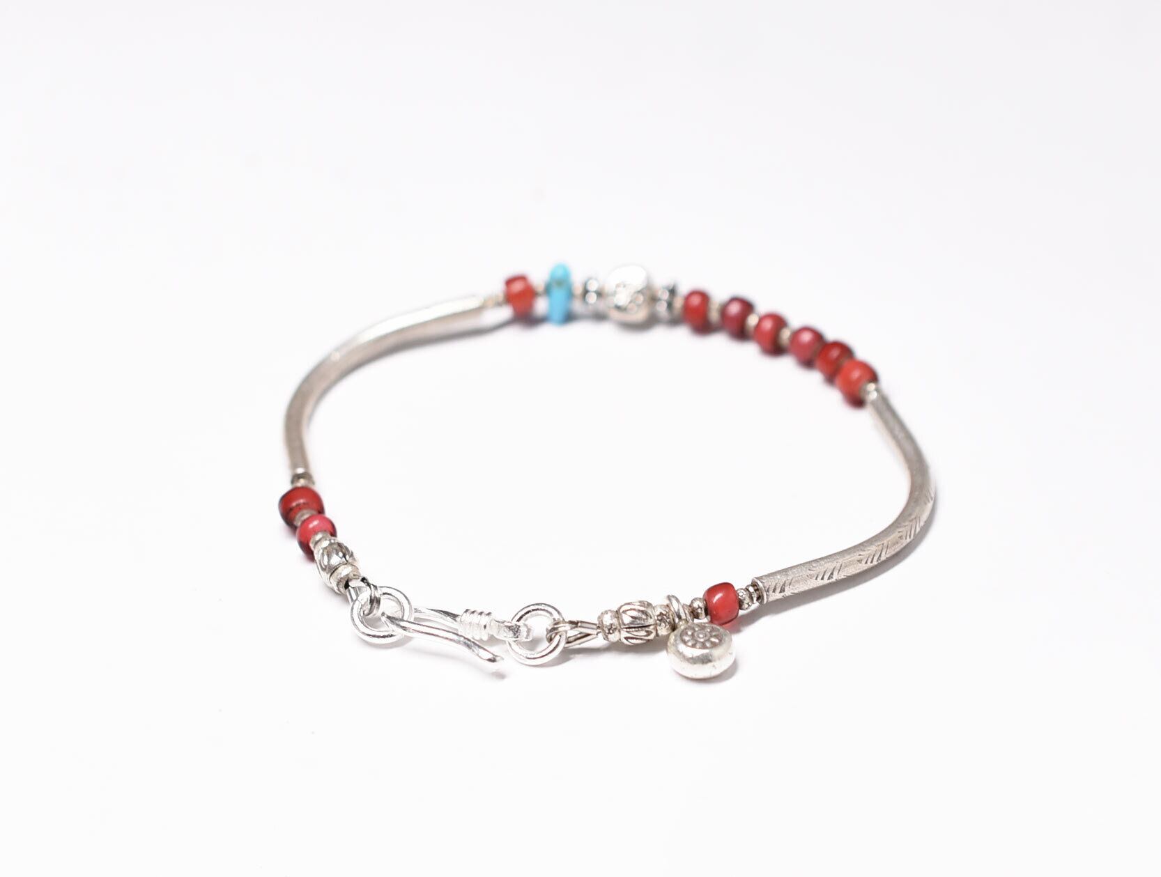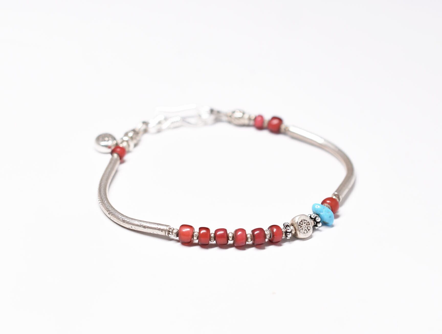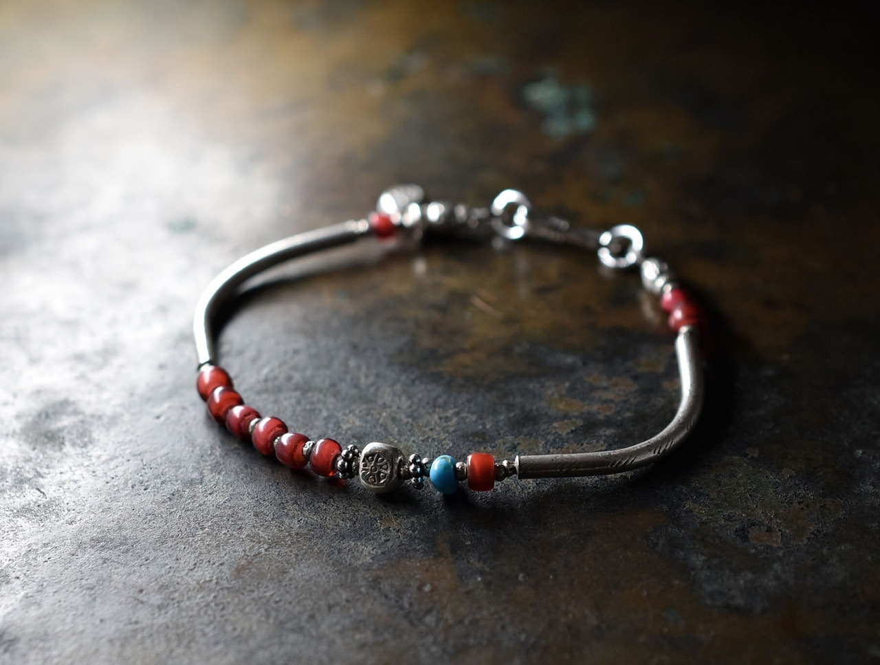 湾曲カレンシルバーと金赤ホワイトハーツ、キャッスルドームターコイズを繋いだ華奢なブレスです。