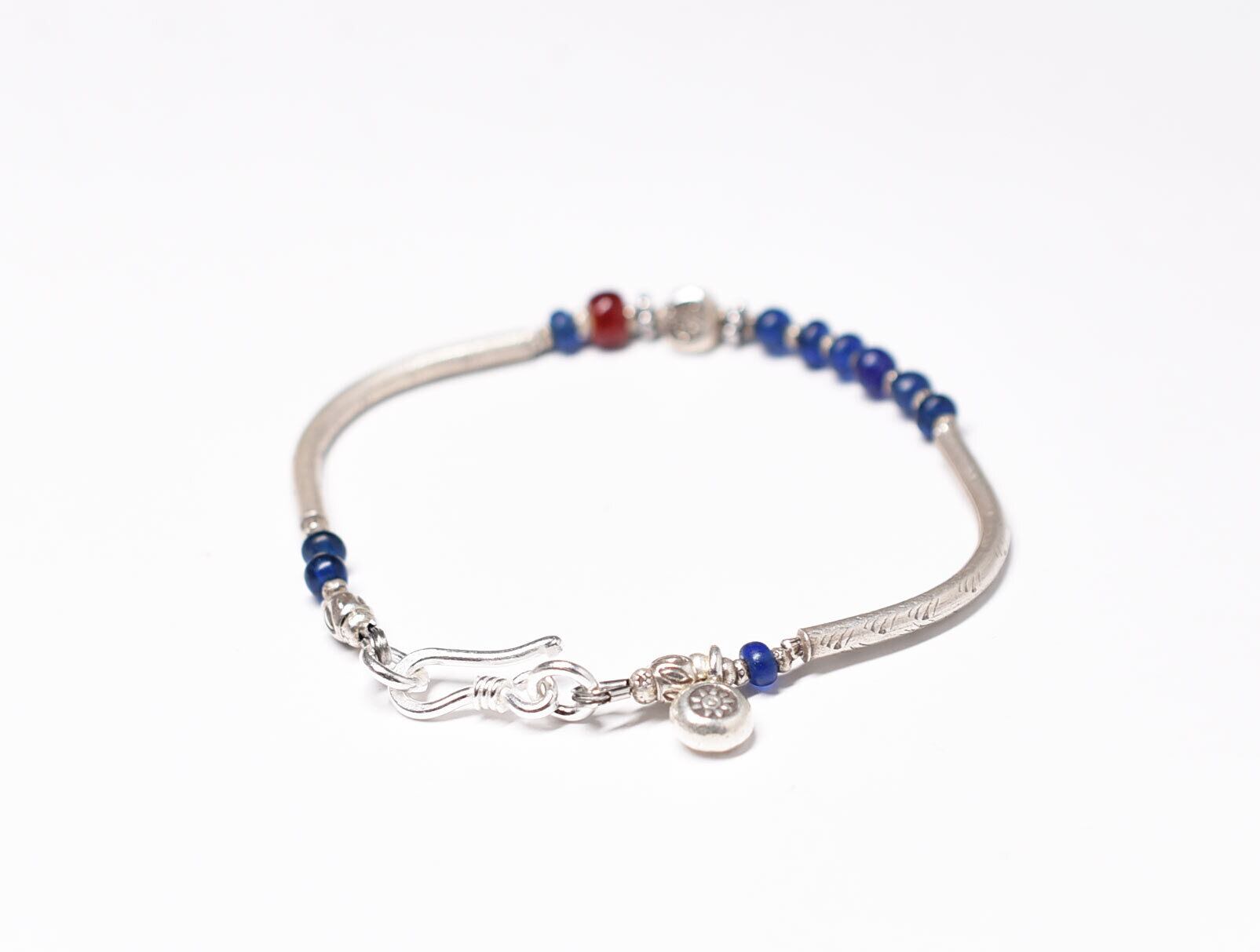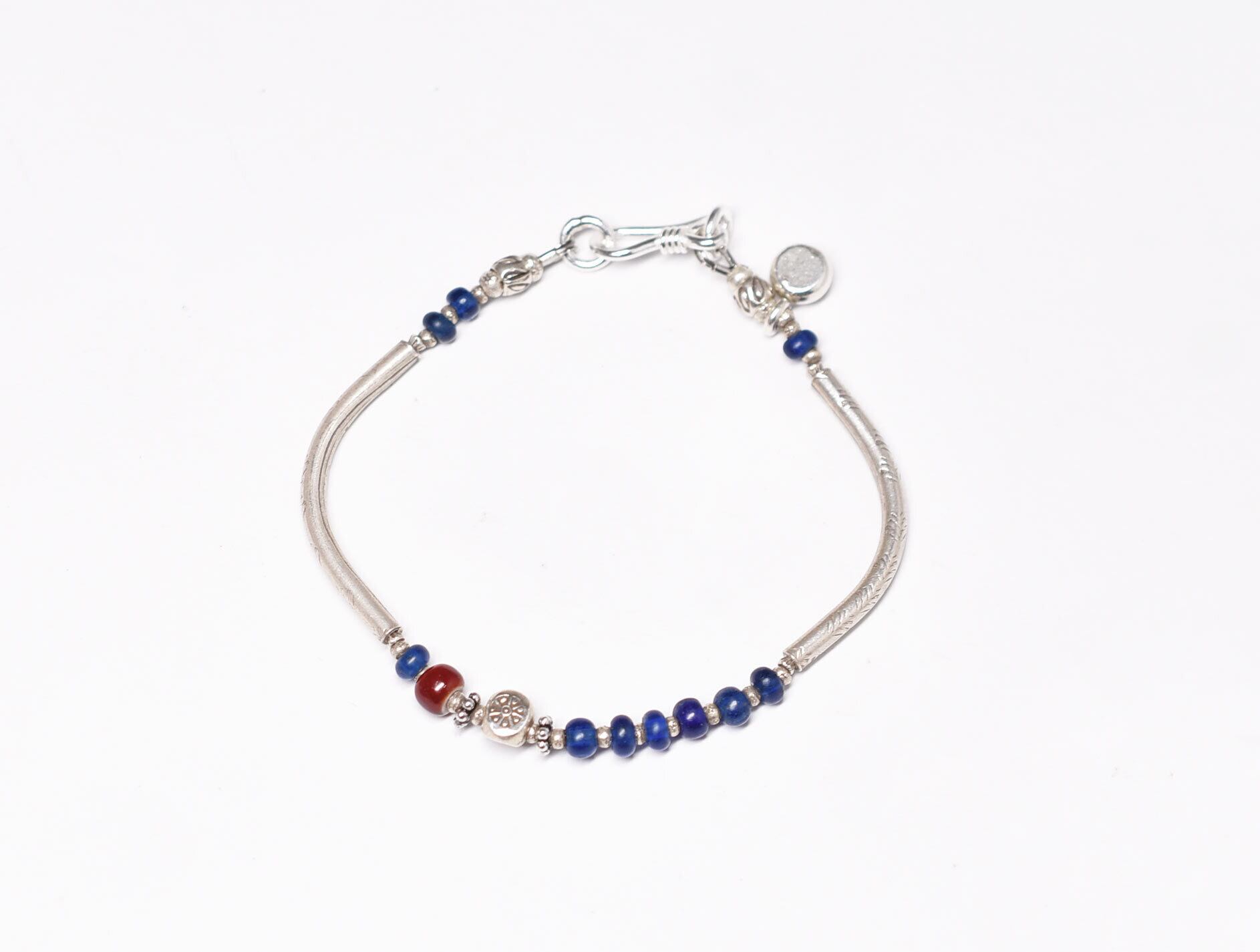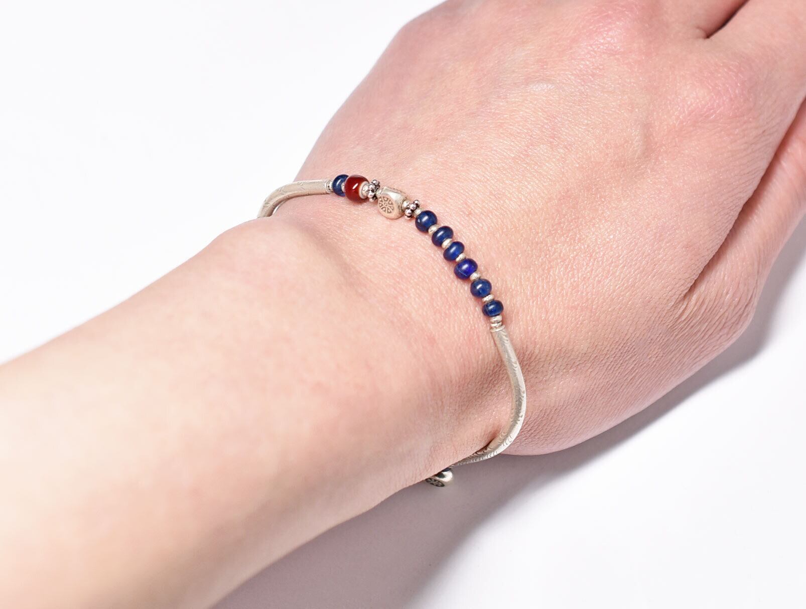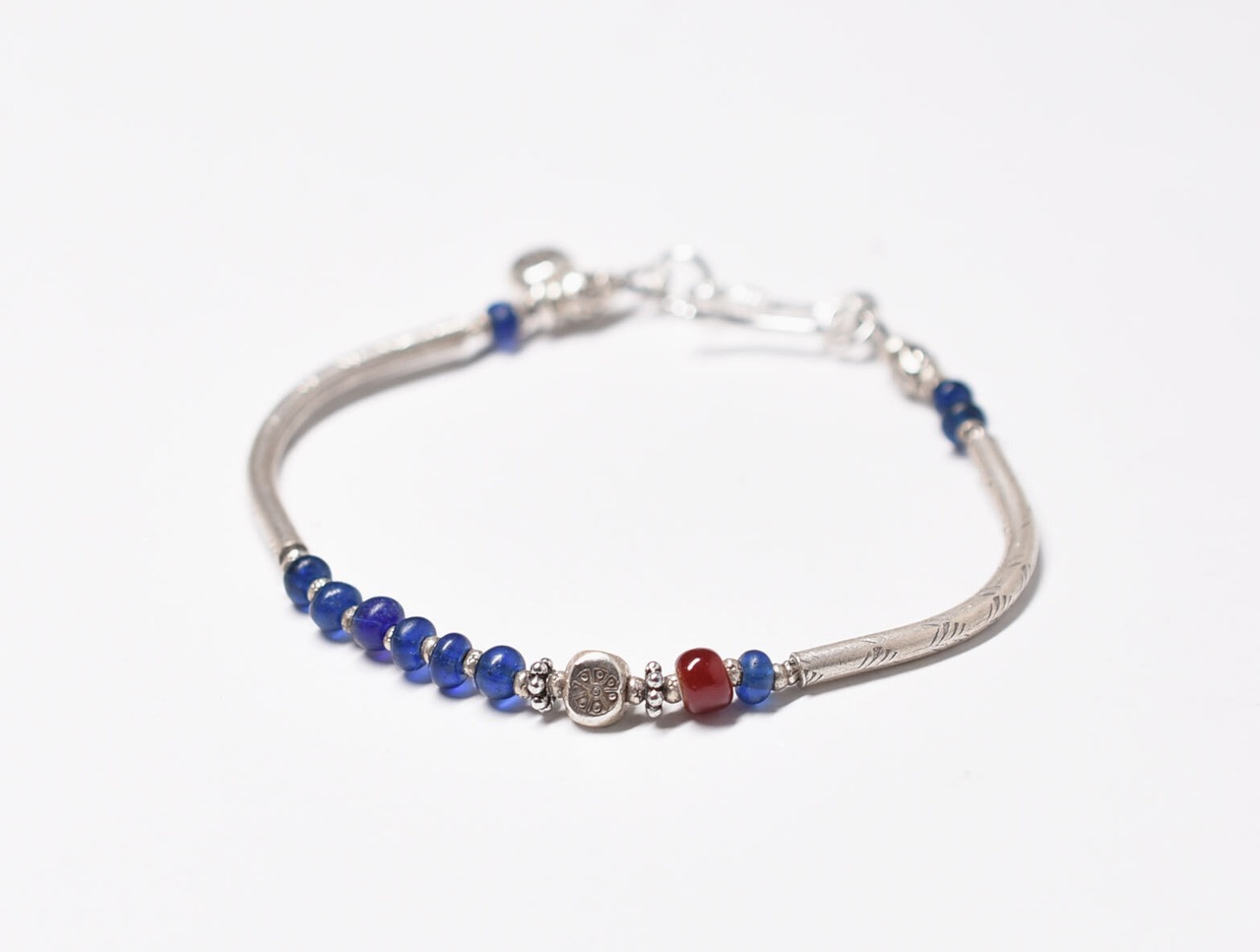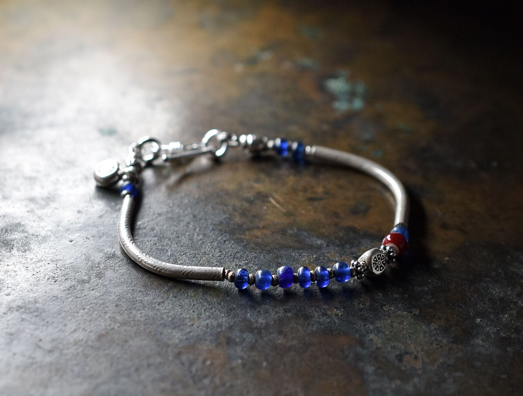 湾曲カレンシルバーとブルーアンティークビーズ、血赤ホワイトハーツの華奢なブレス