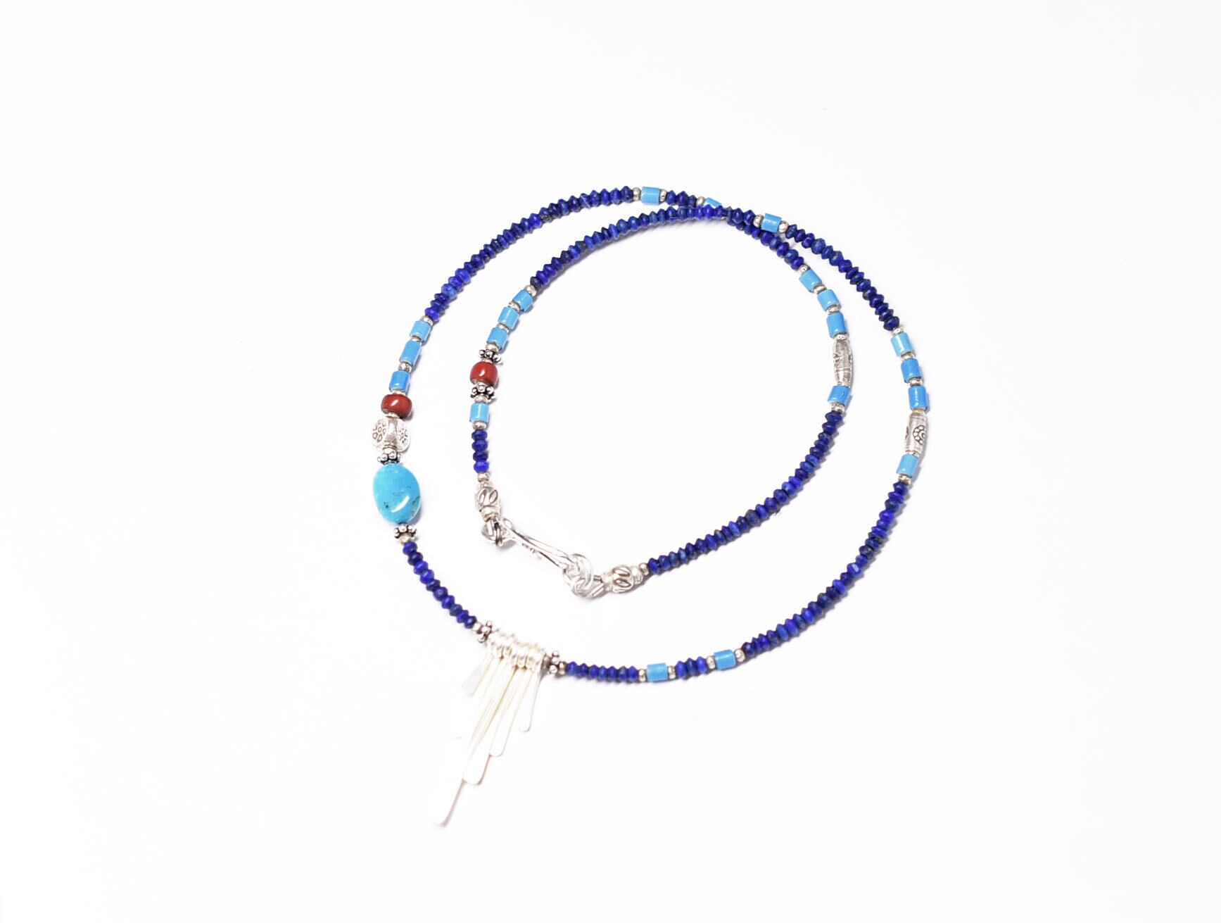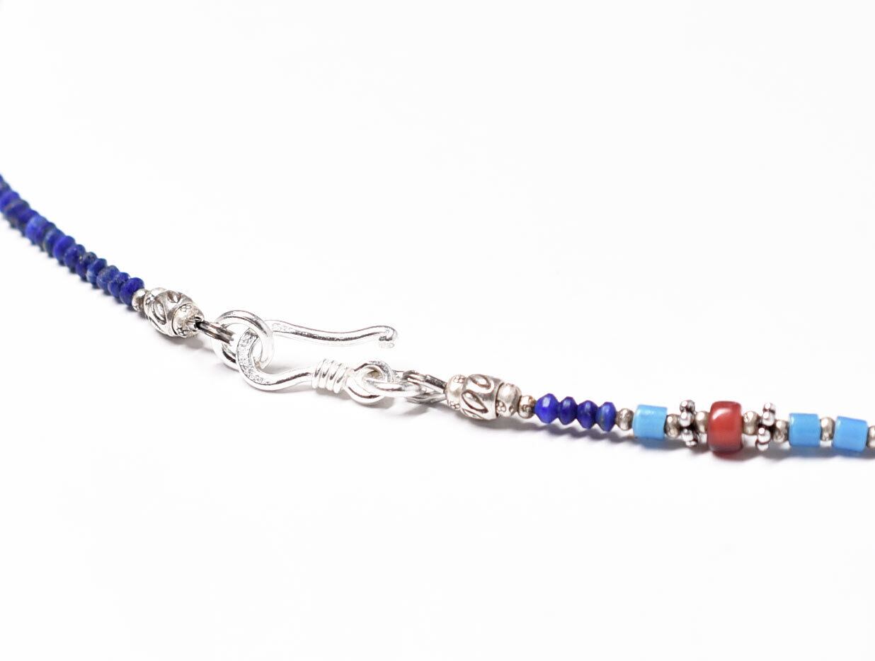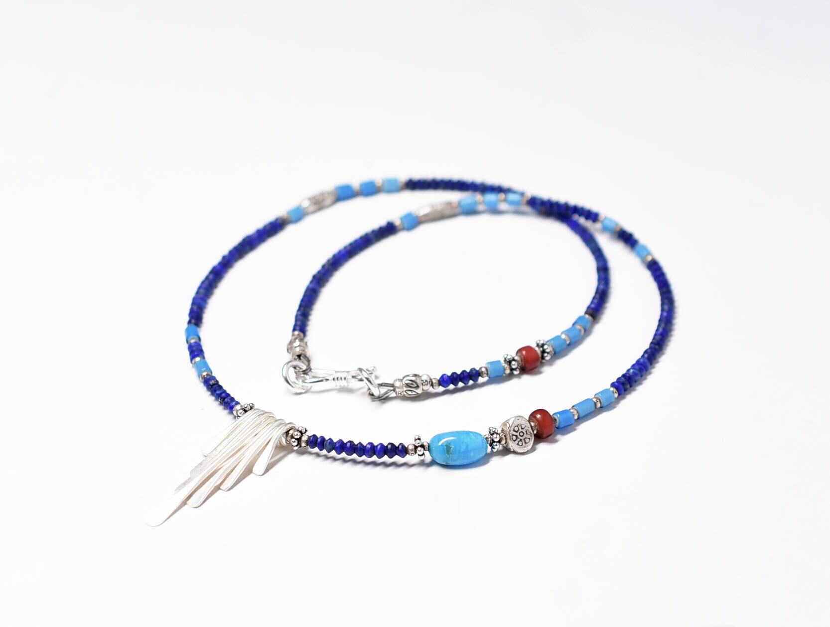 カレンシルバーとキングマンターコイズと金赤ホワイトハーツ、ラピスとスカイブルーホワイトハーツの華奢なネックレス