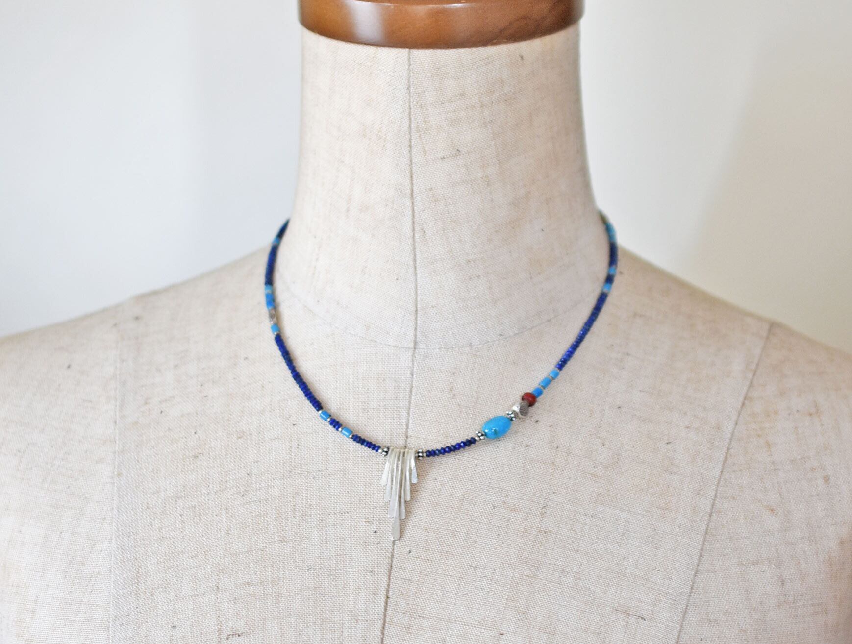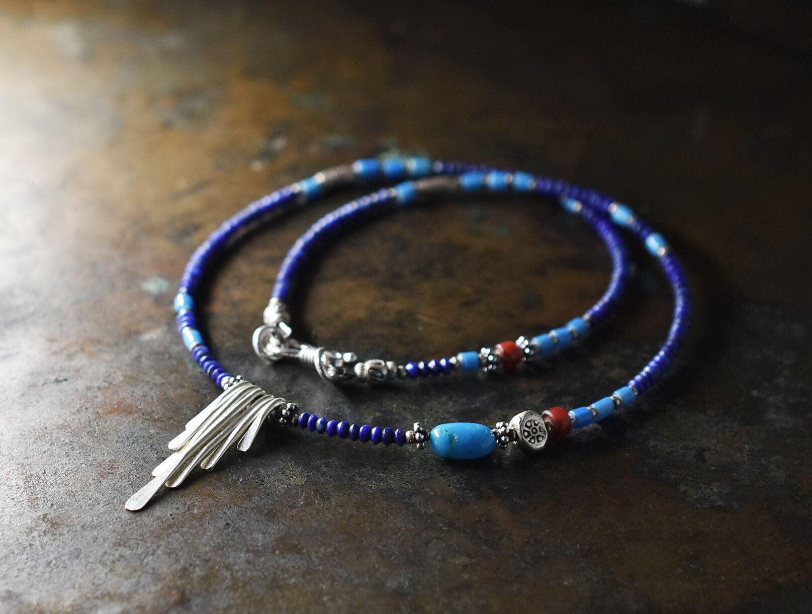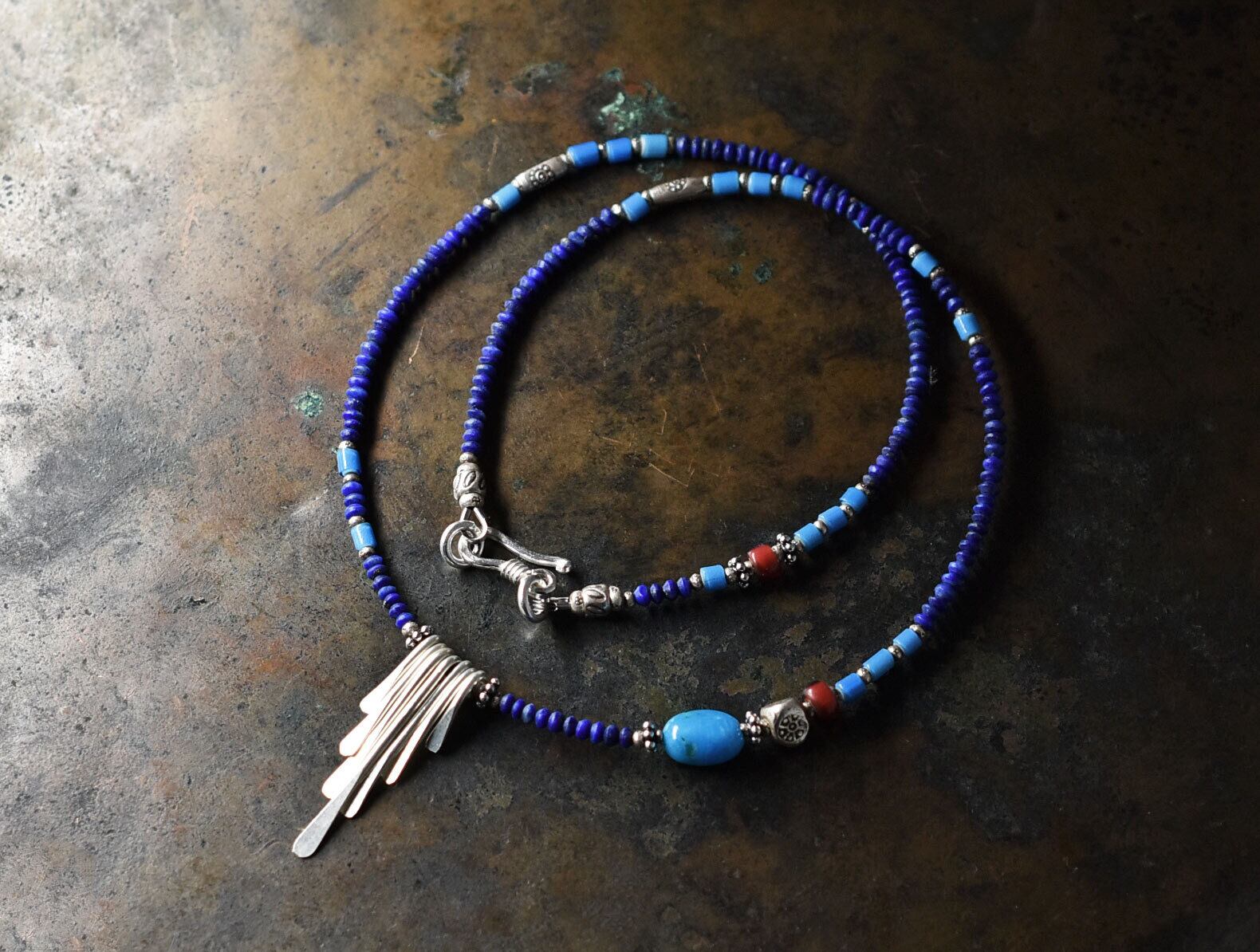 カレンシルバーとキングマンターコイズと金赤ホワイトハーツ、ラピスとスカイブルーホワイトハーツの華奢なネックレス