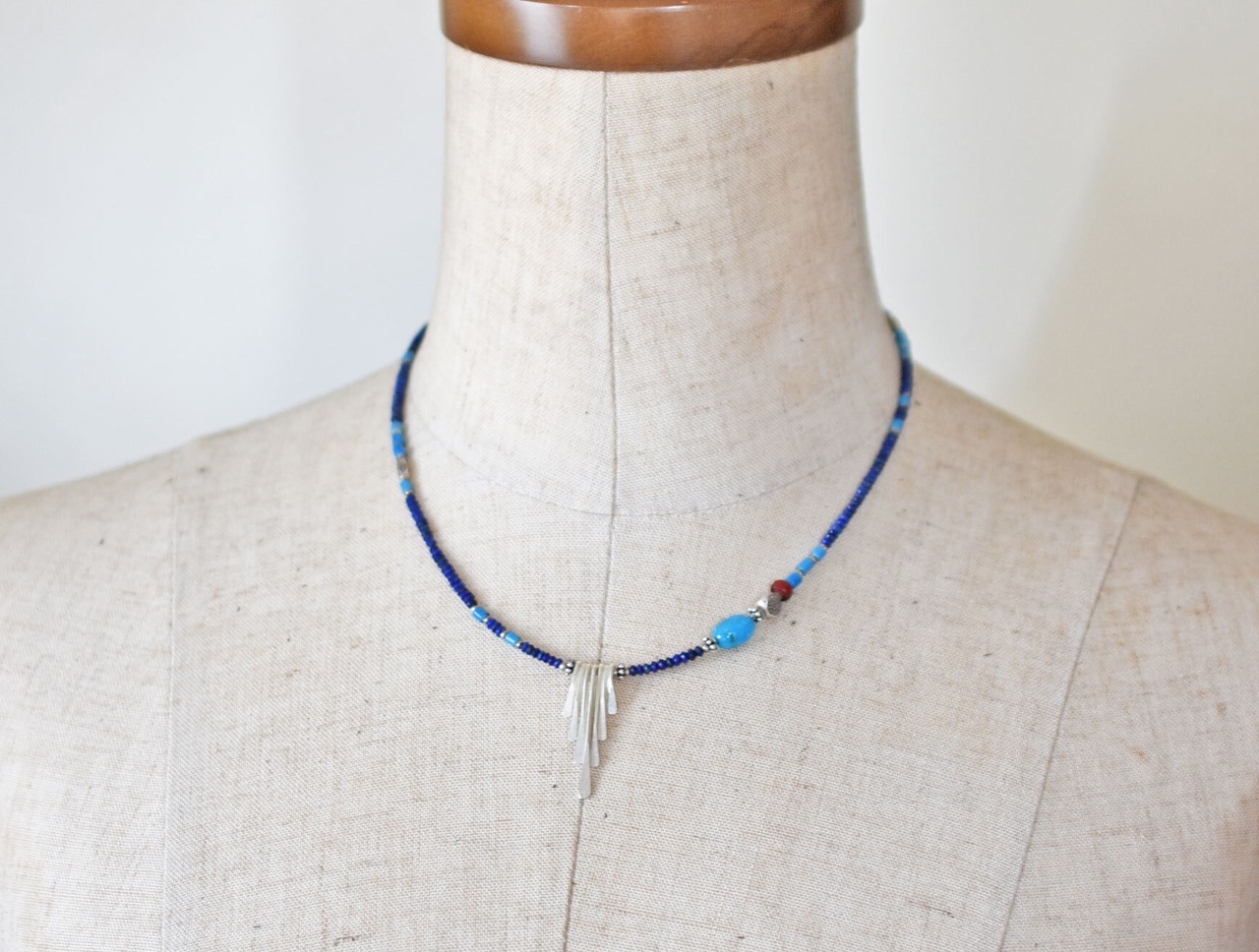 カレンシルバーとキングマンターコイズと金赤ホワイトハーツ、ラピスとスカイブルーホワイトハーツを繋いだ華奢なネックレスです。