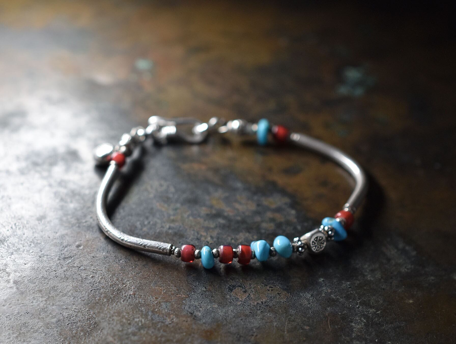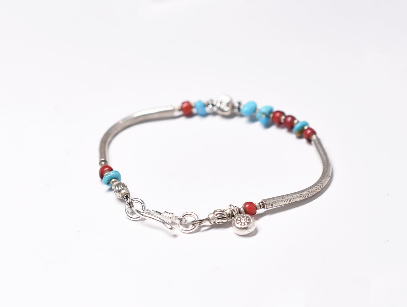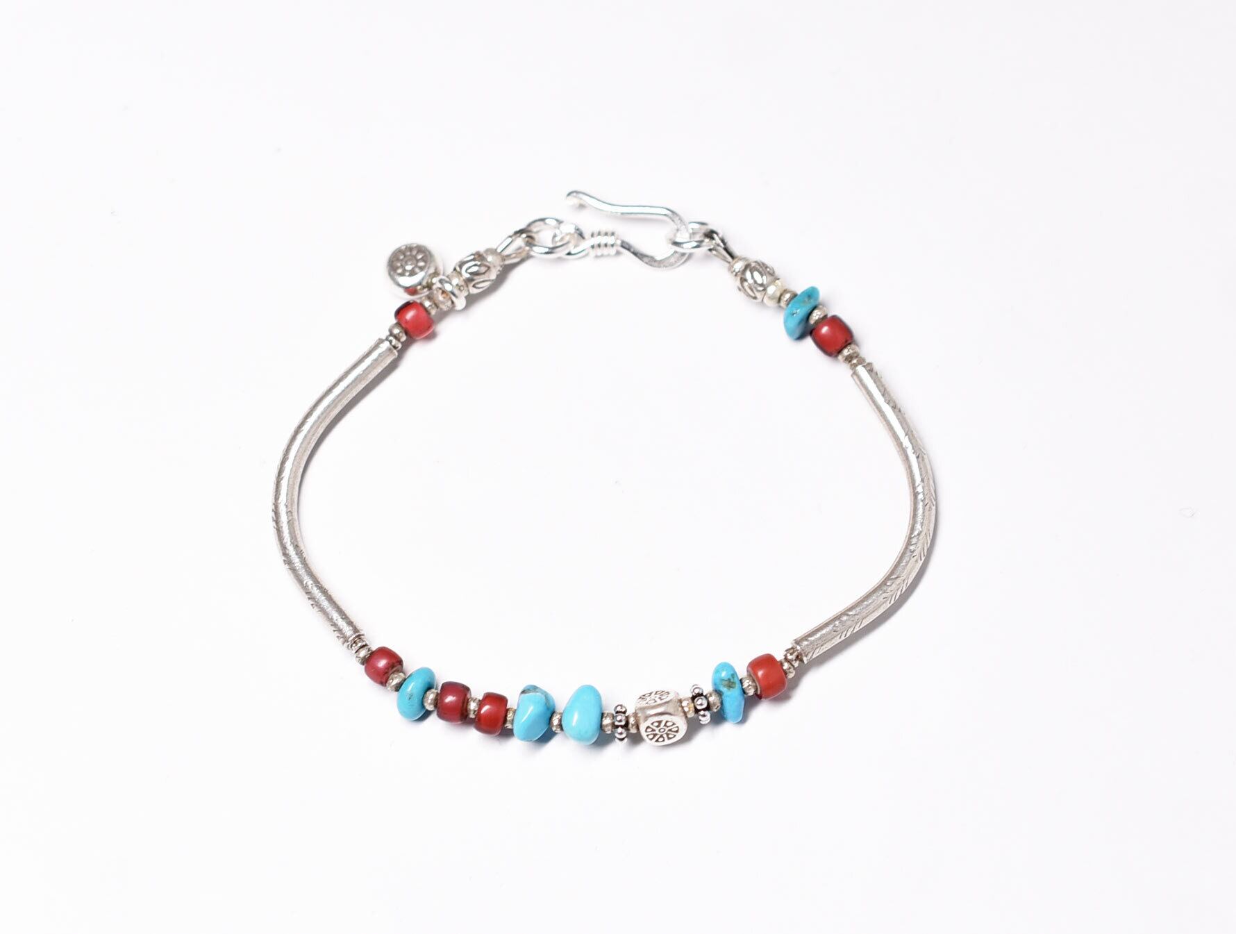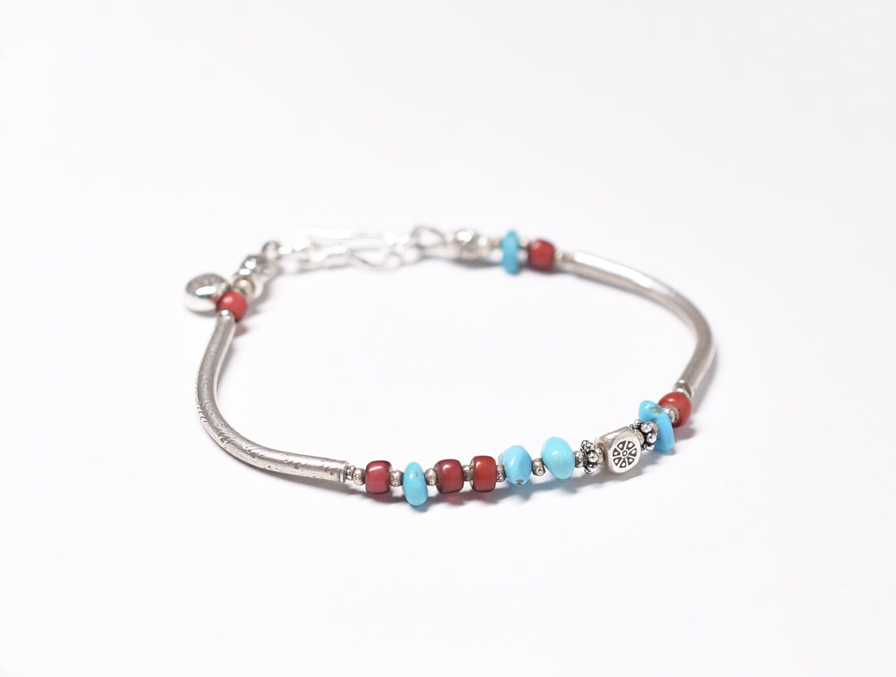 湾曲カレンシルバーと金赤ホワイトハーツ、キャッスルドームターコイズを繋いだ華奢なブレスです。