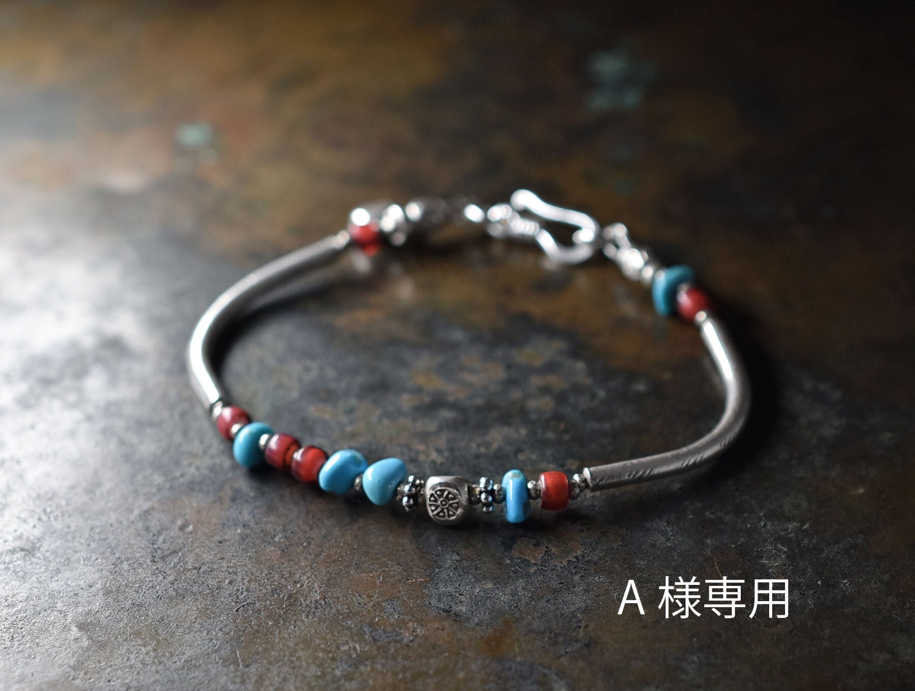 「A様専用」湾曲カレンシルバーと金赤ホワイトハーツ、キャッスルドームターコイズの華奢なブレス