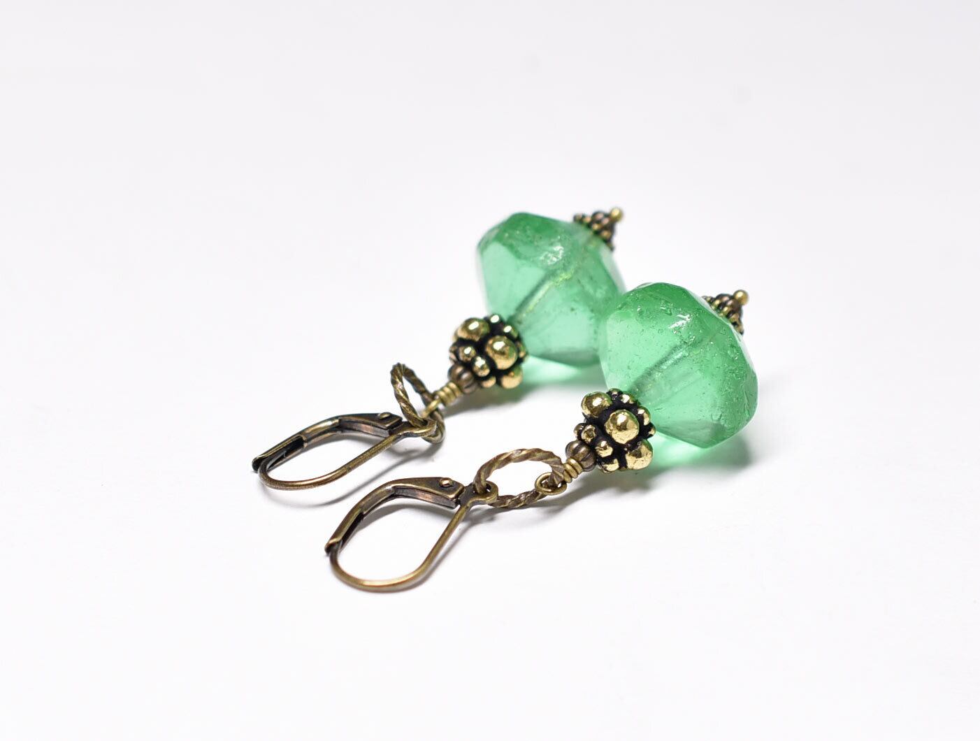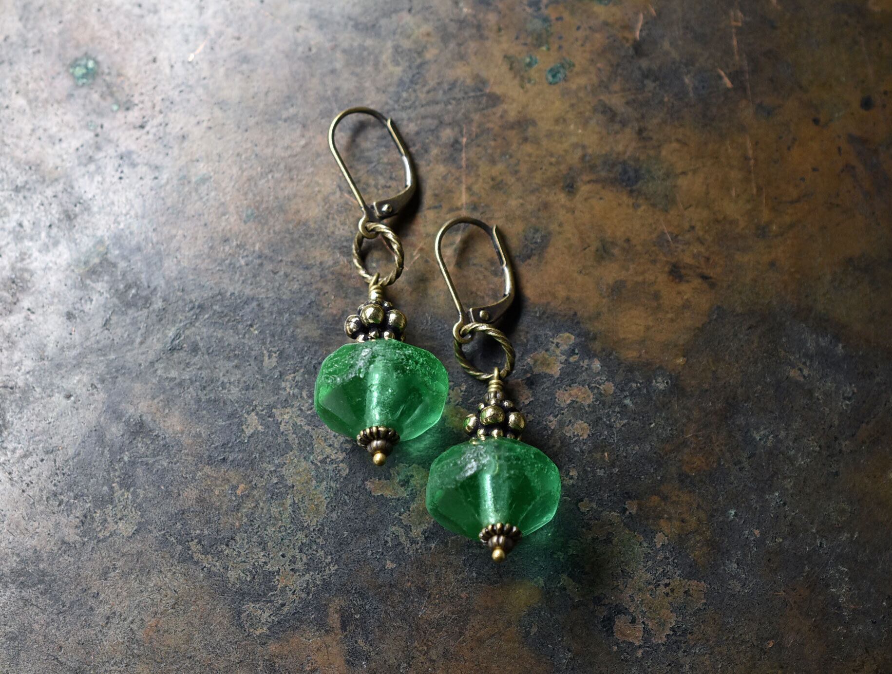 アンティークウランガラスビーズと、ぷっくりブラスのピアス