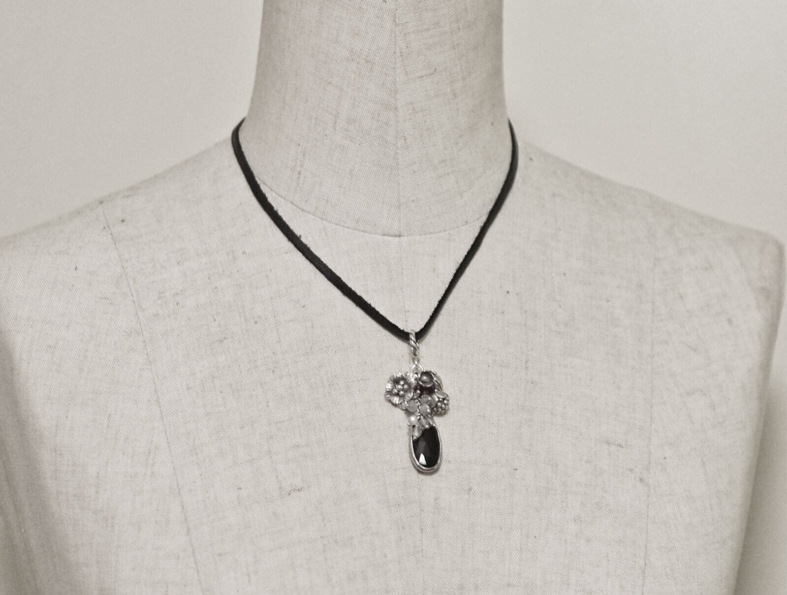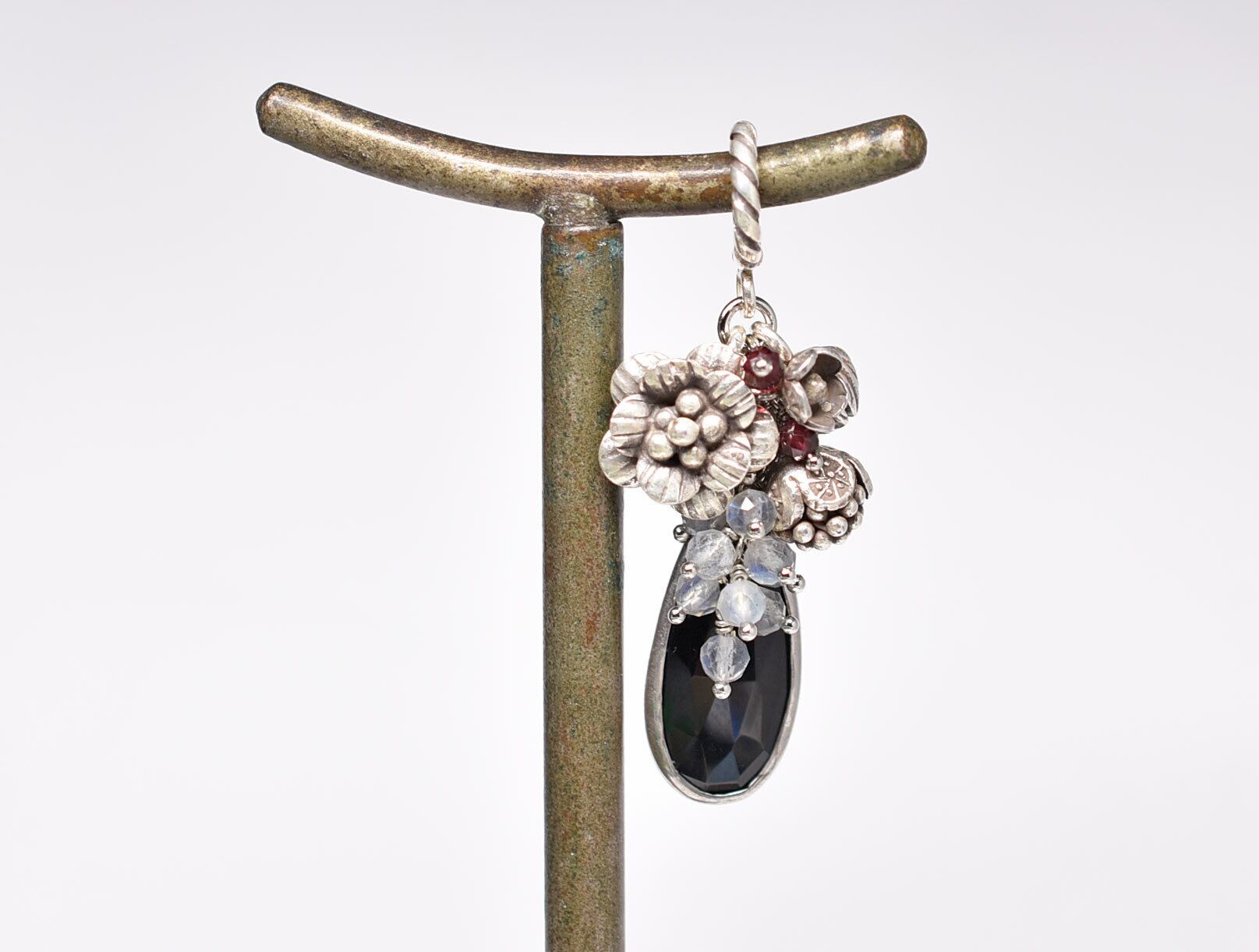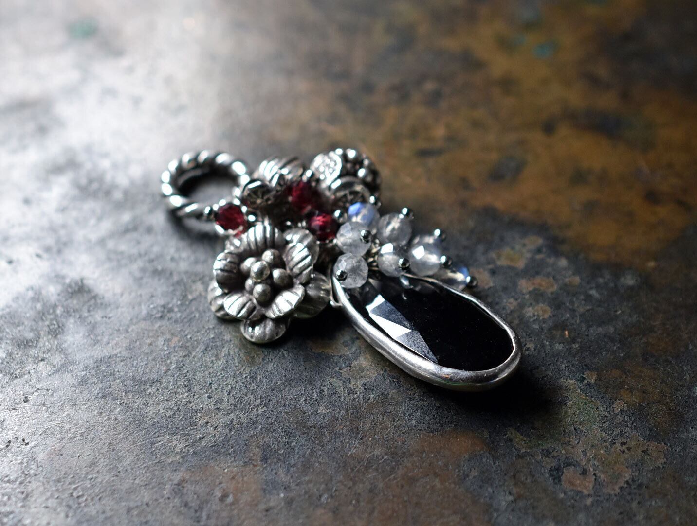 シルバー枠オニキスとたわわなラブラドライト、ガーネット、ボタニカルカレンシルバーを繋いだペンダントトップです。