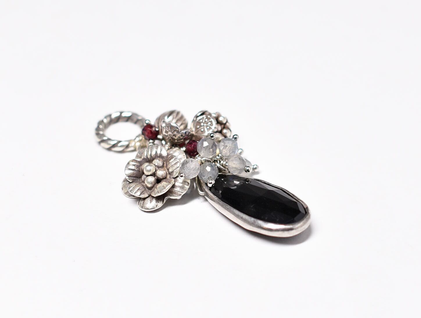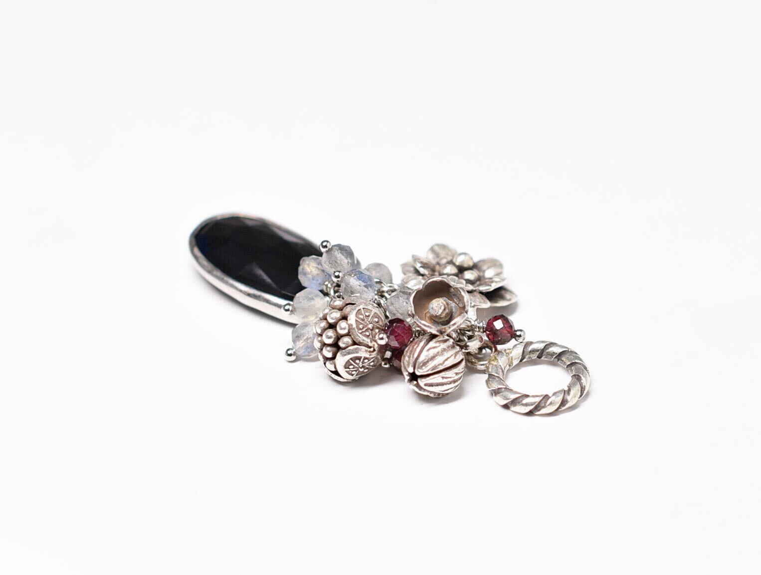 シルバー枠オニキスとたわわなラブラドライト、ガーネット、ボタニカルカレンシルバーのペンダントトップ