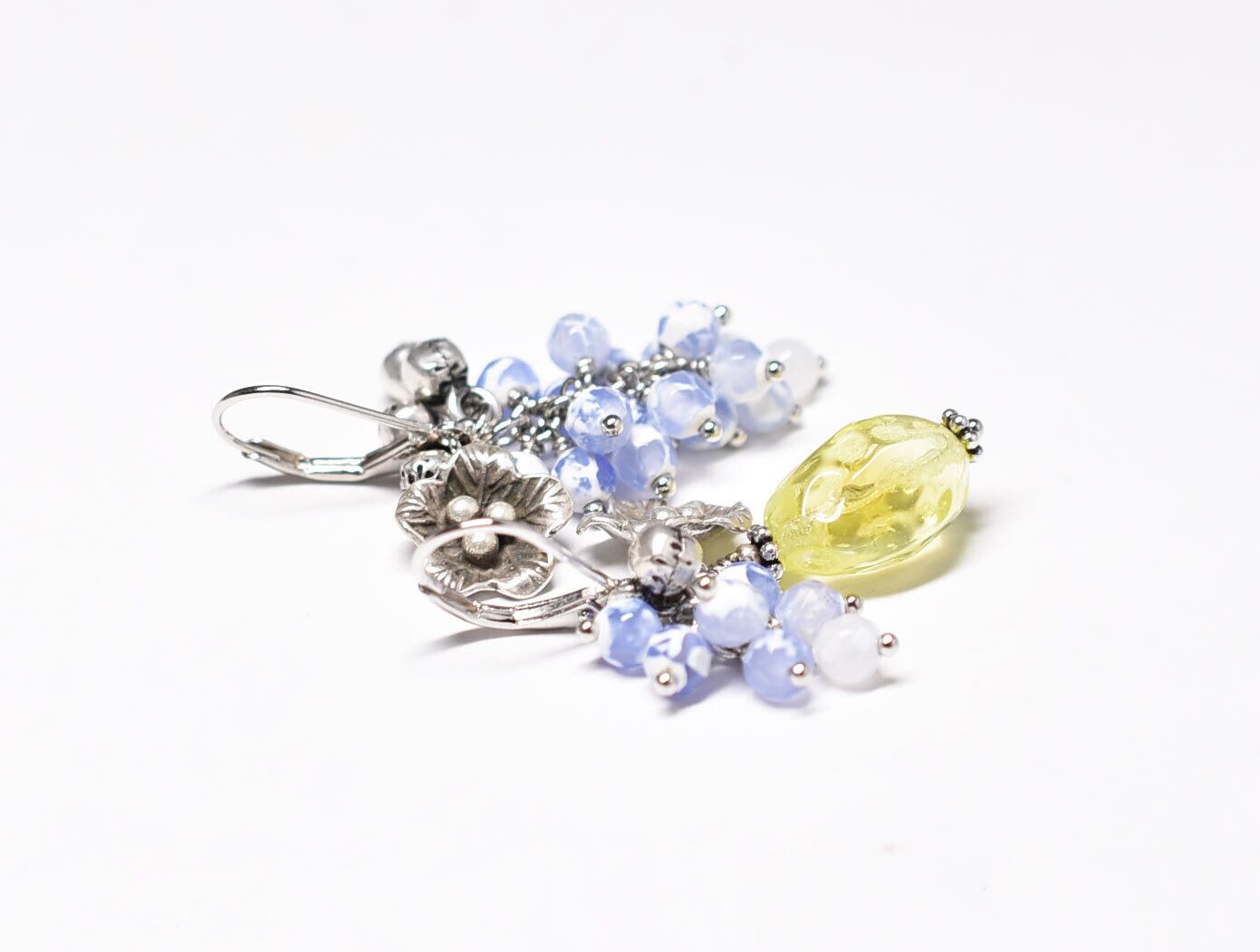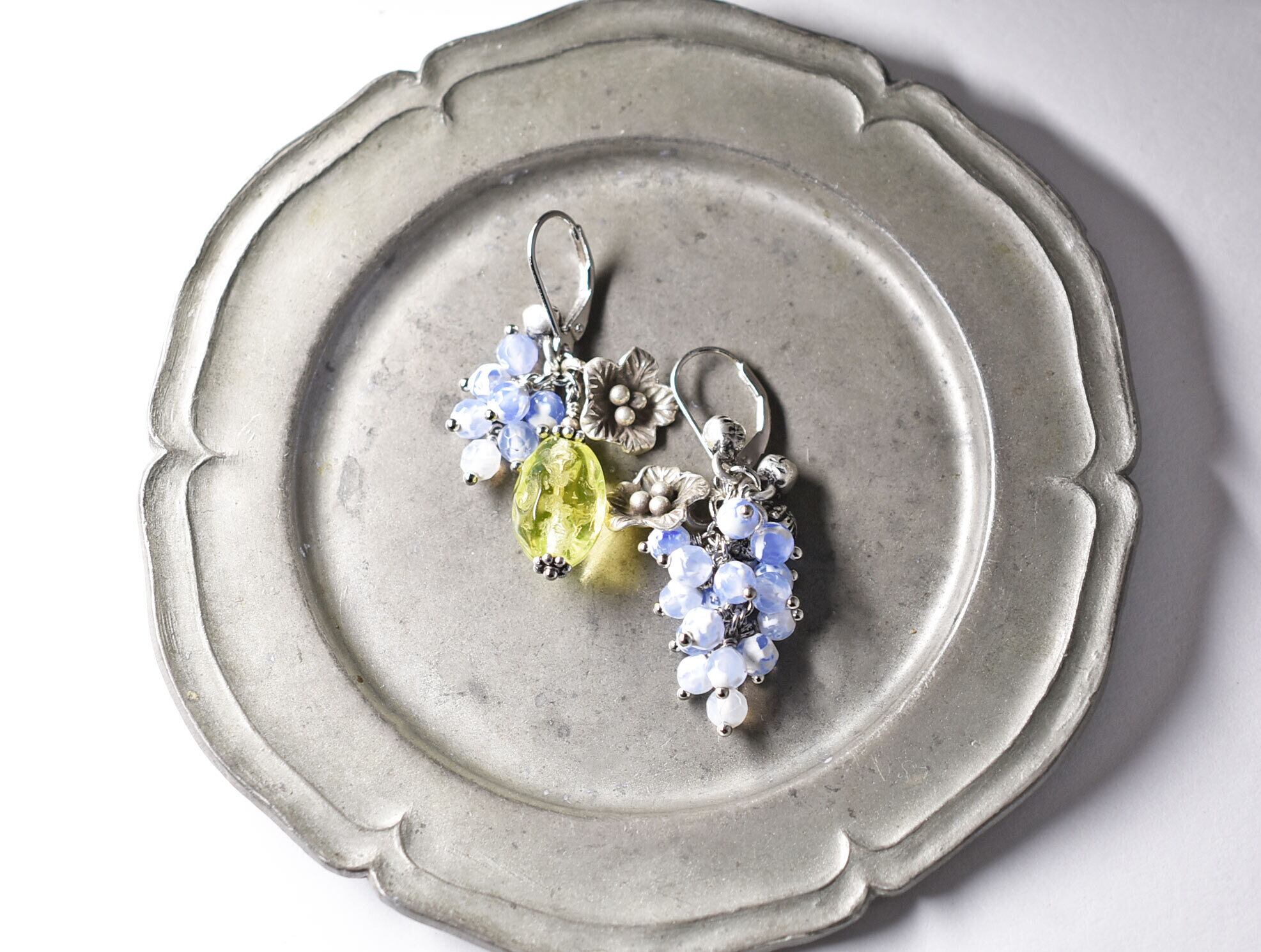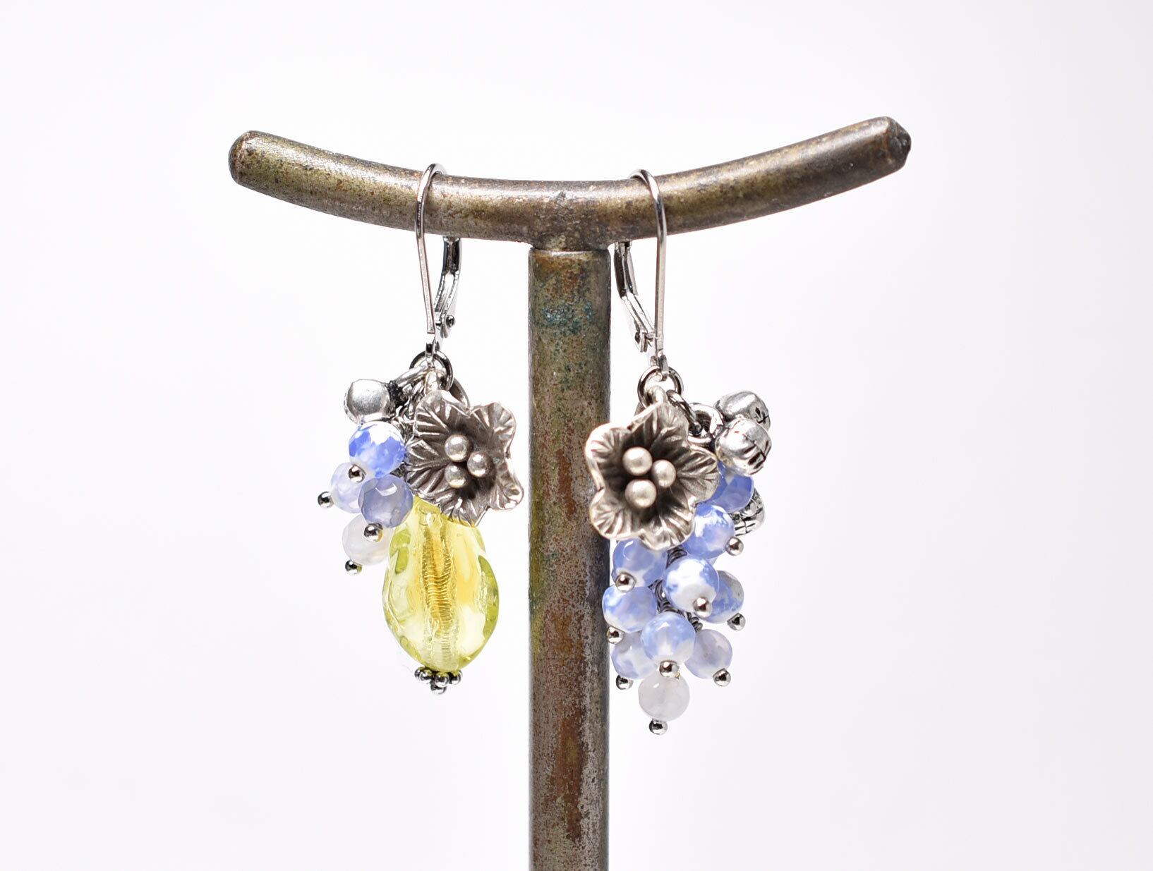 ヴィンテージイエローウランガラスと、たわわなブルー瑪瑙、カレンシルバーのお花、小さな鈴を繋いだアンシメトリーなピアスです。