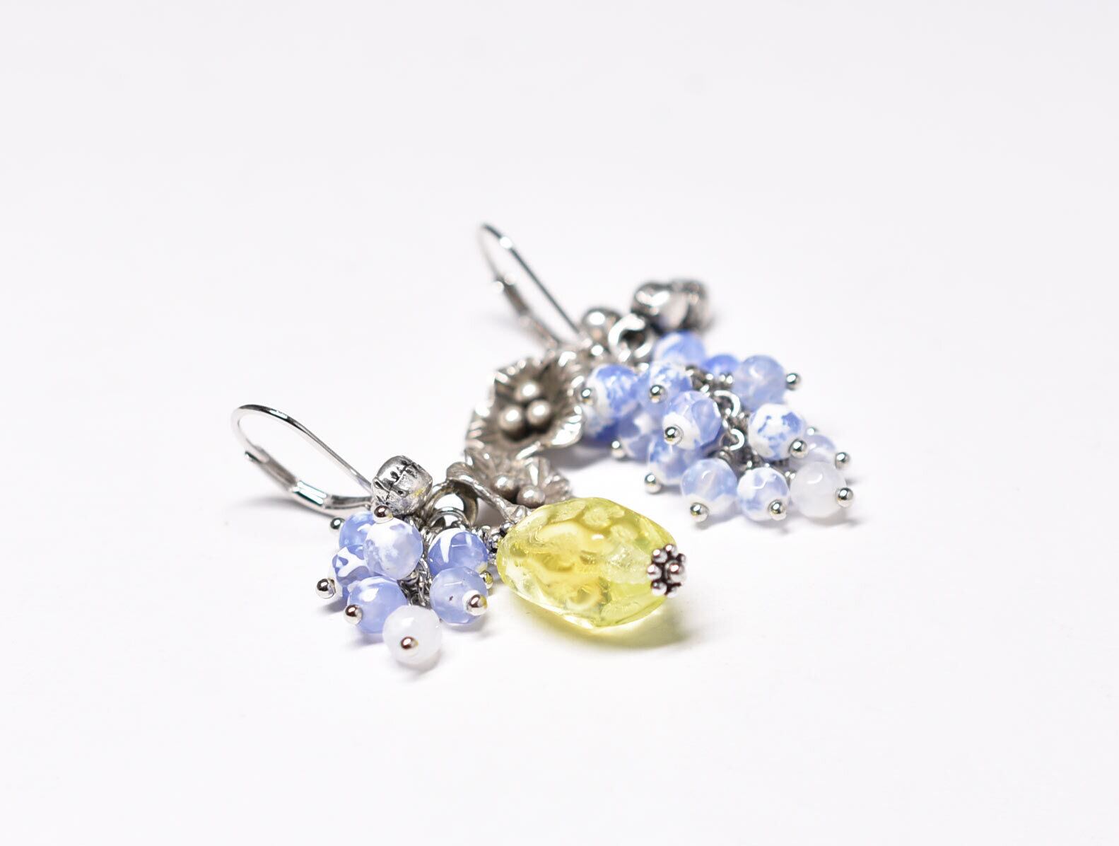 ヴィンテージイエローウランガラスと、たわわなブルー瑪瑙、カレンシルバーのお花、小さな鈴のアンシメトリーピアス