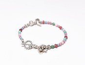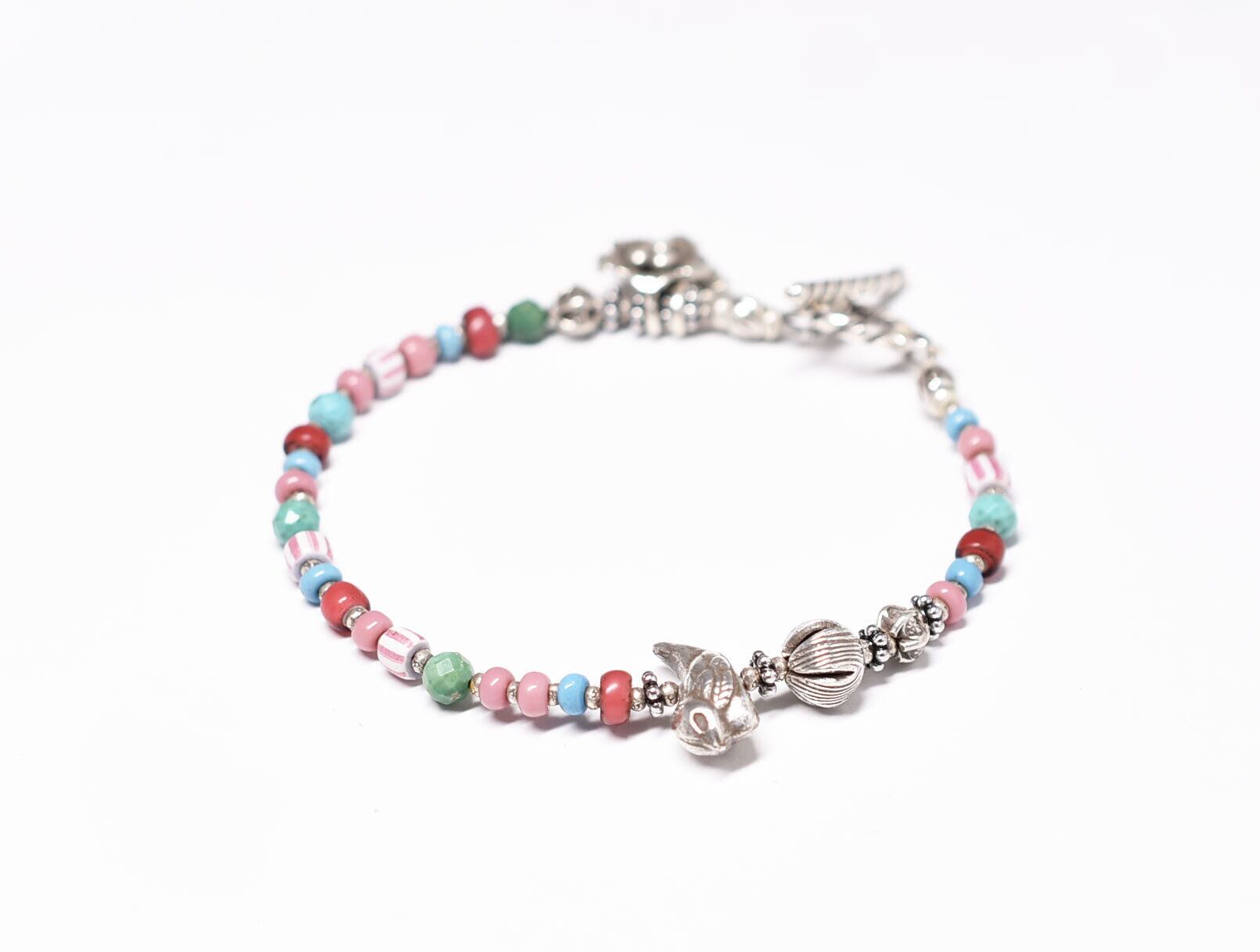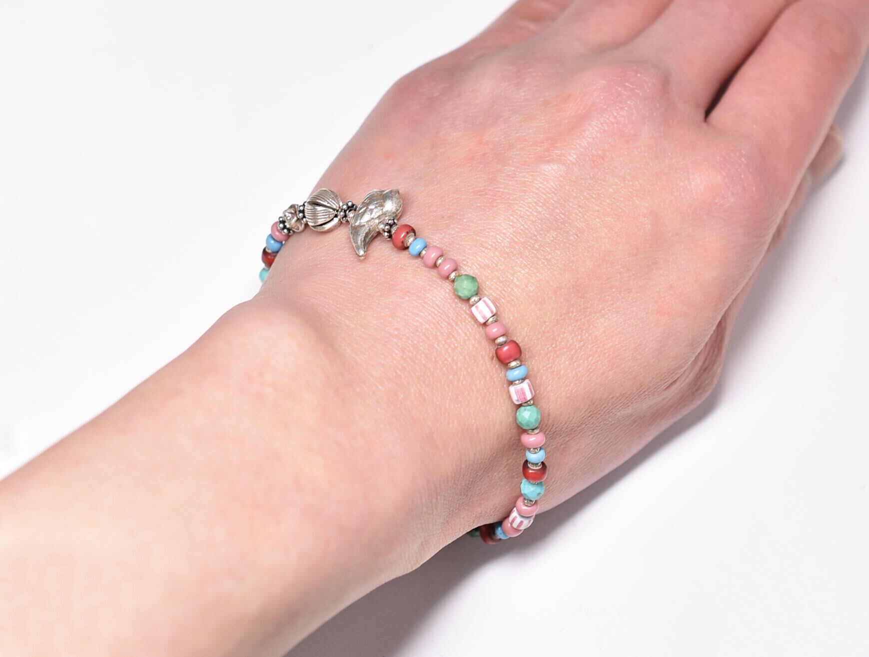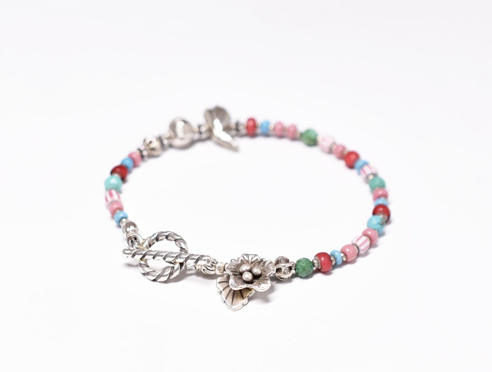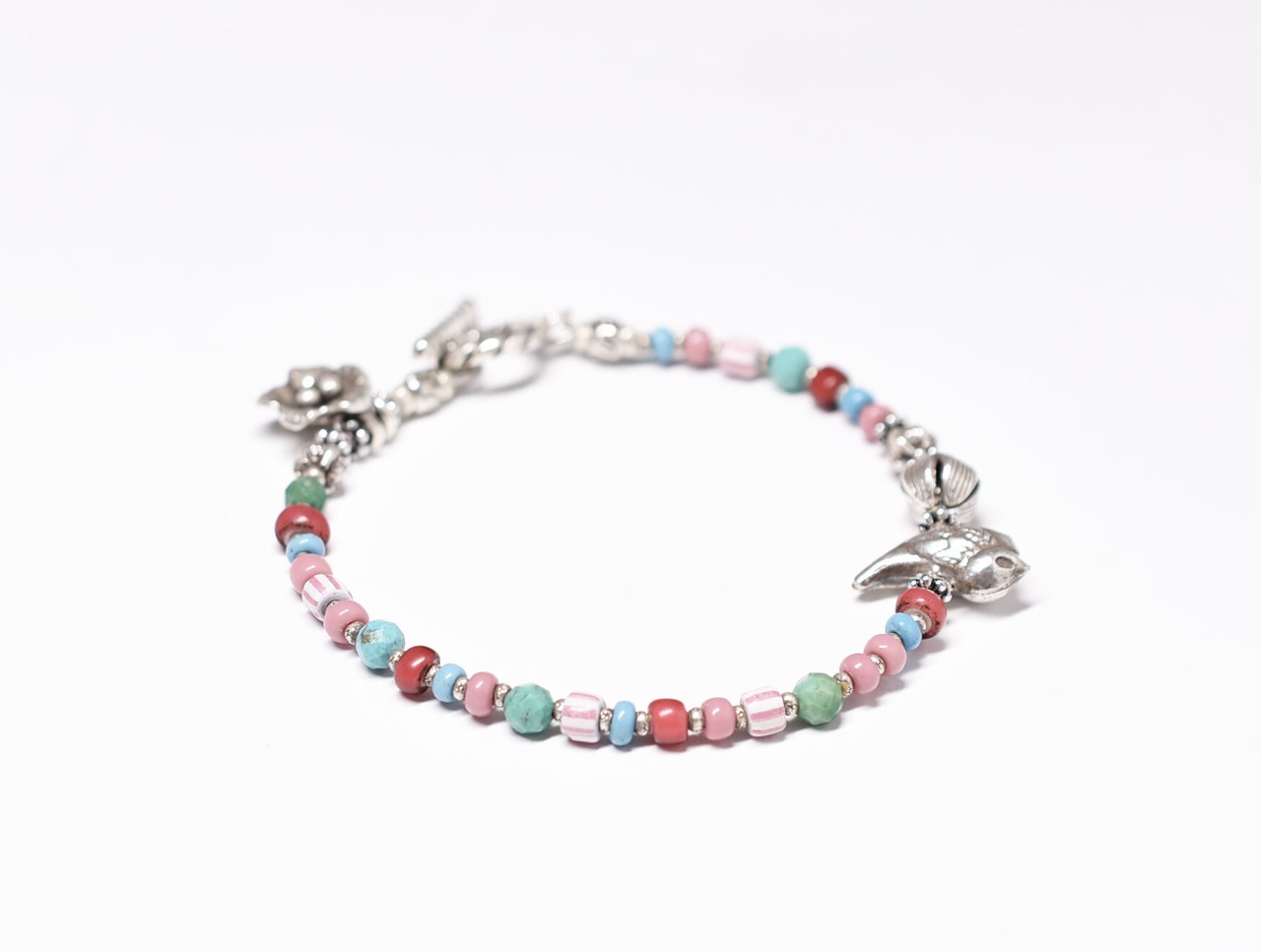 小鳥やボタニカルなカレンシルバー多彩なベネチアビーズとターコイズを繋いだブレスです。