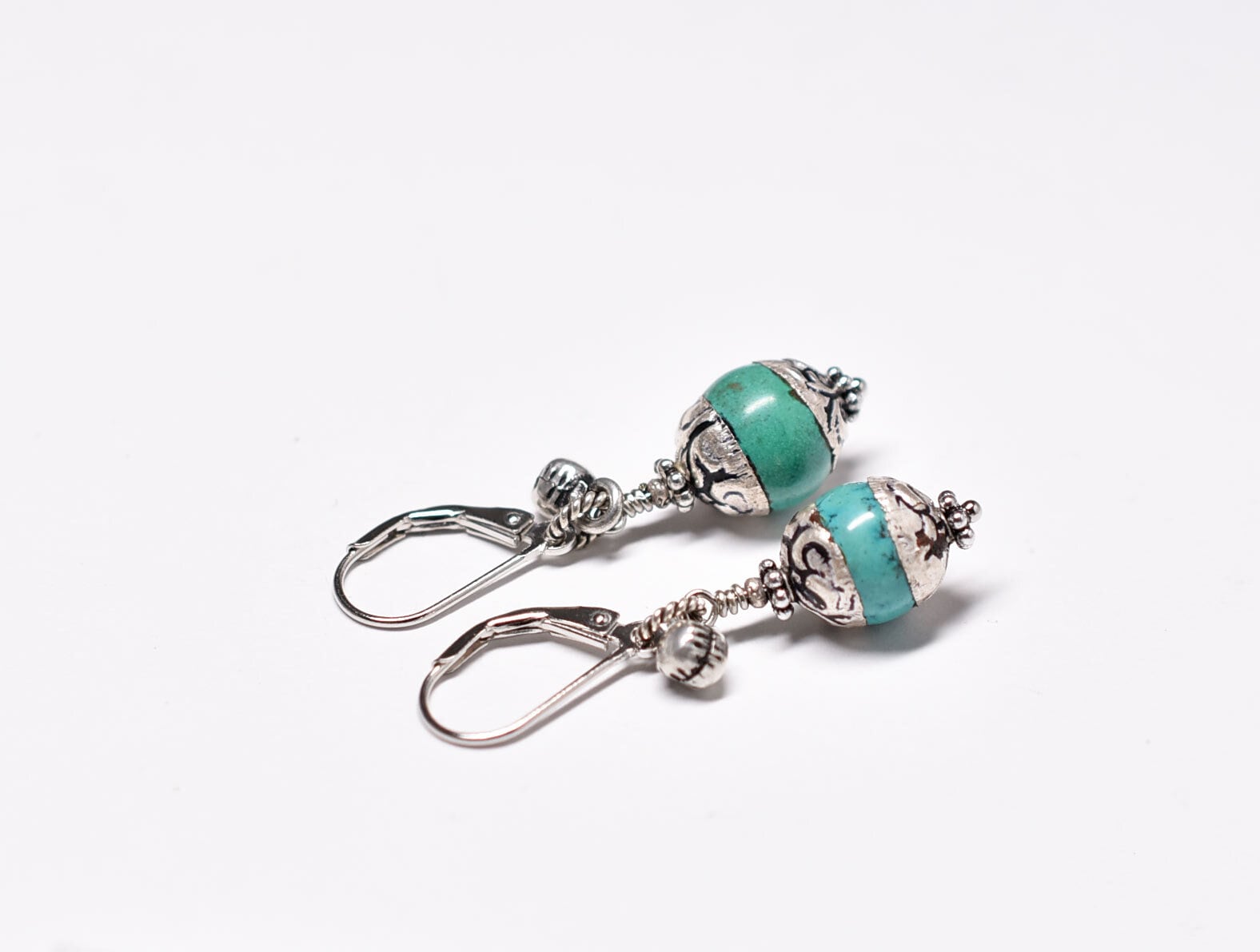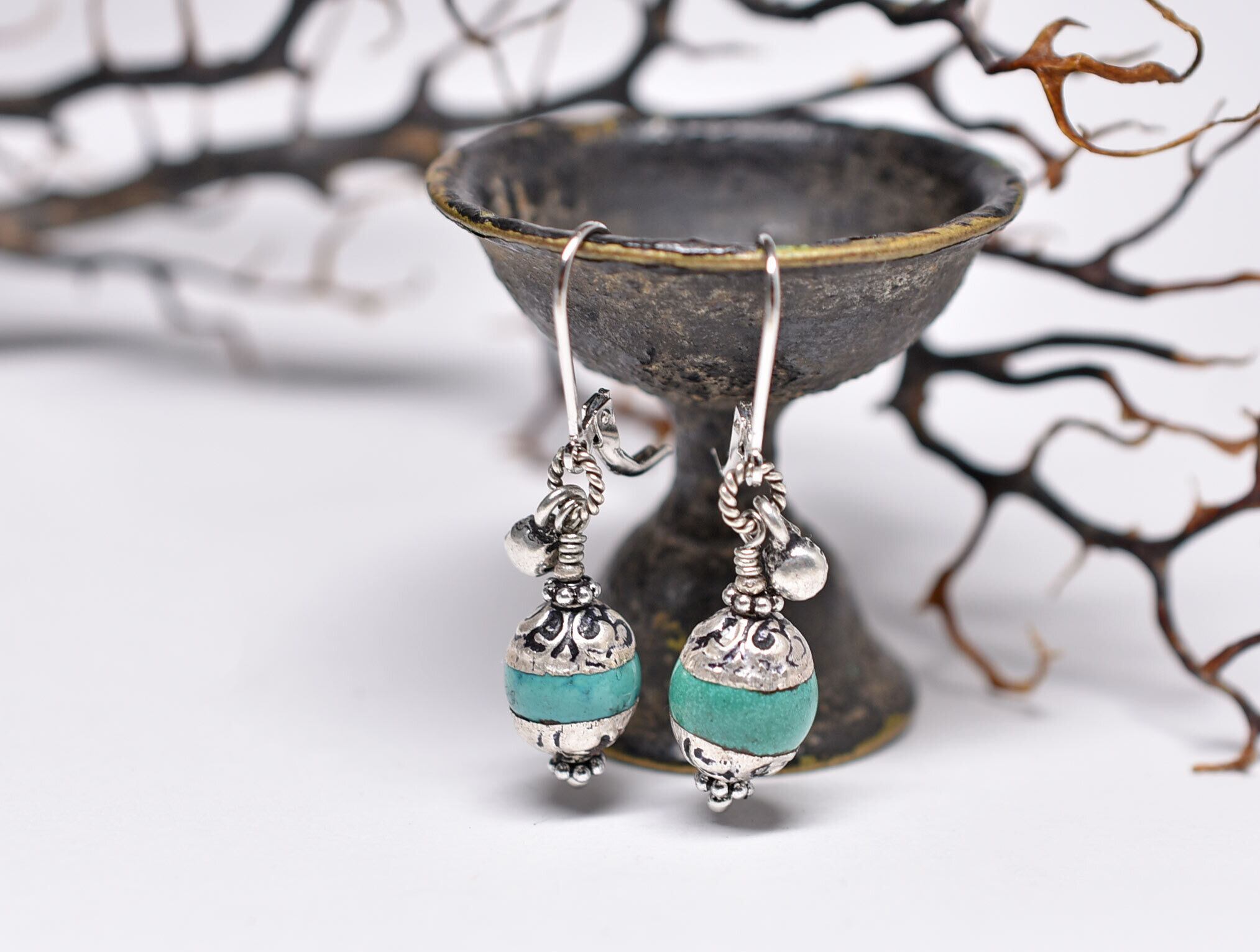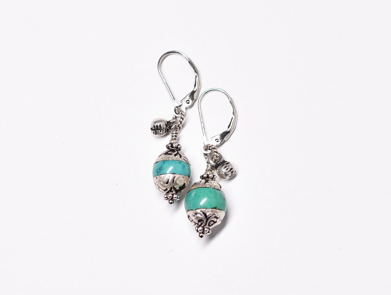 メタル装飾グリーンターコイズカラービーズと小さなインド鈴のピアス