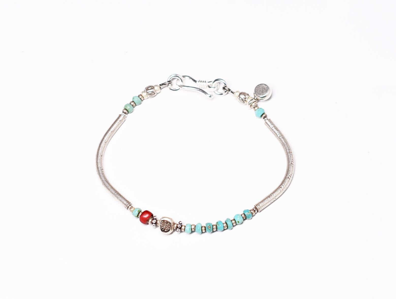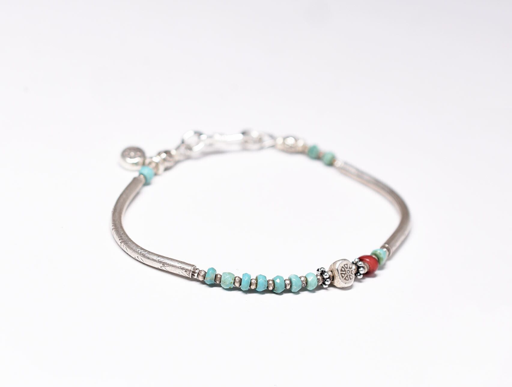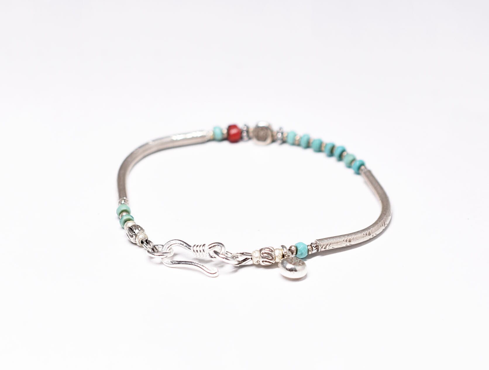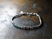 湾曲カレンシルバーとキングマンターコイズ、金赤ホワイトハーツを繋いだ華奢なブレスです。