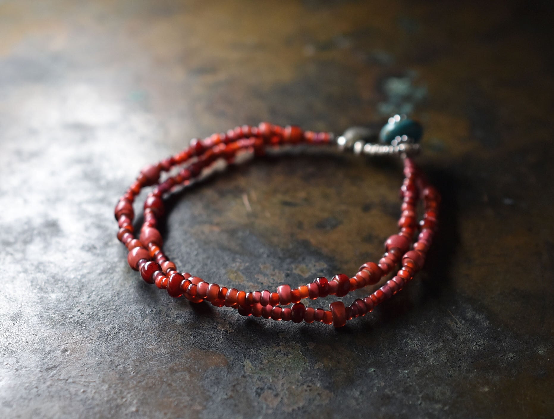 赤色のビーズはホワイトハーツと呼ばれるアンティークビーズです。芯(ハート)部分が白いことからこう呼ばれています。こちらは19~20世紀頃のベネチア産のビーズです。