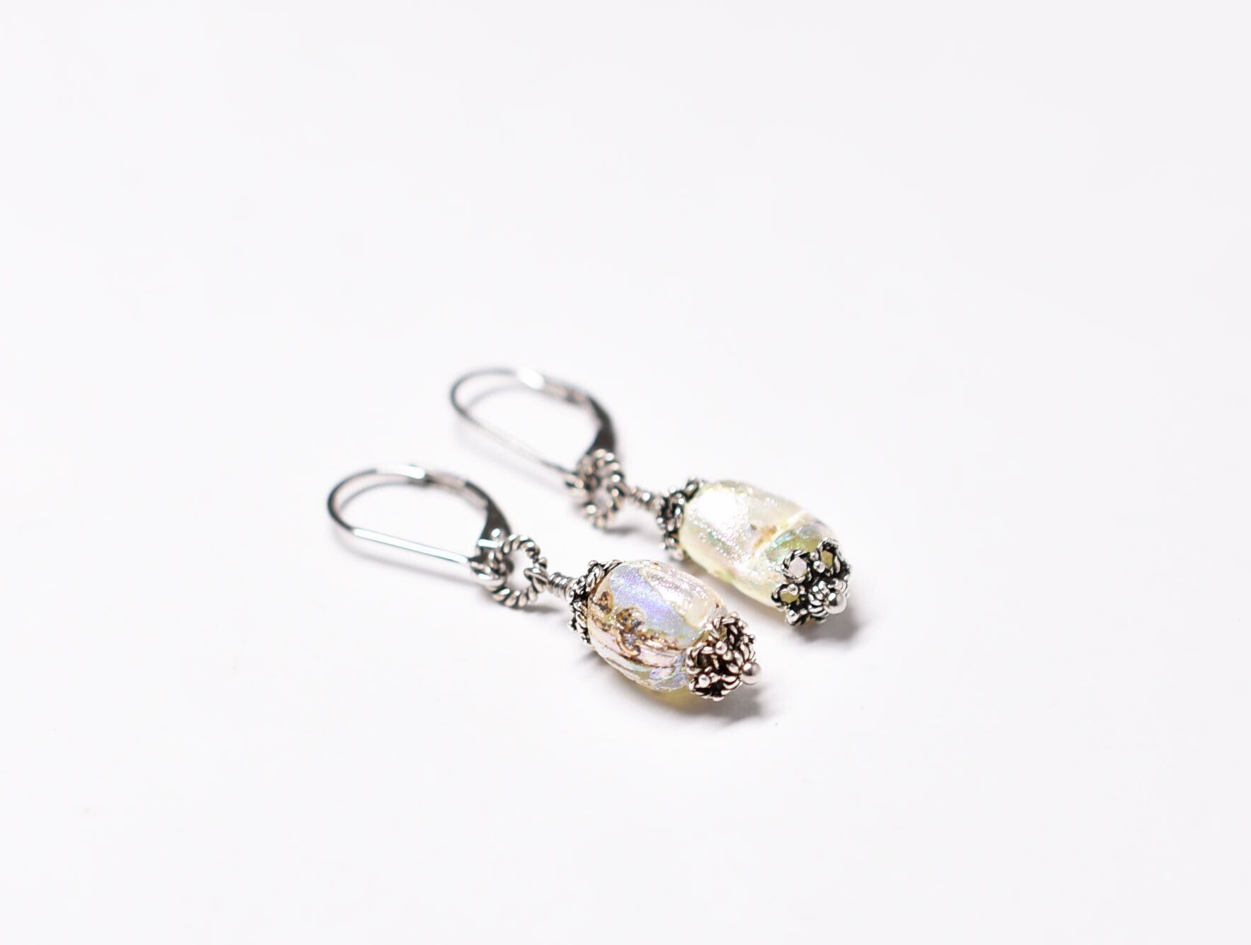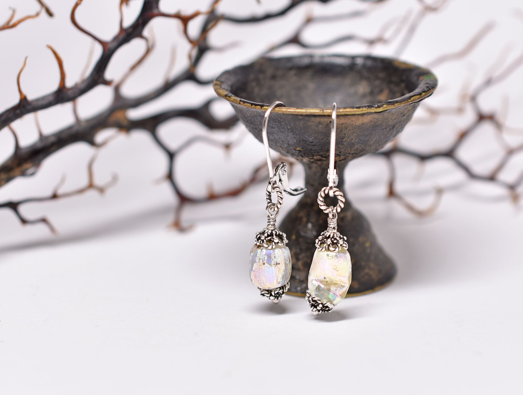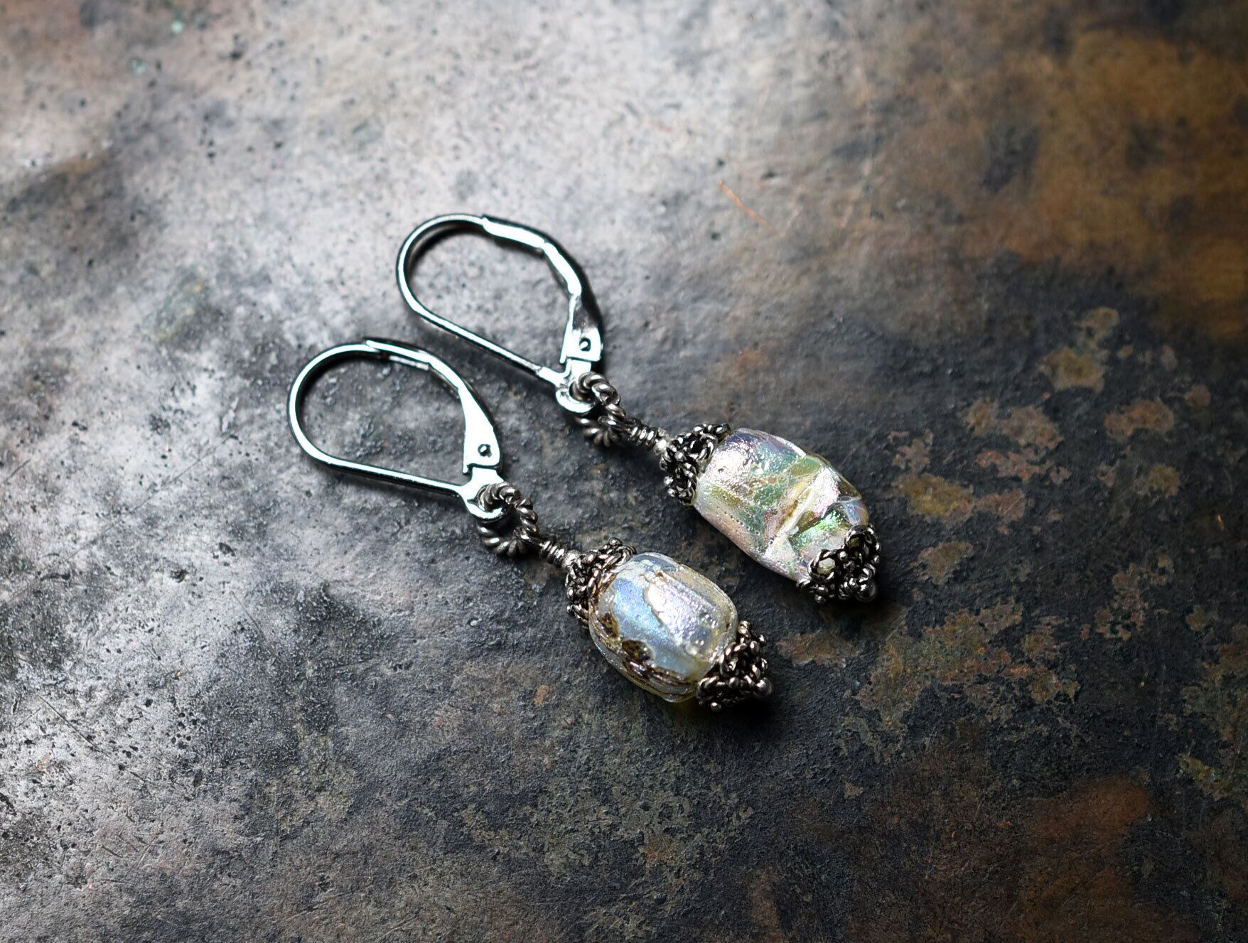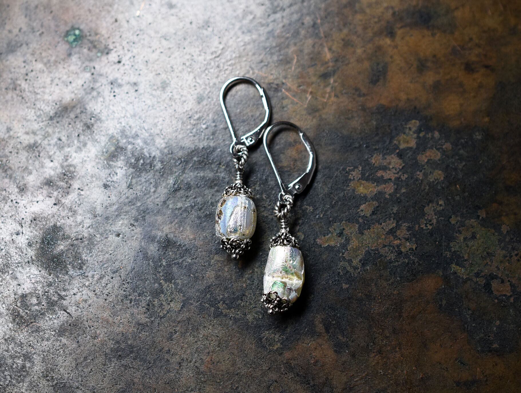 パールの様な美しい輝きの銀化ローマングラスビーズのピアス