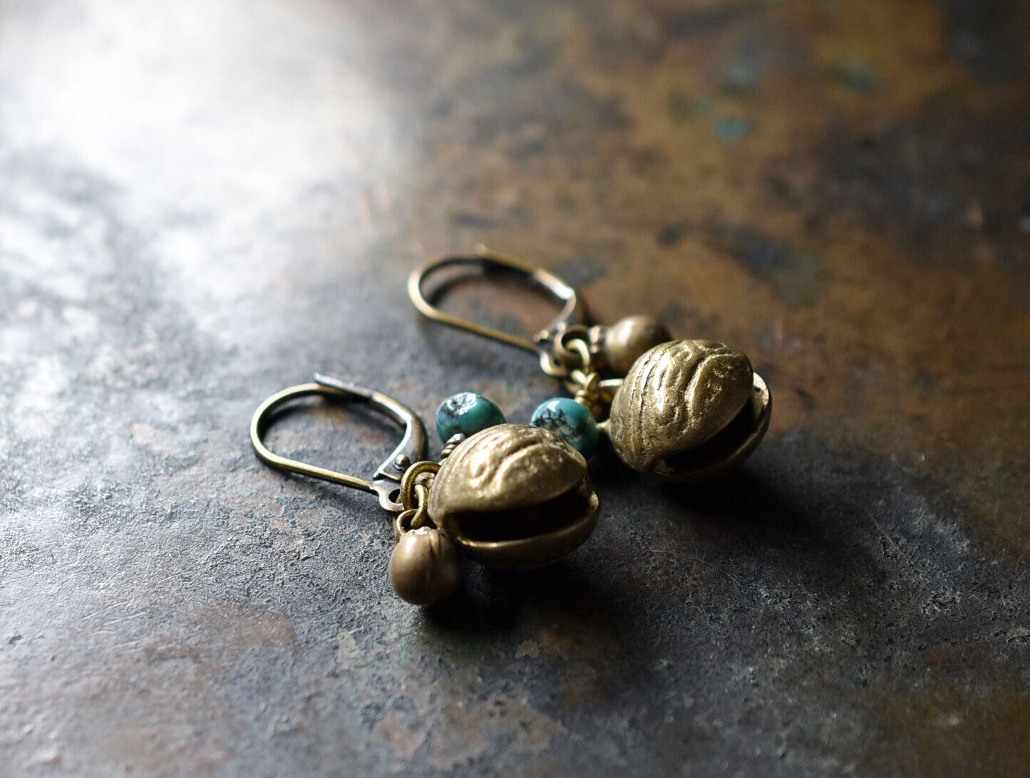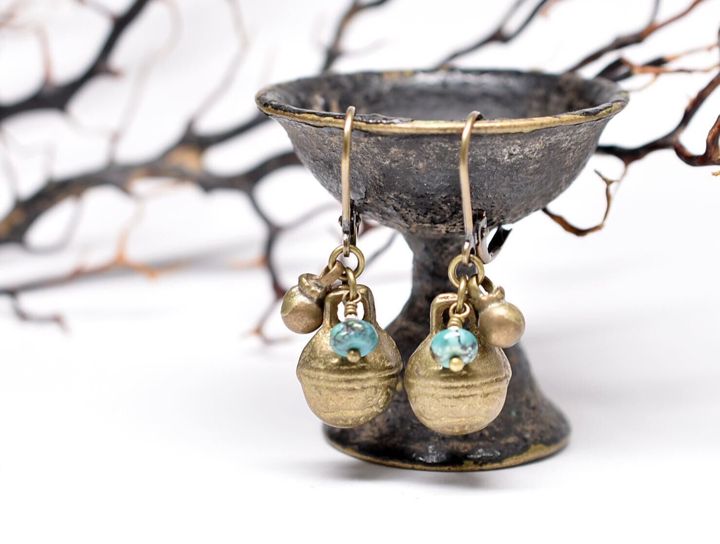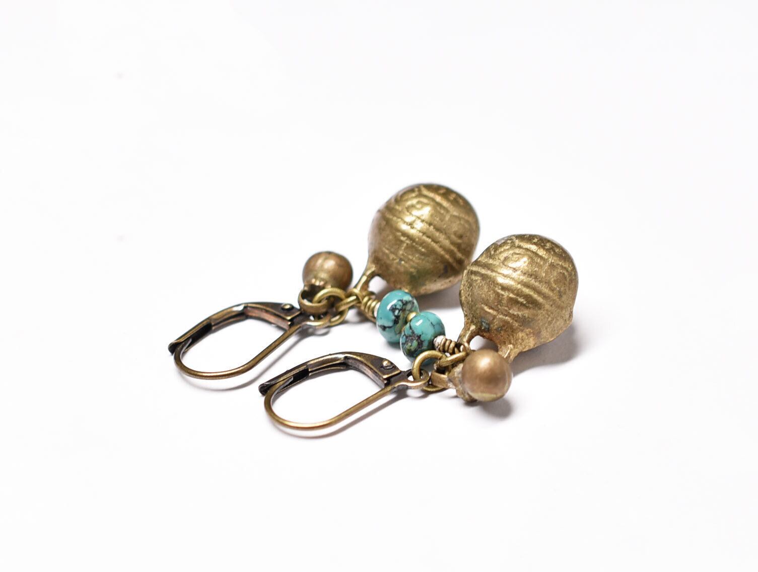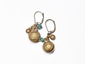 デッドストックベルと民族鈴、チベタンターコイズを繋いだピアスです。