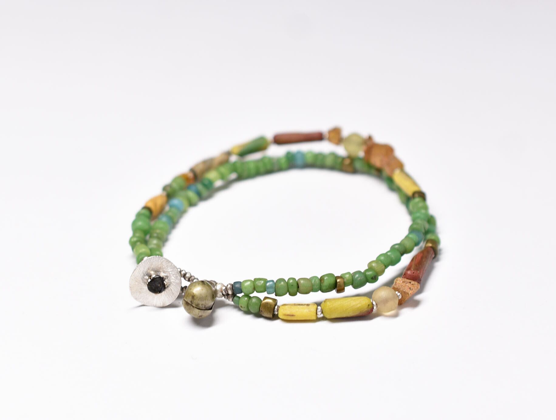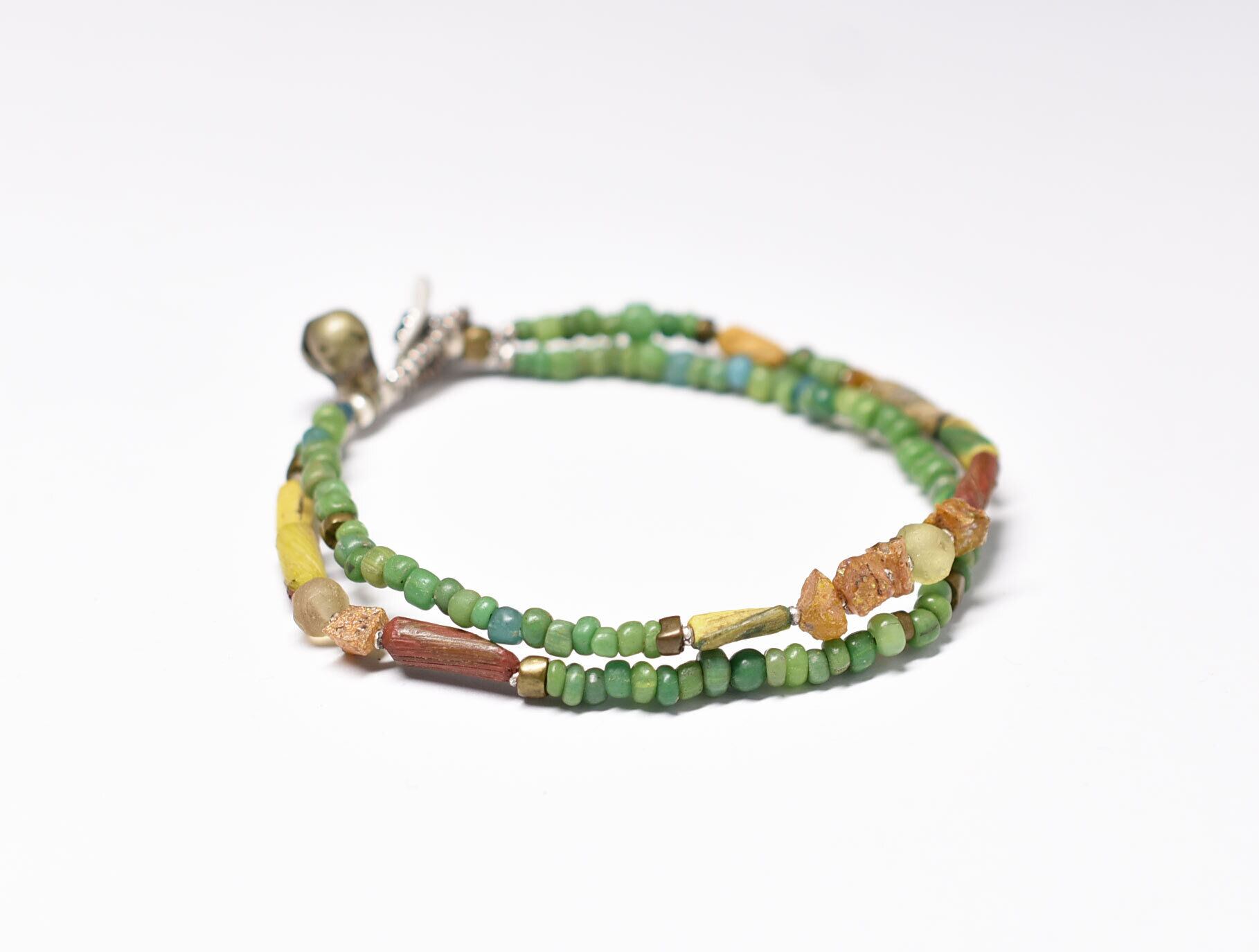 翡翠色のアンティークビーズと、様々なローマングラスを繋いだ2連のブレスです。