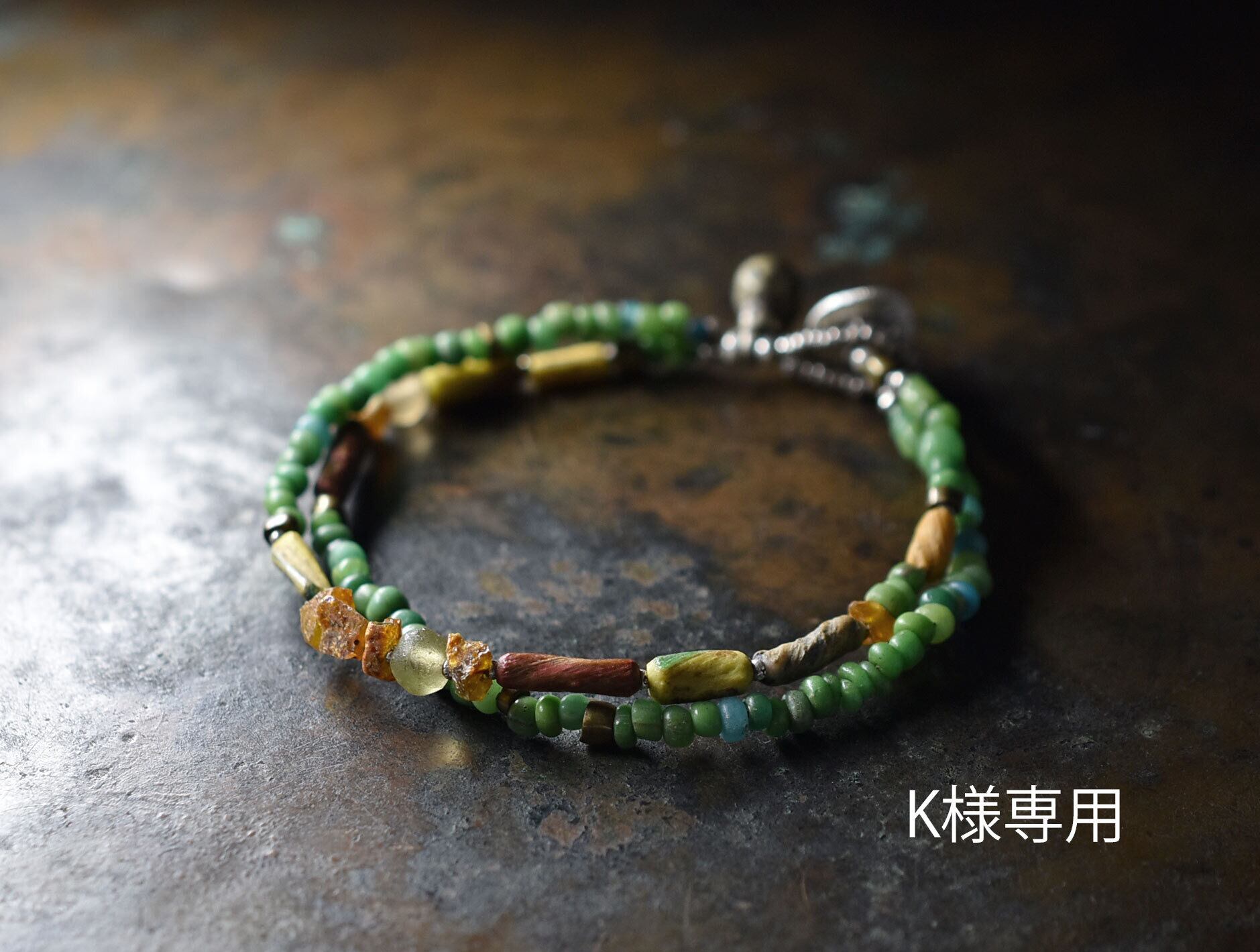 「K様専用」翡翠色アンティークビーズと枯葉色ローマングラスの2連ブレス