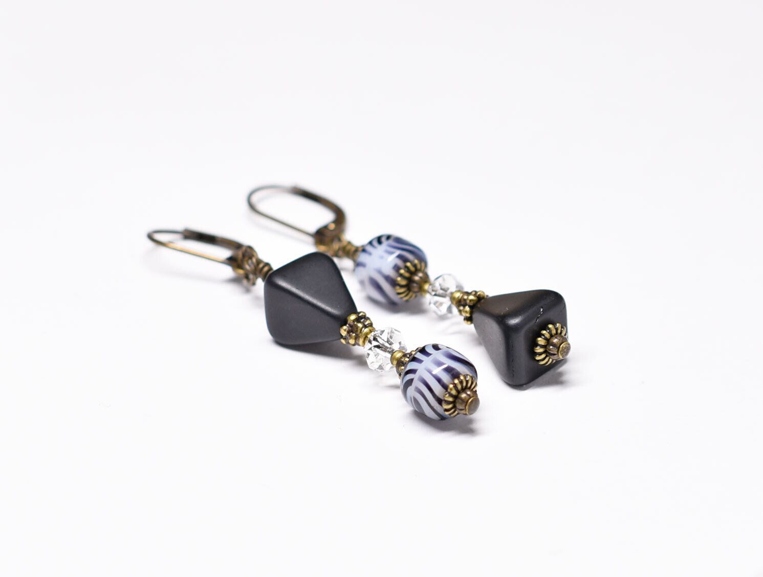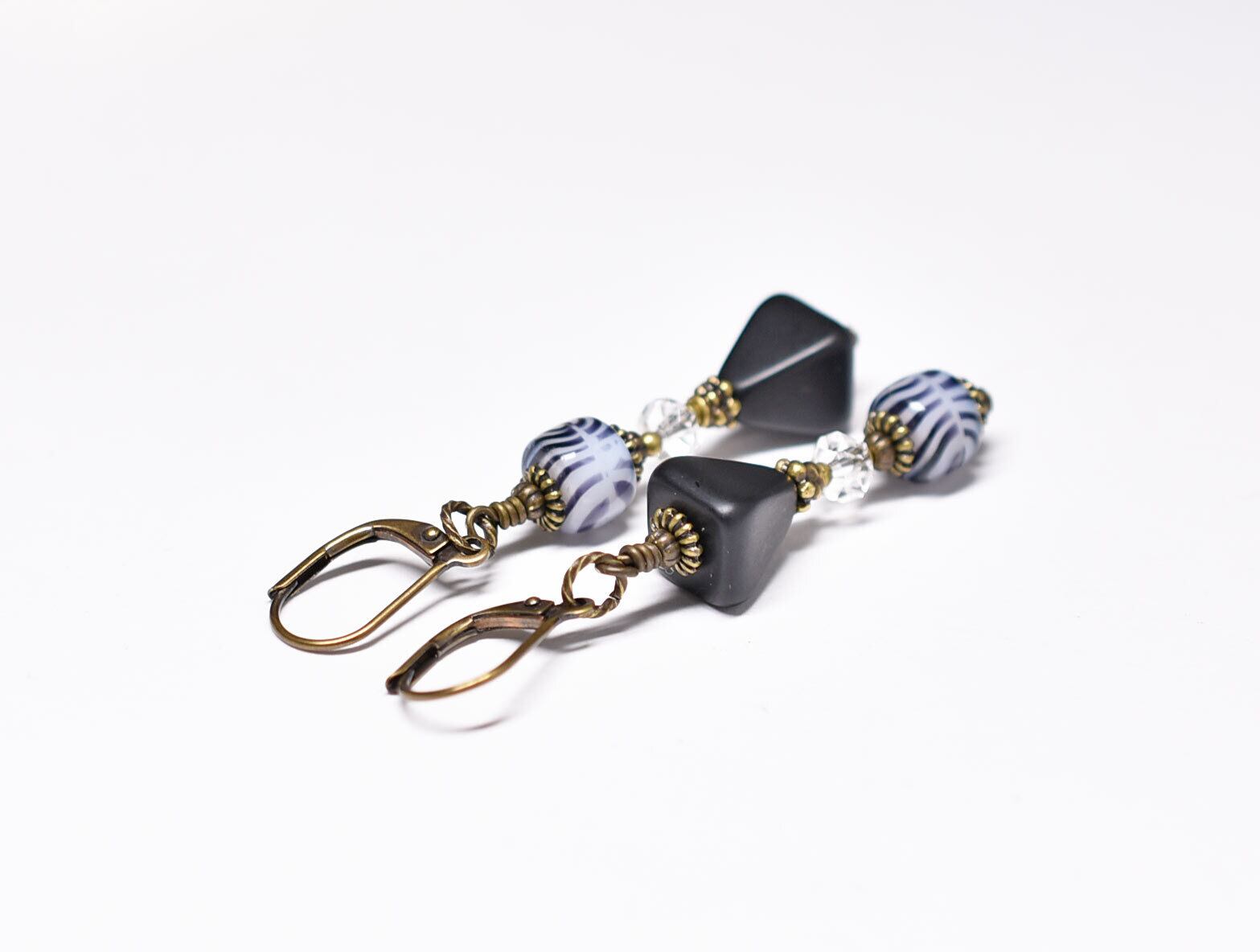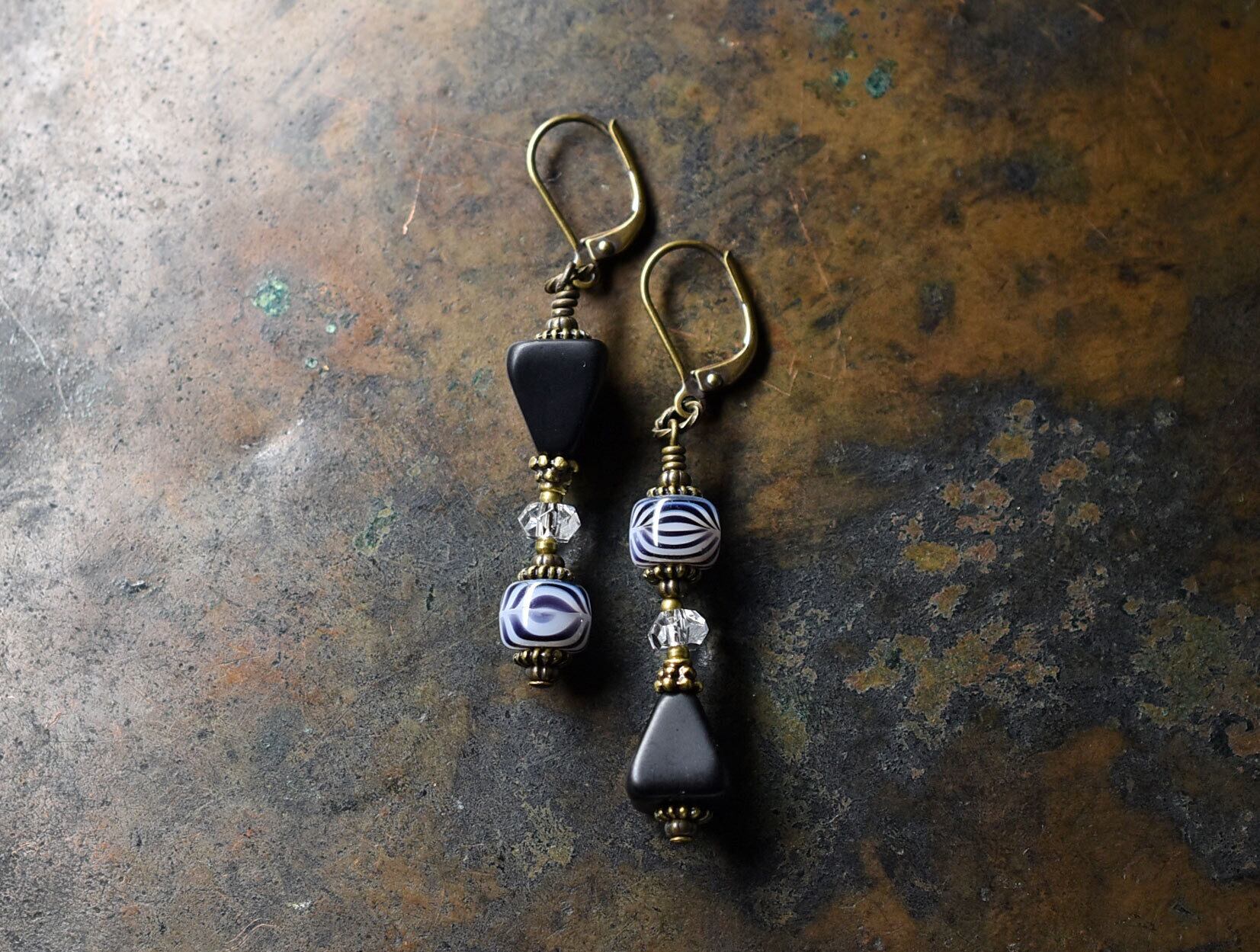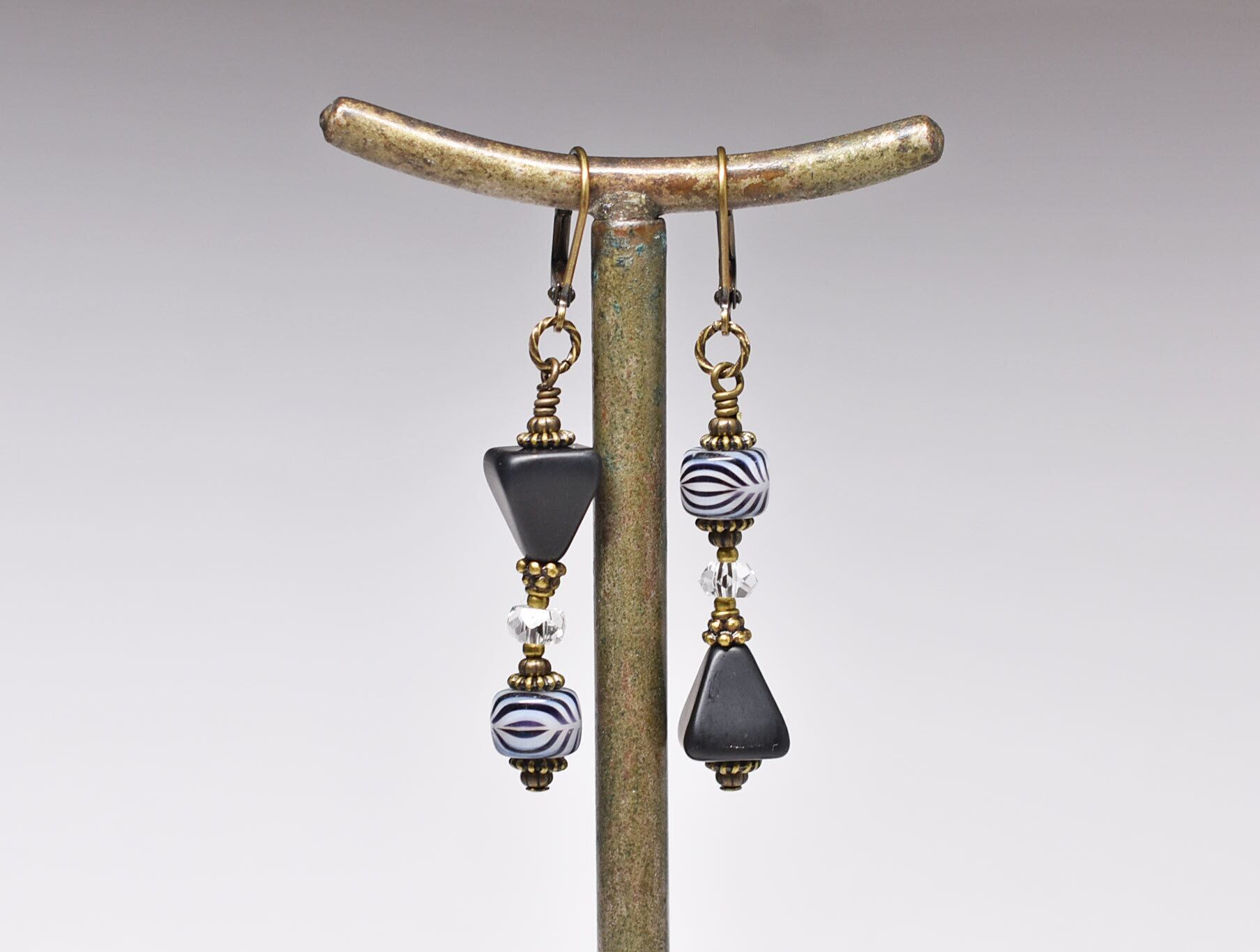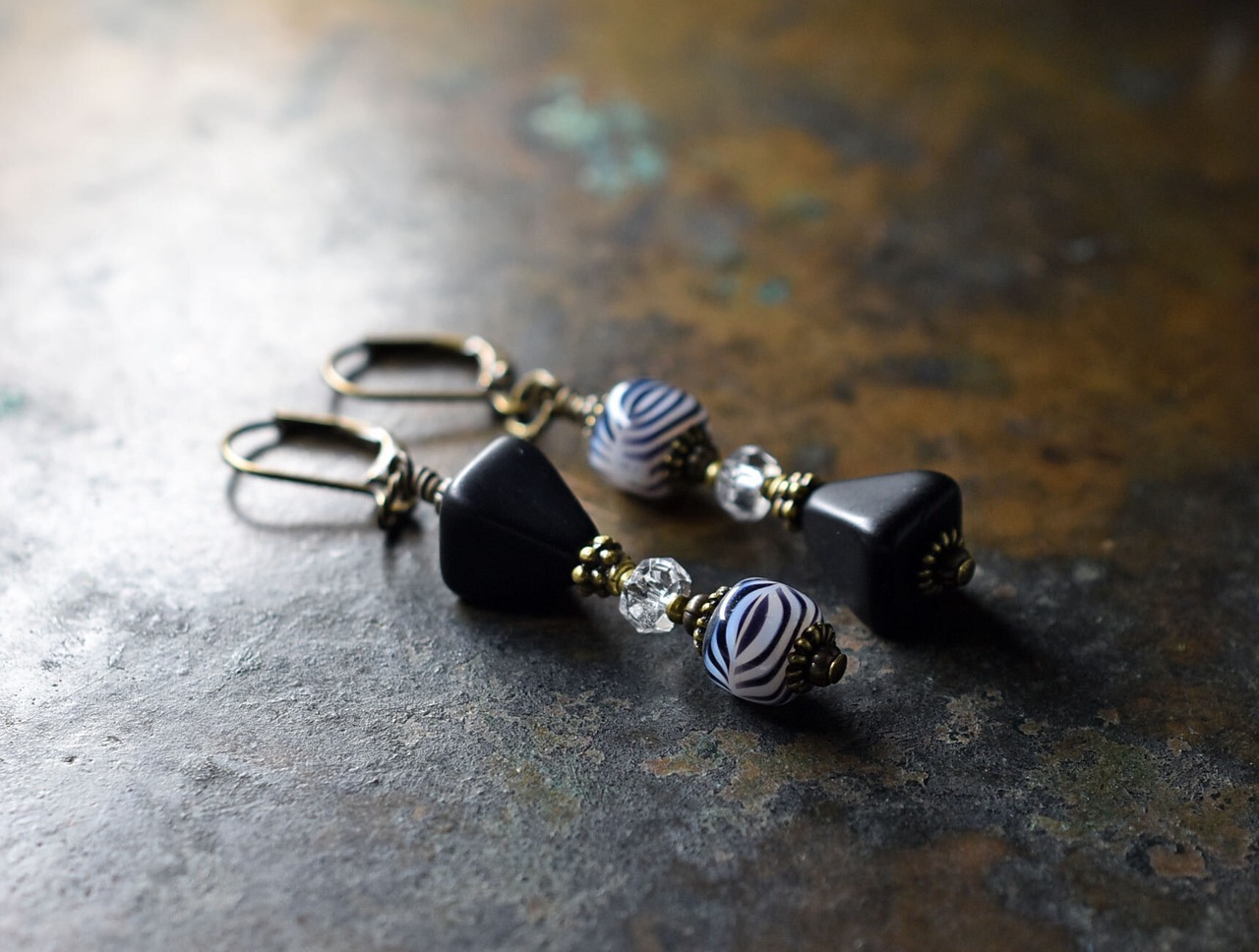 ゼブラ柄&漆黒ヴィンテージビーズ、クォーツのアンシメトリーピアス