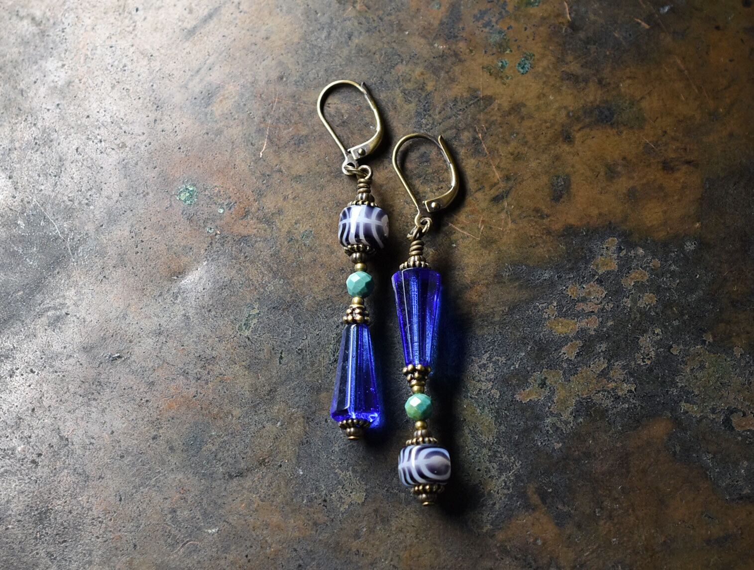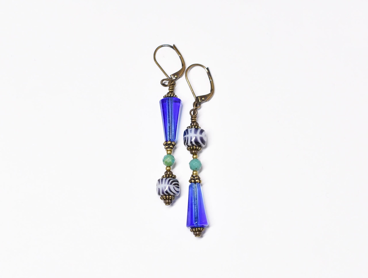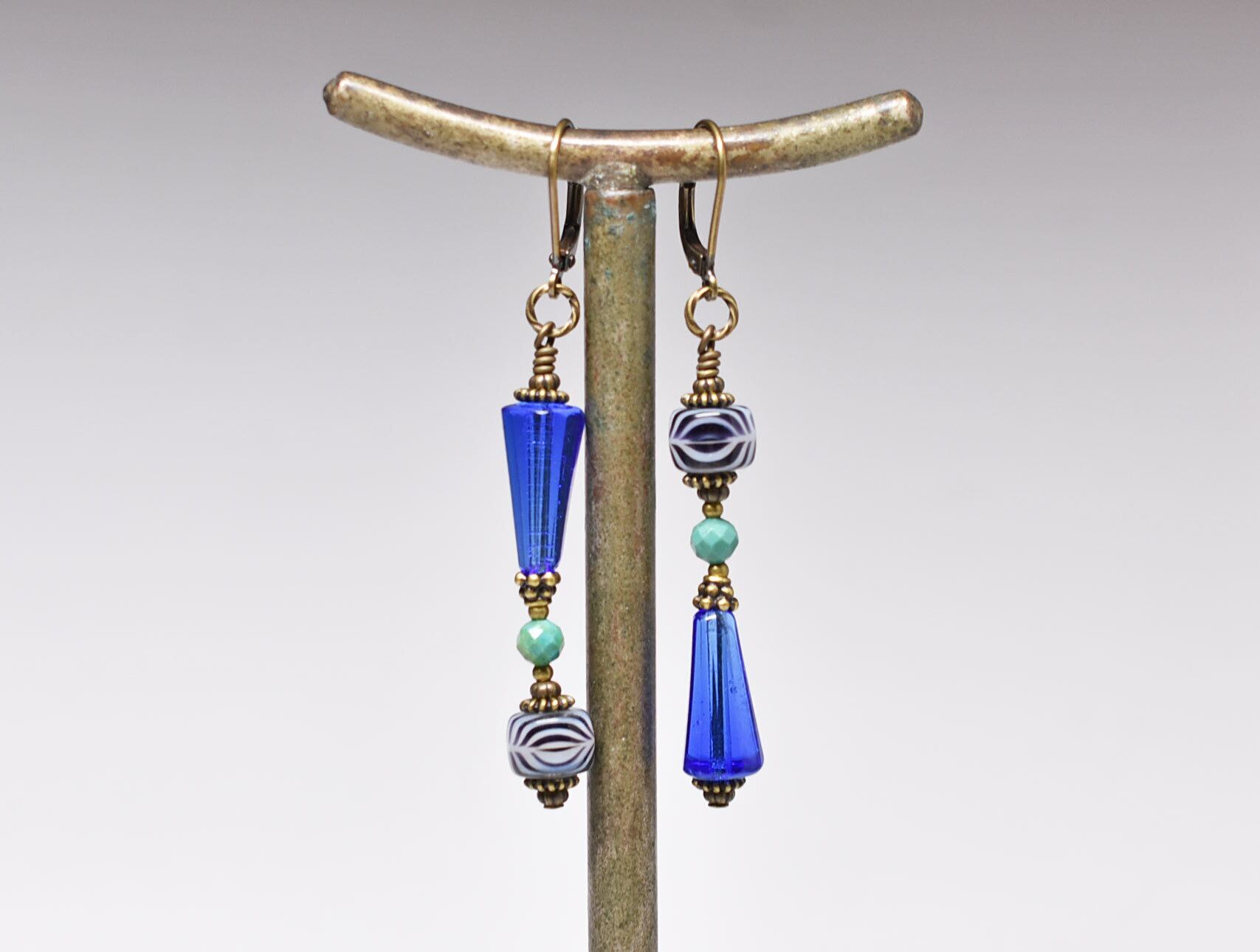 ゼブラ柄と、鮮やかなブルーのビーズはヴィンテージのチェコ産のガラスビーズです。