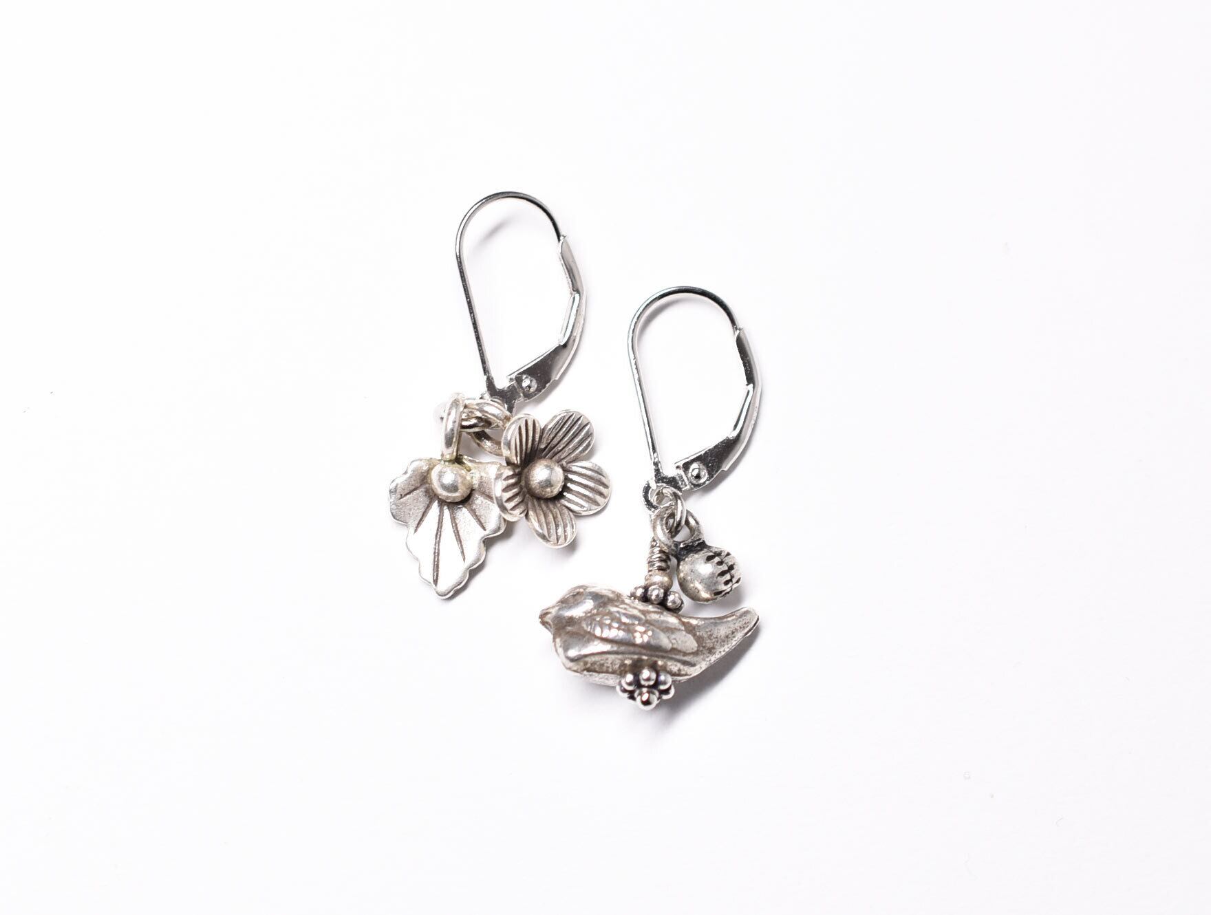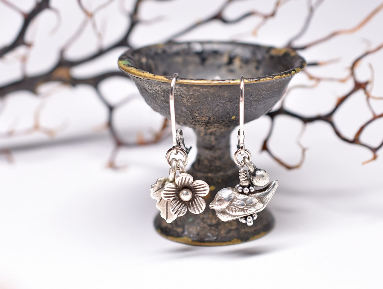 小鳥とお花、葉っぱのカレンシルバー、インドシルバーの鈴を繋いだピアスです。
