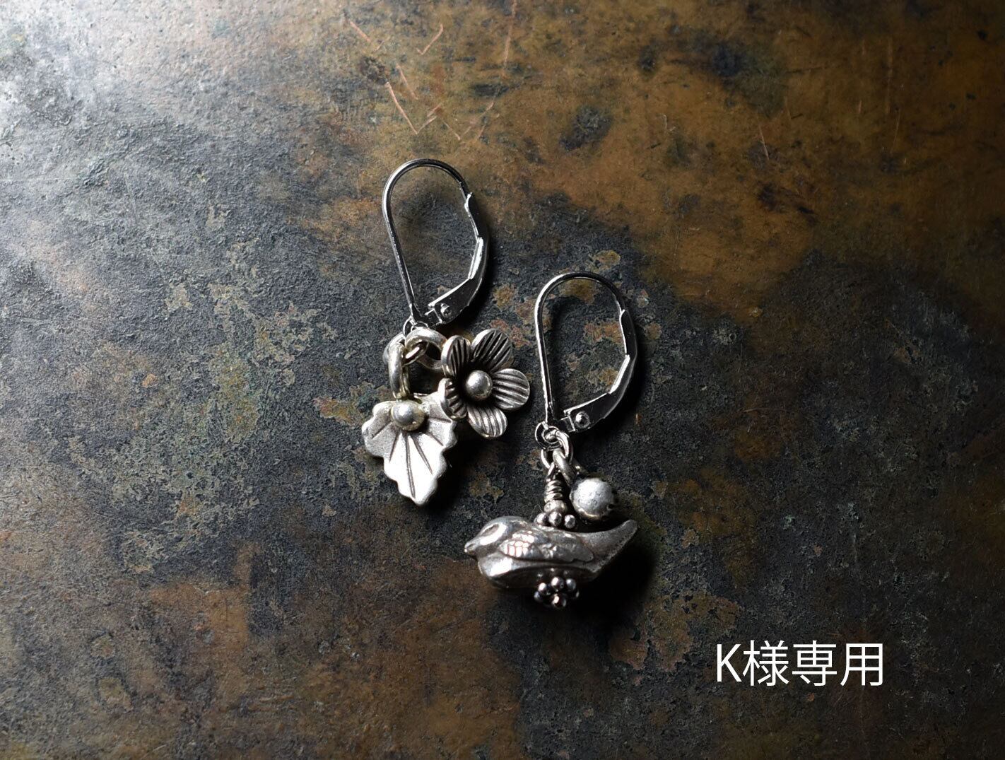 「K様専用」小鳥とお花、葉っぱのカレンシルバー、インドシルバーの鈴のピアス
