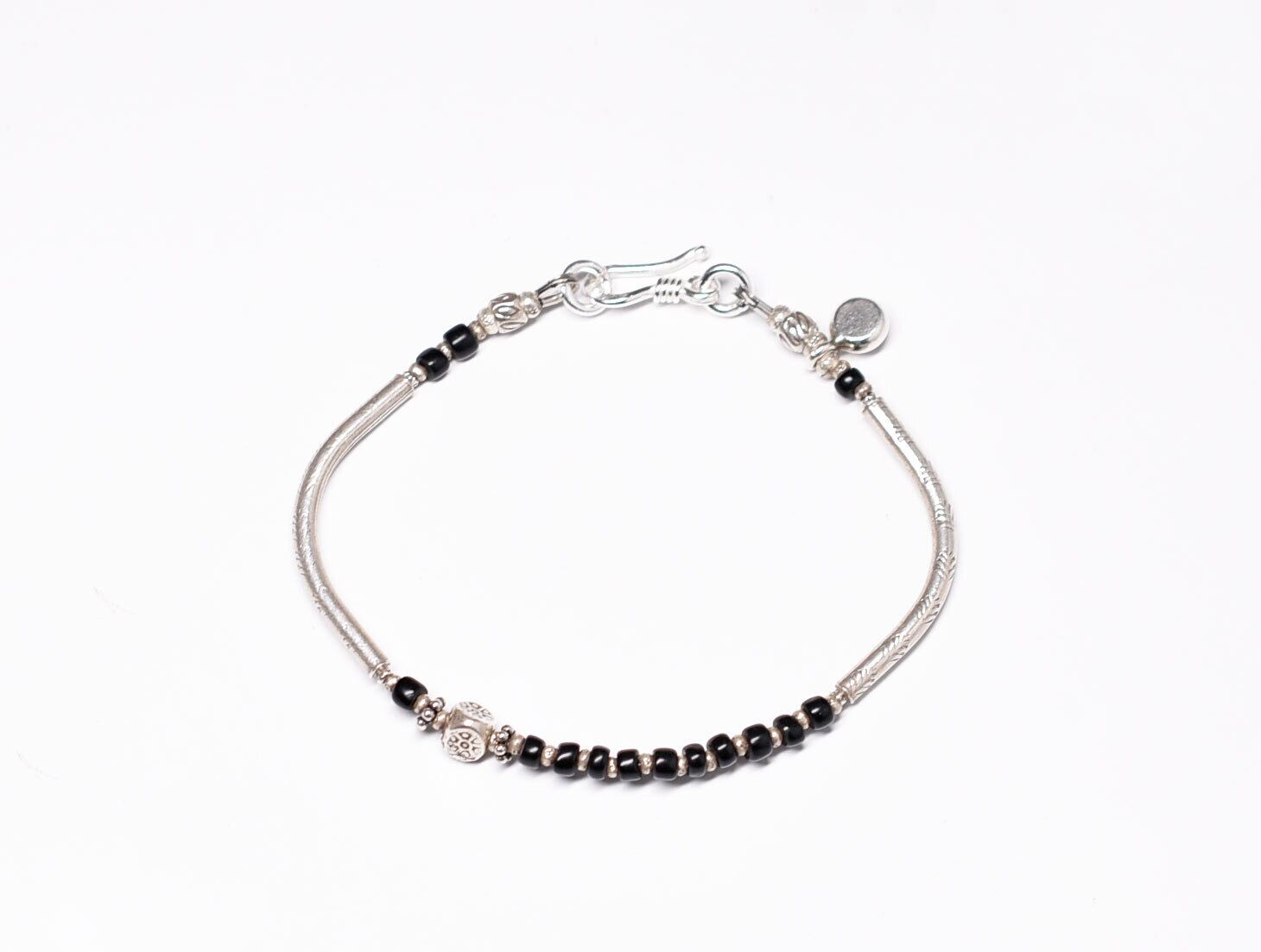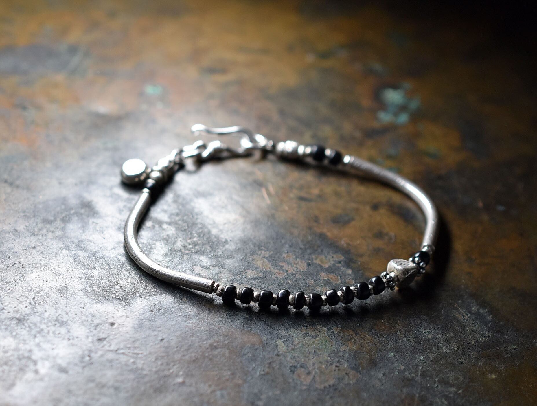 湾曲カレンシルバーヴェネチアアンティーク漆黒ビーズを繋いだ華奢なブレスです。