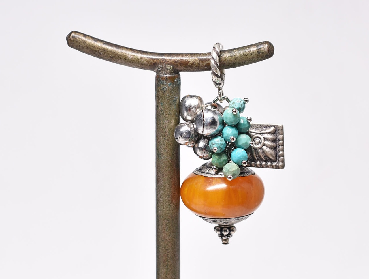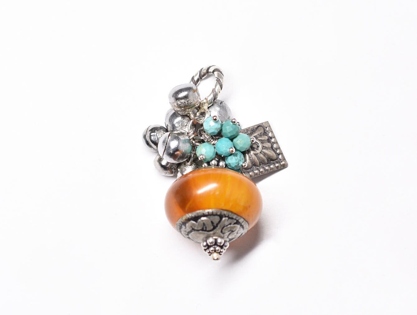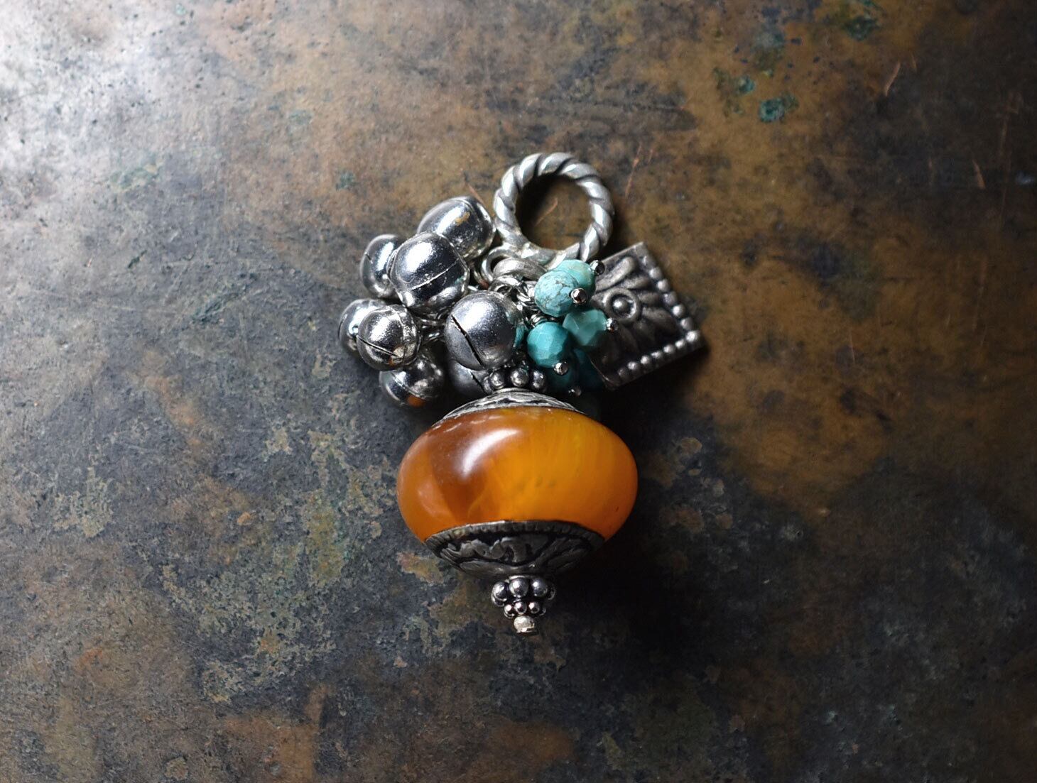 琥珀色インドラダックビーズとたわわな鈴、グリーンターコイズ、アフガンメタルを繋いだペンダントトップです。