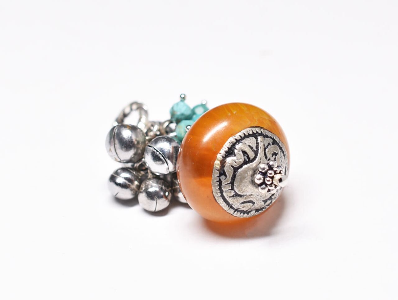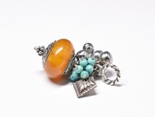 琥珀色インドラダックビーズとたわわな鈴、グリーンターコイズ、アフガンメタルのペンダントトップ