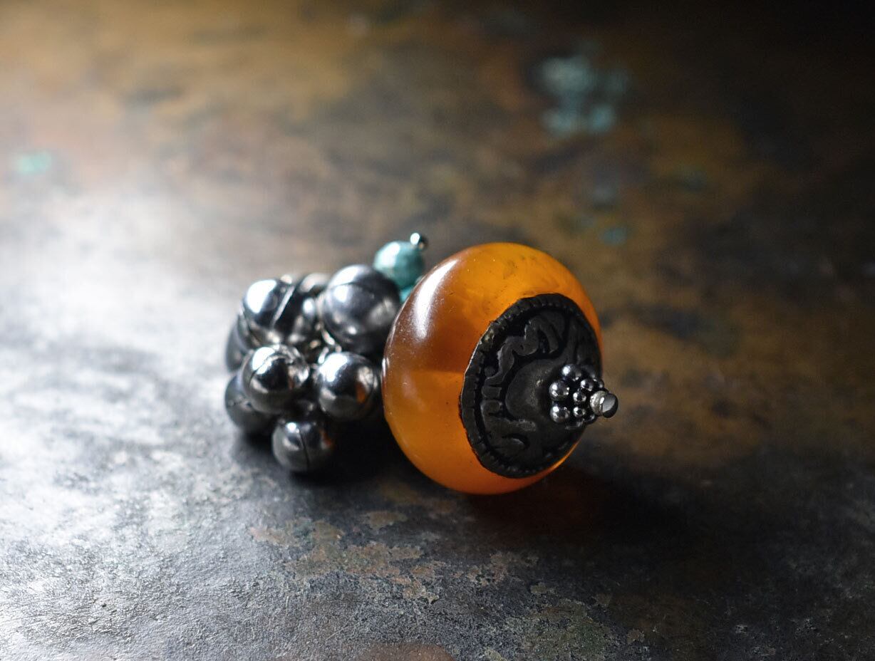 琥珀色のハードワックスにメタル装飾が施された大ぶりのビーズはインドのラダック地方から届いたものです。