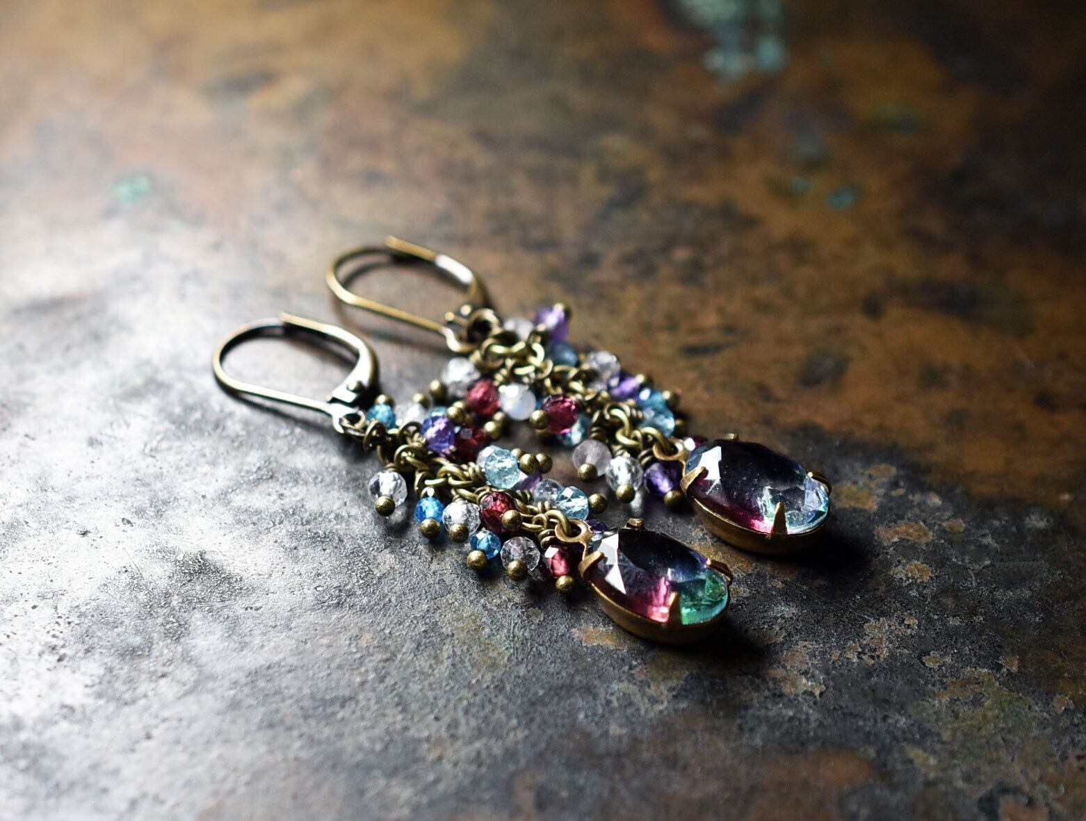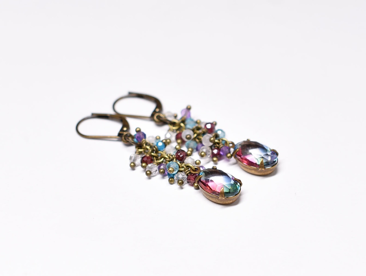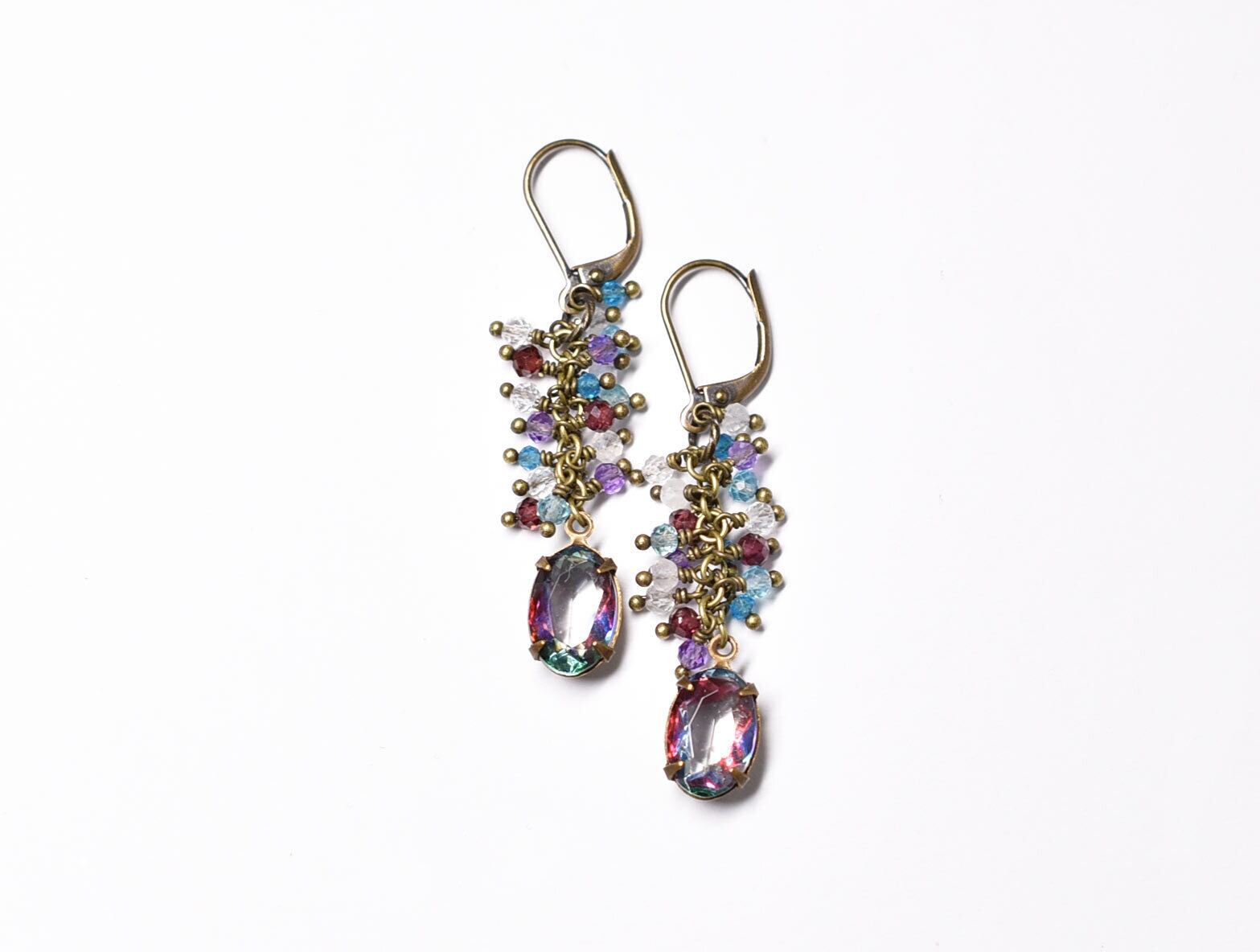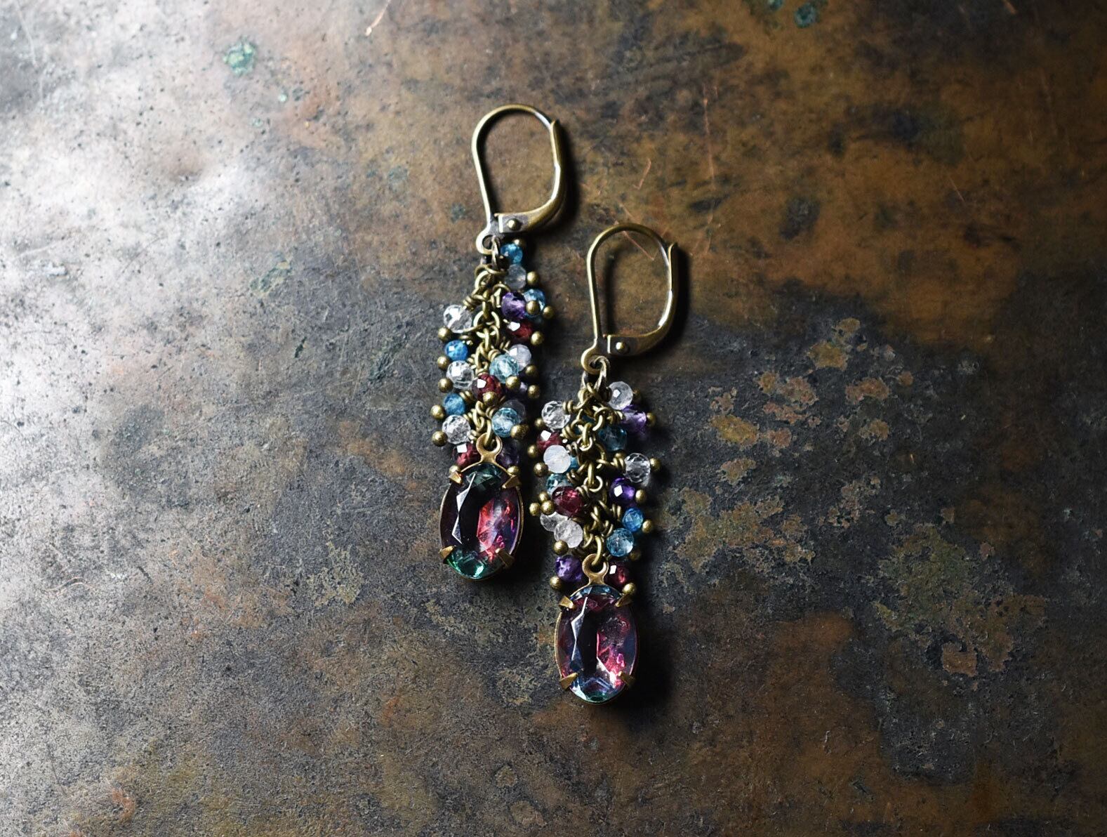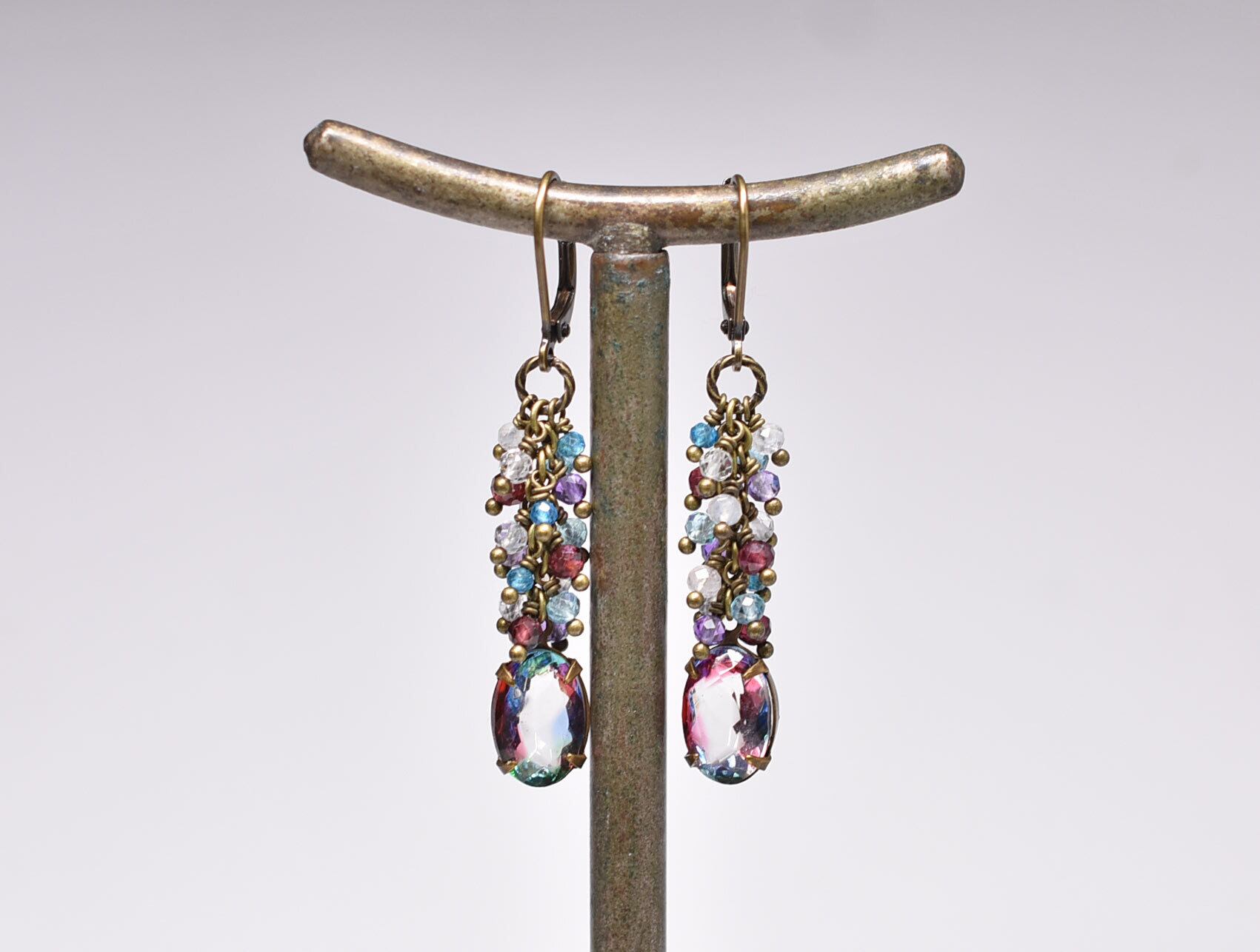 アンティークアイリスガラスとたわわなストーンビーズのピアス