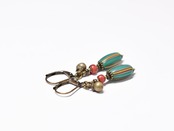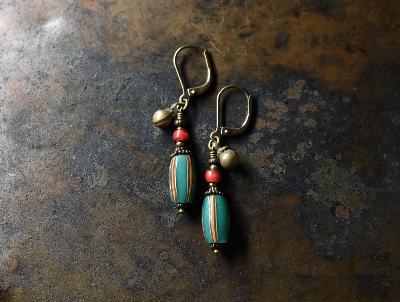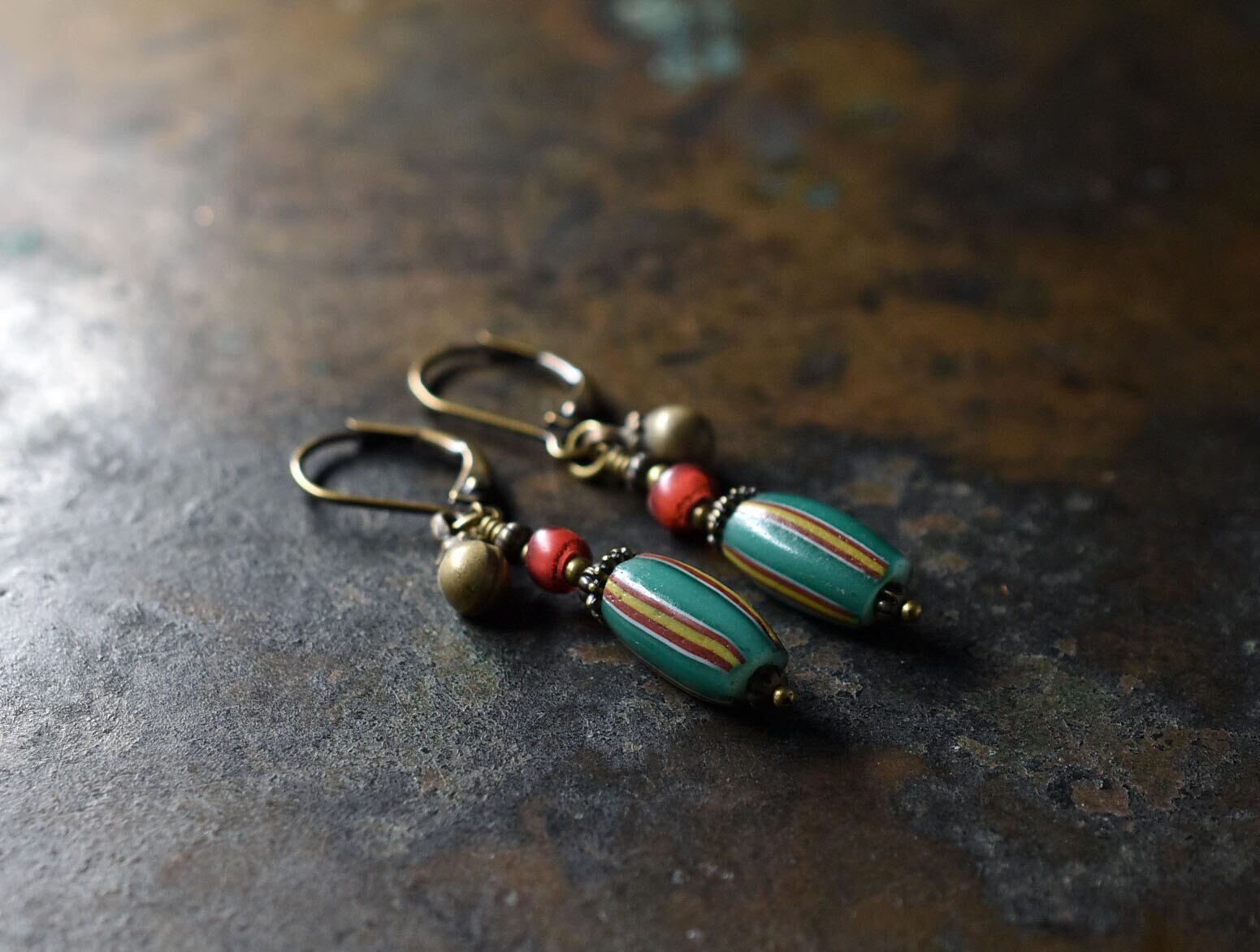 アンティークヴェネチアメロン玉と金赤ホワイトハーツ、民族鈴を繋いだピアスです。