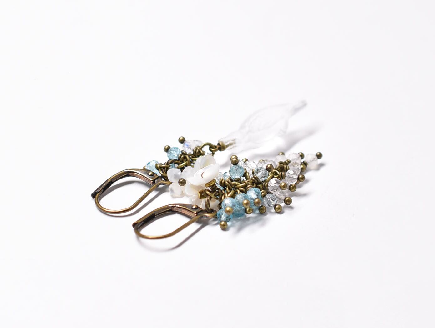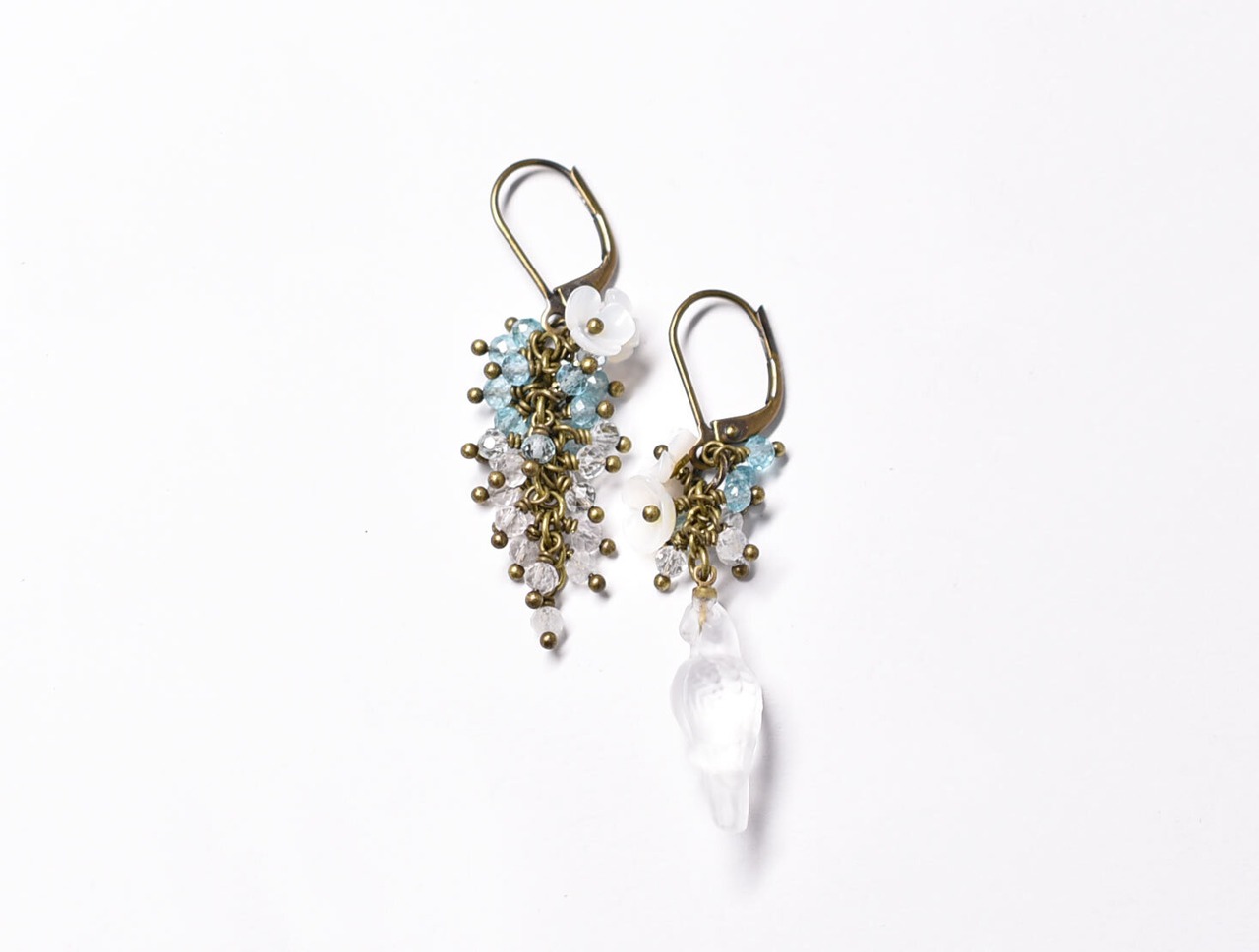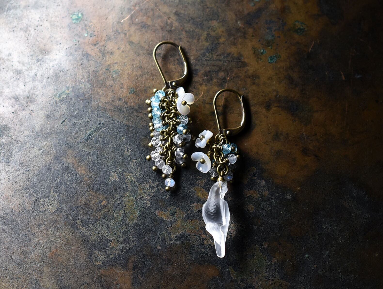 オーストリアヴィンテージ鳥ビーズとたわわなストーン、白蝶貝の小花のアンシメトリーピアス