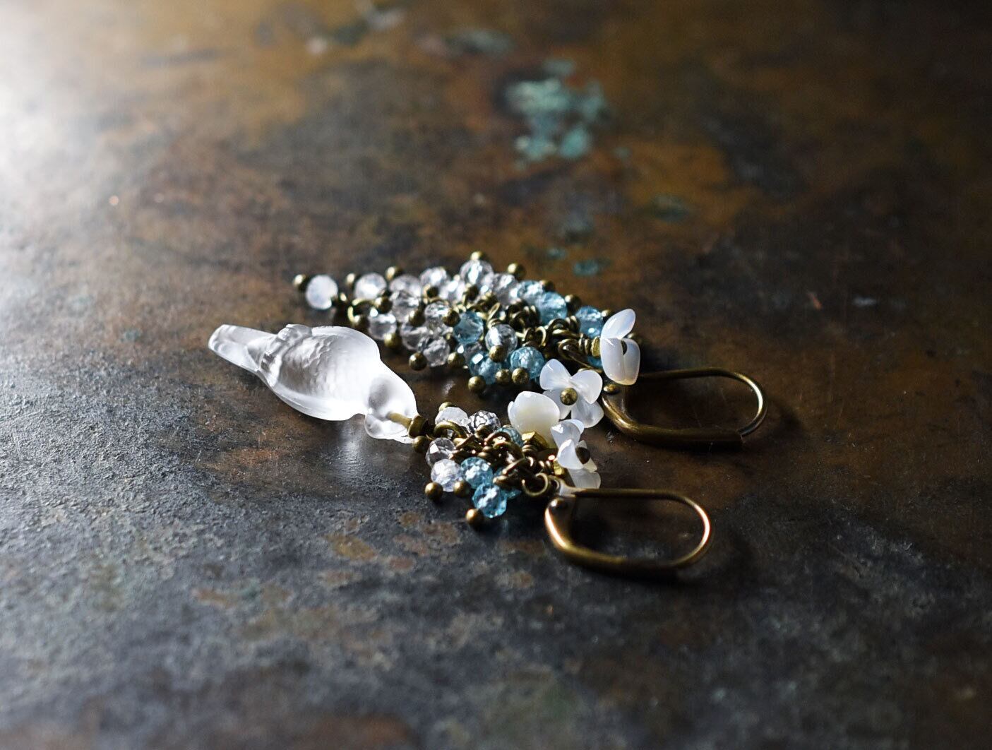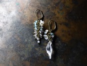 オーストリアヴィンテージ鳥ビーズとたわわなストーン、白蝶貝の小花を繋いだアンシメトリーなピアスです。